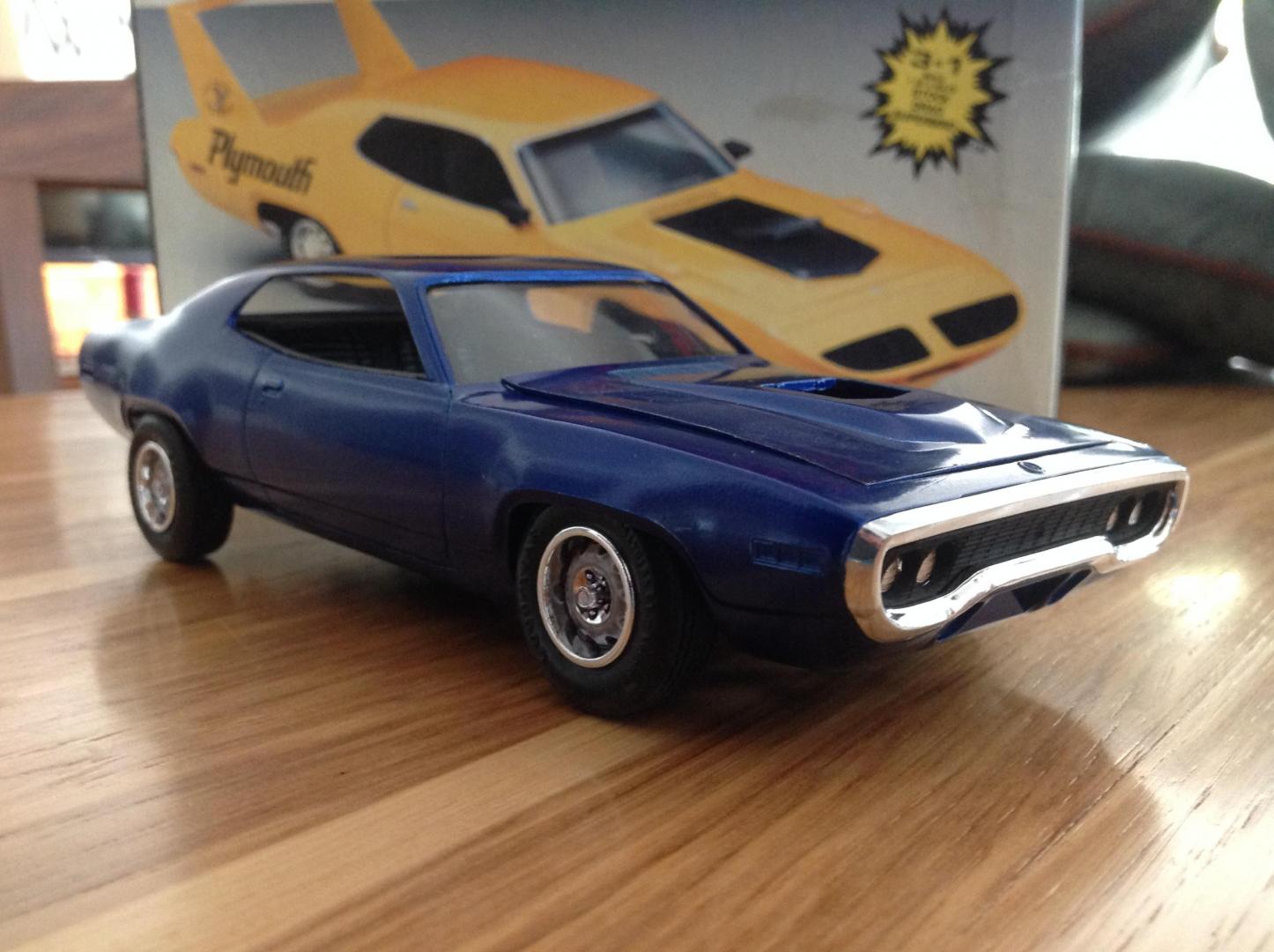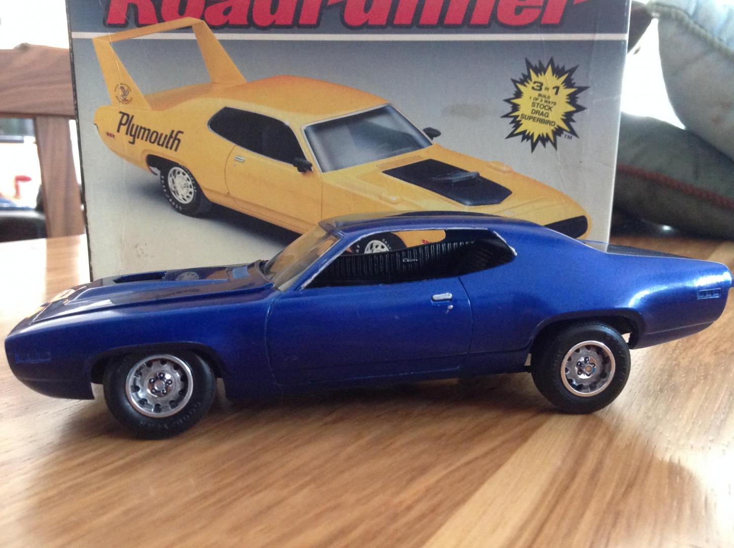 Just getting settled after moving last year. I picked up this kit I started a while back to knock the rust off and get something finished. It's the 1987 reissue of the Roadrunner kit. I picked this kit because it's the first model I remember my dad building when I was a kid, 40+ years ago I was disappointed then that he didn't use the Superbird parts ?. Dad's kit is long gone , but I'm building this one as an homage to that model that got me interested in this hobby. Dad usually just painted the body of a kit and then left everything else in bare plastic. The Roadrunner was metallic blue and he put this Roadrunner decal on the doors. Fortunately I found a set of original decals recently. I couldn't bear to leave anything in that nasty yellow plastic so I tried to keep it simple with a black interior and flat black chassis. It needs another coat of Tamiya blue, and I need to finish the engine, and pick out some details, but it's far enough along that I should be able to finish it up soon.