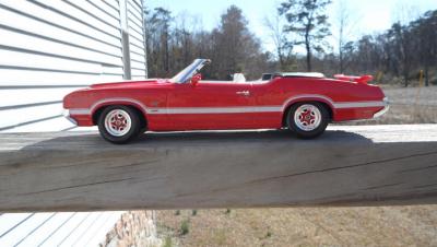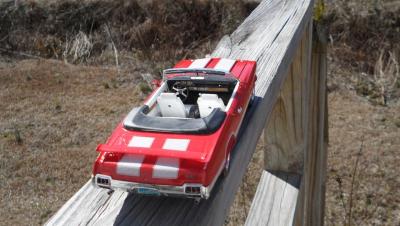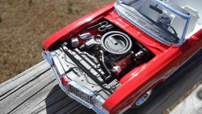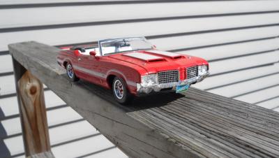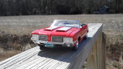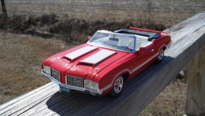 This is a 1969 Hurst Olds I finished awhile back. It started as an open eBay purchase that was fortunately complete. The only issue was that the decal sheet had been wetted then dried. It was built basically box stock with some minor mods. I did my trademark widened rear wheels and tires. The gold detail painting on the wheels was a challenge. I had to get the gold only on the spokes and not on the lugnuts, center caps or hole trim. They actually came out perfect. I was quite pleased. I removed the locator pegs from the tail light lenses and BMF'd the backs to make them more realistic. I added a Detail Master triple gauge set under dash to compliment the "His and Hers" Hurst shifter. I got the triple carbs and manifold from a 69 Olds 442 kit. The air cleaner element was painted with transparent aqua. The fit and finish of this kit was amazing for an AMT offering. It has been years since I had a body drop right onto a chassis perfectly without having to trim or tweak something. The bumpers actually fit perfectly as well. The only trouble I had was that the windows are barely bigger than the frame leaving very little overlap for gluing. The chassis is quite detailed including separate pieces for control arms, springs and shocks. The decals did require soaking about 5 times longer than usual to release from the backing paper but they held together well. I really wish I had a wired distributor to top off the engine. I highly recommend this kit as I had very little frustration building it. In fact this is the first model I have ever built where the steering actually WORKS!