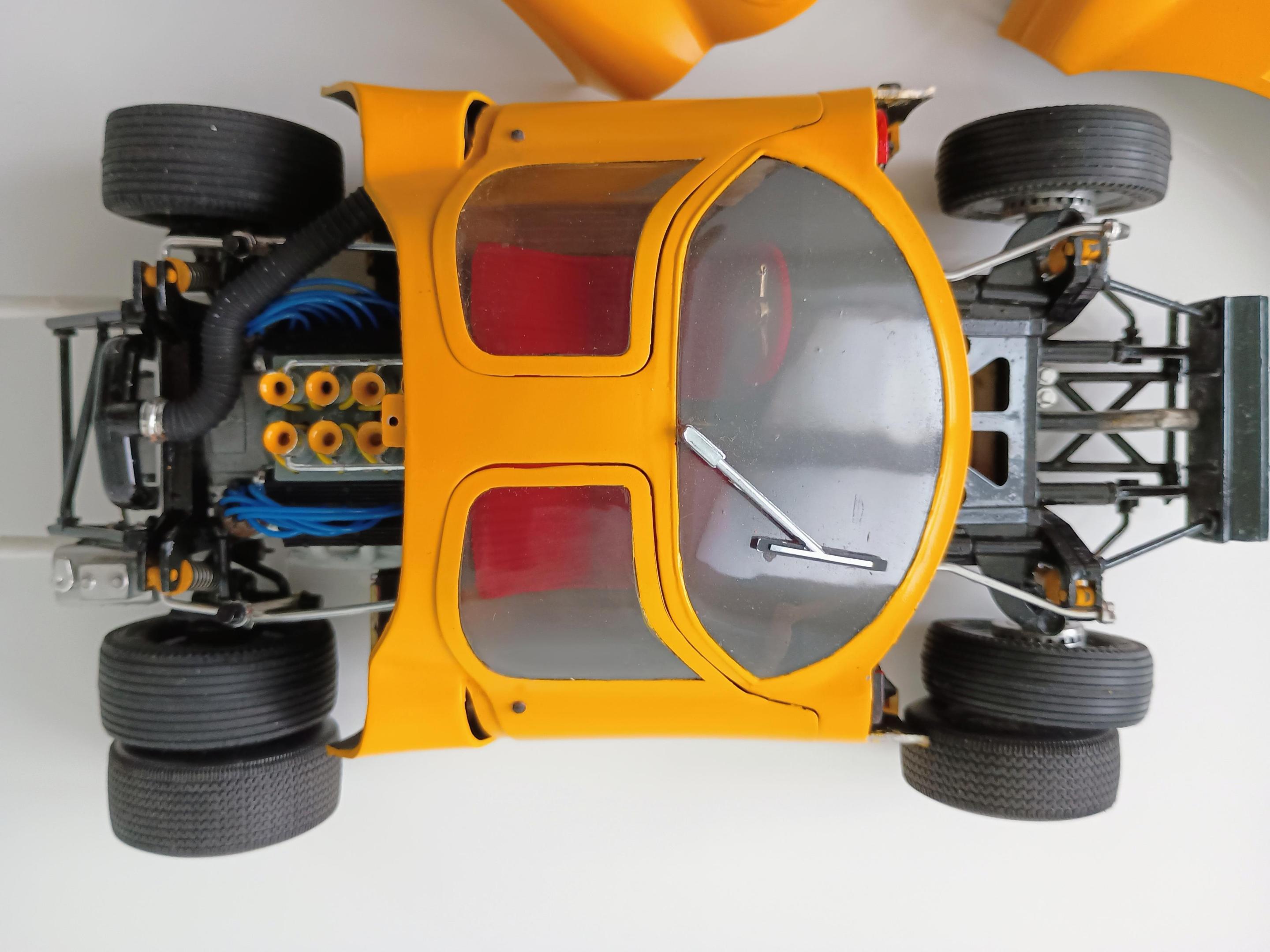 This is Otaki's 1/16 scale version of the Alfa Romeo 33. I have had this kit for quite awhile and recently did some of the bodywork mods and painted it. Color is Tamiya TS42 Gunmetal. Hood center is a combination of TS38 silver, Ts71 Smoke and TS13 gloss Black. This was all clear coated with Krylon latex clear. This is an interesting clear as it dries very hard but takes a long time to cure. I recently sanded and polished it out and once that was done it was the incentive to finish it. And interesting and now rare early Japanese kit that had many features I enjoy. These include all oipening doors, engine cover and front bodywork, working steering and suspension and working head and tail lights. Kit was also motorized and the motor was well hidden and allowed some good detail on the engine. more details in the picture captions. Thanks for looking and comments welcome. Chassis ready for the completed bodywork. I re-engineered the cockpit sides, removing them from the chassis and attaching them to the upper bodywork. This allowed me to fill the seam in for a smoother body. Engine was quite detailed for a motorized kit. The motor is in front of the dash and is connected to the gearbox with a long shaft. I added fuel lines and ignition wiring. The tail pipe ends are chrome tubing from a radio antenna. Yes, the suspension works and the motor runs. Front end aslo had some good detail and was fairly true to the real car. It all fit and works quite nicely. Interior was fairly well detailed. Interesting placement of the gear shift. Seatbelts came from the spares. Carpet is red flocking over flat red paint. Color is Tamiya LS79 flat red. Finished car on its wheels. Can't say I was too happy with the tires and wheels in this kit. If I ever find a replacement they are removable. I replaced the grain-of-wheat bulbs with LED's. Much better. The bodywork fit quite well, especially the doors. Rear veiw with the passenger door open and tail lights on. The body actually fits tighter than this photo. Moving it around for the pictures loosened them up. I like the stance of this car and no adjustment was necessary. A cool kit and a nice addition to my Alfa collection. Thanks for looking.