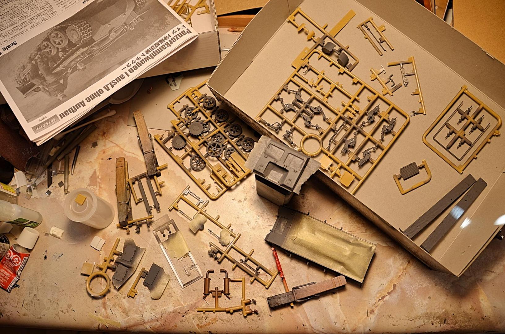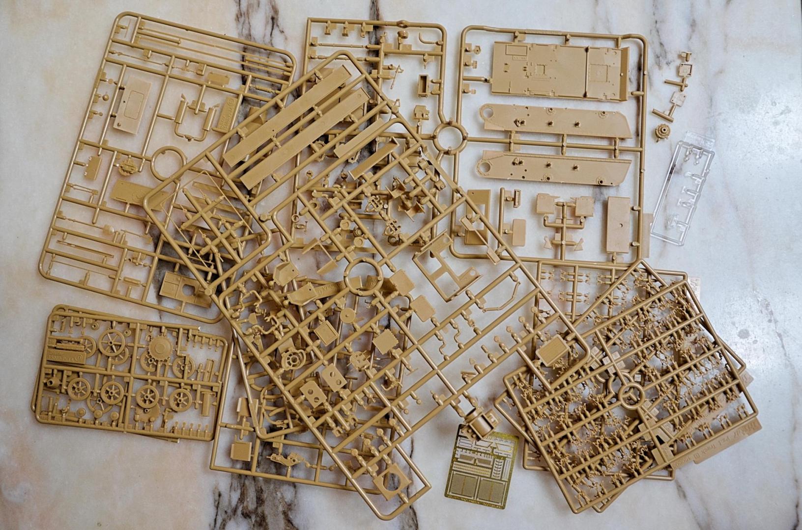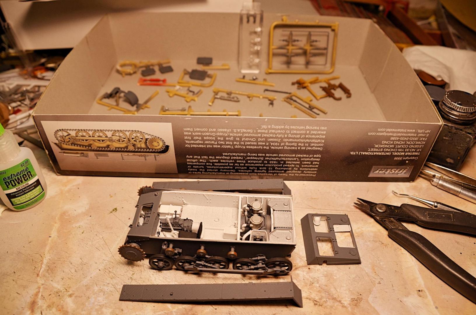 I call it the Panzer 1.0, the very first version without a turret or armament because of restrictions set after WW1. I built Bandai 1/48 military models when I was growing up, mostly German, really liked having interior and engine detail. When I got into 1/35 Tamiya kits, was disappointed there was no interior at all, felt ripped off. Fast forward about 45 years, so many interesting subjects being produced by numerous companies, in this case Tristar is the brand. The sophistication of the mold process is amazing, several parts have a third axis. Teeny tiny parts, almost no mold lines, zero flash. Includes photo-etch. And to drive you insane, individual track links, for the whole track (some kits have the flat sections as one part). I have been wanting to build a tank, so picked this because it had been started, there are extra parts such as the turret that I added to the Maus that I built in 2016. I've always been fascinated how the evolution of tank size grew during the war, the Maus turret is bigger than the Pz1 and could weigh 20 times more. The number of parts is ridiculous. Check out the engine block, with the third axis mold technique. Some parts are not used, will be handy for scratch-building. The three trees lower right are the track links. I skipped around the instructions, glued together sub-assemblies before painting. There was the option of two colors for the interior, grey or white. I understand everything was one color, but I wanted the engine/transmission to contrast. The flat four air-cooled engine, and transmission, have detail on the bottom that won't be seen. I masked, then airbrushed more grey. Because I don't like brush painting unless it beats crazy masking, I do things like the fire extinguisher. Most parts installed inside. Some parts were a tight fit, didn't need gluing. There are many parts that get hidden, the engine has a beautiful fan inside the air shroud, two pumps or distributors, that are under the oil cooler. Going to allow the engine deck to be removed, could glue hatches open, or really go nuts and use photo-etch hinges but then it wouldn't be Box Stock. Got the bogey wheel/suspension done. I did hand paint the tires, easy to spin on a sprue. ? I cut the sprue trees to reduce clutter (looking at my bench is another story ?) Getting the fenders and tools on will be a cinch. The tracks... ?