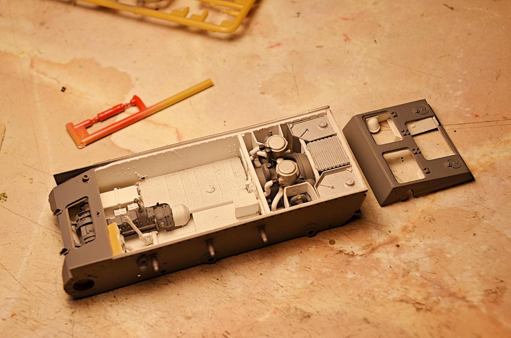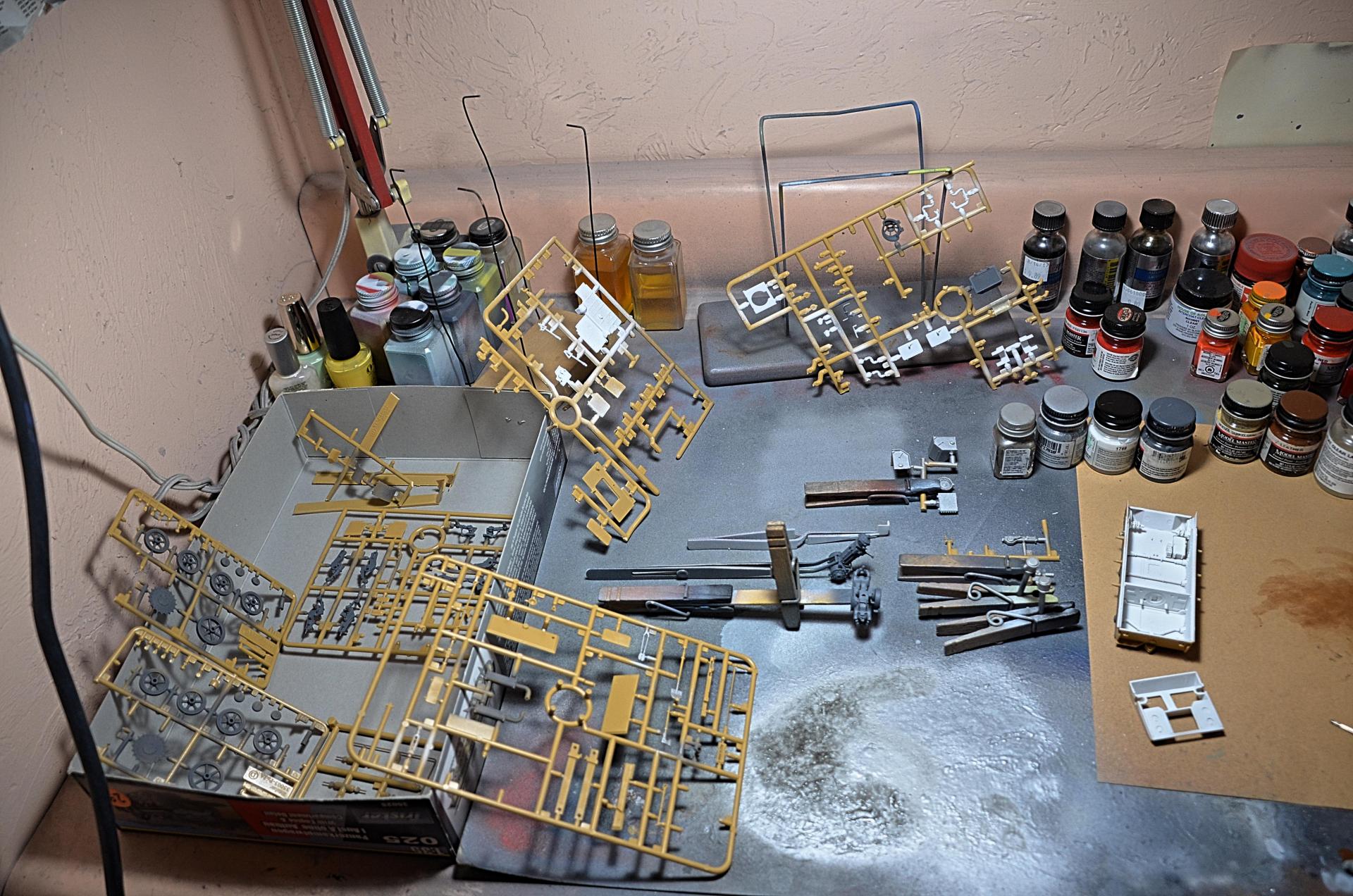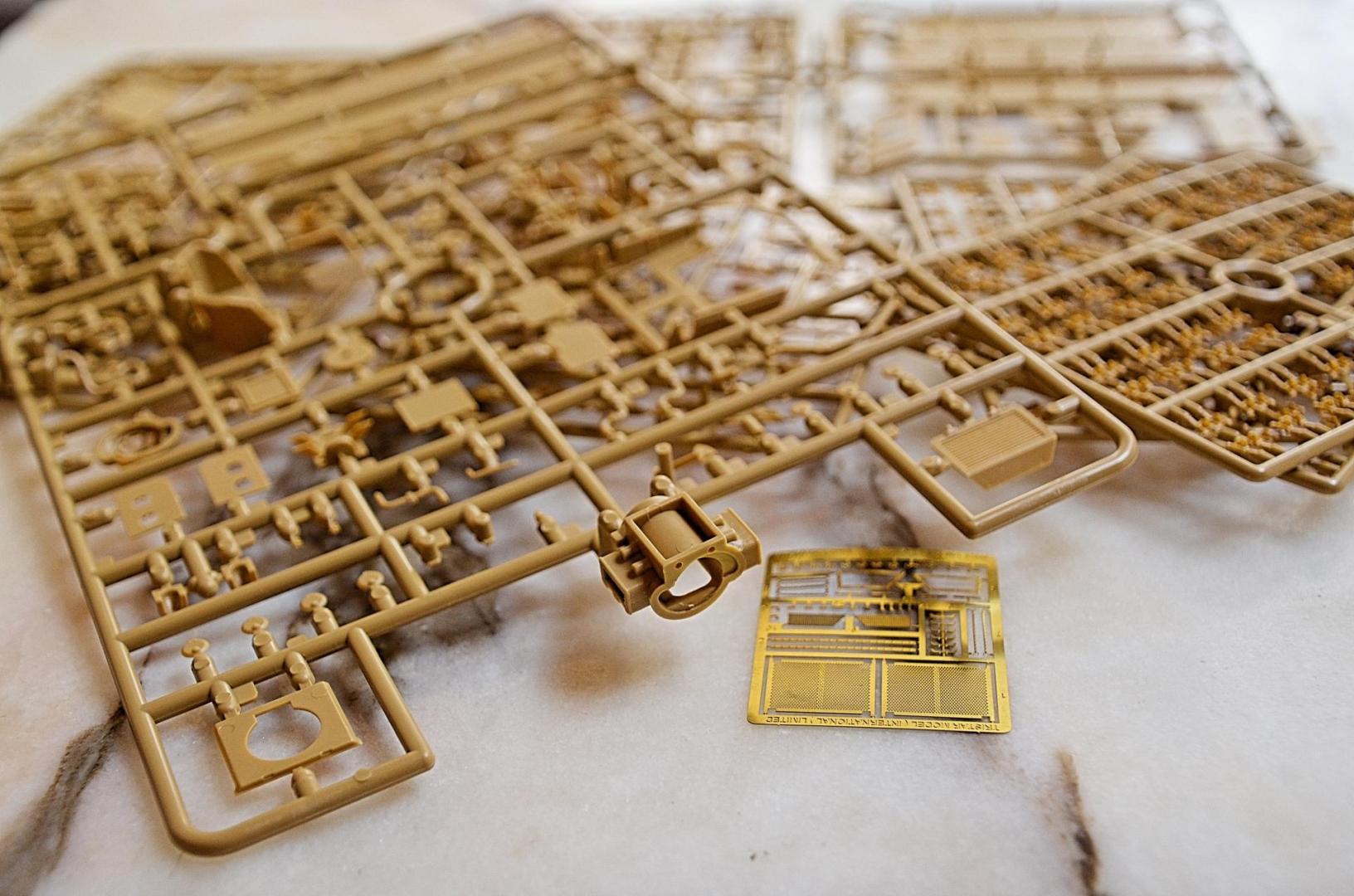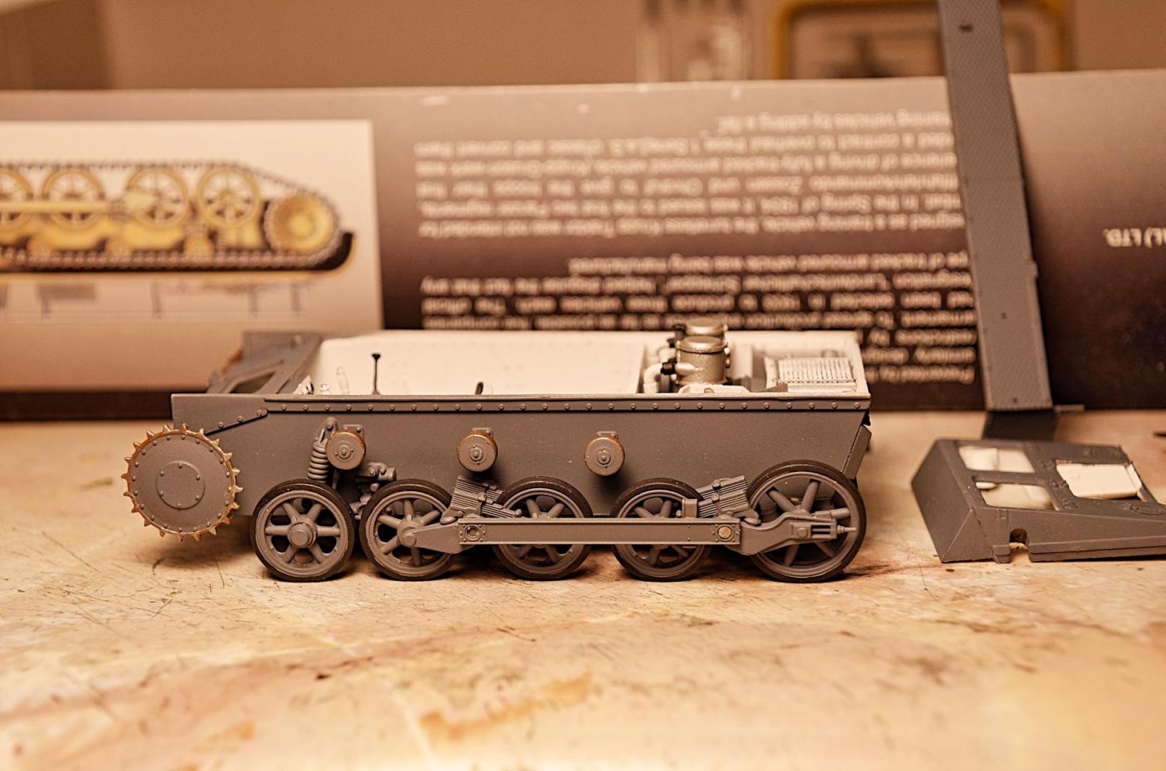 I call it the Panzer 1.0, the very first version without a turret or armament because of restrictions set after WW1. I built Bandai 1/48 military models when I was growing up, mostly German, really liked having interior and engine detail. When I got into 1/35 Tamiya kits, was disappointed there was no interior at all, felt ripped off. Fast forward about 45 years, so many interesting subjects being produced by numerous companies, in this case Tristar is the brand. The sophistication of the mold process is amazing, several parts have a third axis. Teeny tiny parts, almost no mold lines, zero flash. Includes photo-etch. And to drive you insane, individual track links, for the whole track (some kits have the flat sections as one part). I have been wanting to build a tank, so picked this because it had been started, there are extra parts such as the turret that I added to the Maus that I built in 2016. I've always been fascinated how the evolution of tank size grew during the war, the Maus turret is bigger than the Pz1 and could weigh 20 times more. The number of parts is ridiculous. Check out the engine block, with the third axis mold technique. Some parts are not used, will be handy for scratch-building. The three trees lower right are the track links. I skipped around the instructions, glued together sub-assemblies before painting. There was the option of two colors for the interior, grey or white. I understand everything was one color, but I wanted the engine/transmission to contrast. The flat four air-cooled engine, and transmission, have detail on the bottom that won't be seen. I masked, then airbrushed more grey. Because I don't like brush painting unless it beats crazy masking, I do things like the fire extinguisher. Most parts installed inside. Some parts were a tight fit, didn't need gluing. There are many parts that get hidden, the engine has a beautiful fan inside the air shroud, two pumps or distributors, that are under the oil cooler. Going to allow the engine deck to be removed, could glue hatches open, or really go nuts and use photo-etch hinges but then it wouldn't be Box Stock. Got the bogey wheel/suspension done. I did hand paint the tires, easy to spin on a sprue. ? I cut the sprue trees to reduce clutter (looking at my bench is another story ?) Getting the fenders and tools on will be a cinch. The tracks... ?