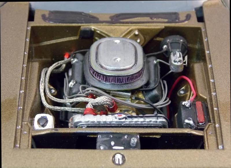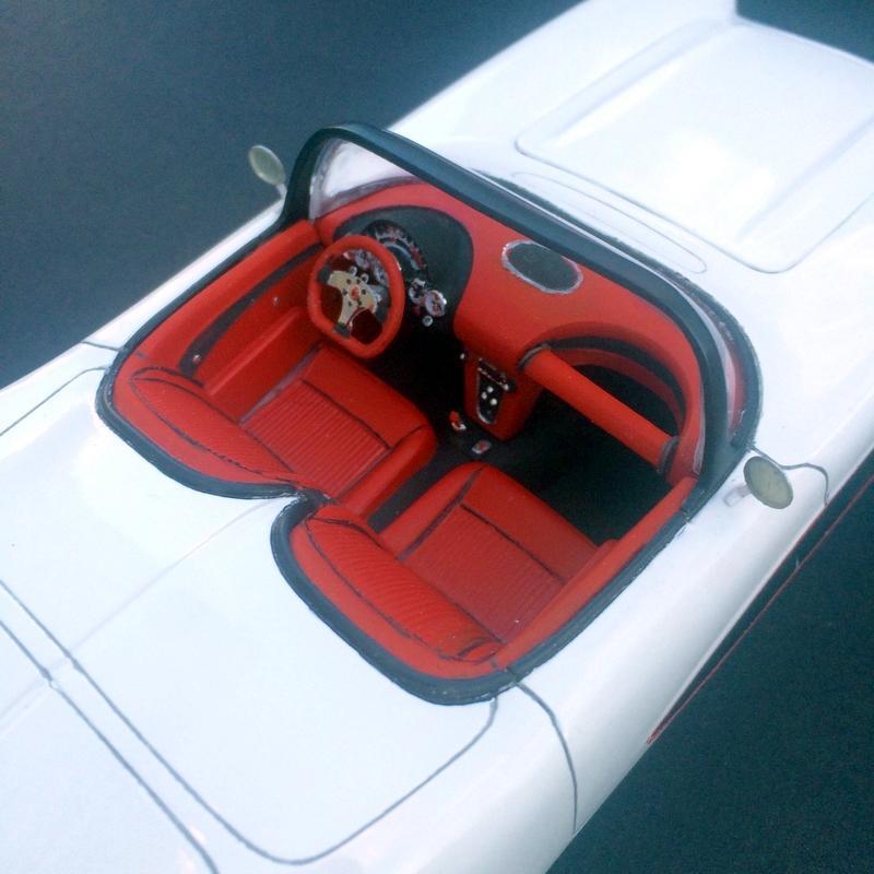 Hi! I was always a fan of the sleek british sports-cars. They were more "raw", devoid of all the trinkets that Detroit was sticking to its performance cars of the day. Whatever. What if we were to give the nice Revell of Germany XK 120 a "shave", and install the blown Hemi that came as the alternate configuration in the latest reissue of the Cosmic Charger dragster? The long nose of the Jag could engulf all of it, and then some. Pegasus wheels, ultra-thin acetate "floating" windshield, and soft colors (Tamya's acrylics, custom mixed.) The chassis is scratchbuilt for the rear and center platform, and OEM in the front. Custom console and seats + shifter & hand brake lever. Scratchbuilt flush headlights, integrating the flashers bulbs. Wired & plumbed. Outside of my usual comfort zone, obviously. Hours of fun with styrene! CT
