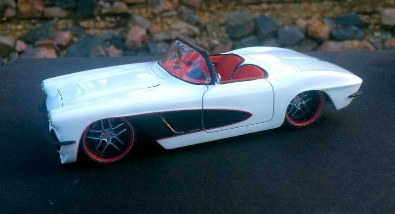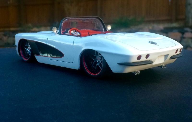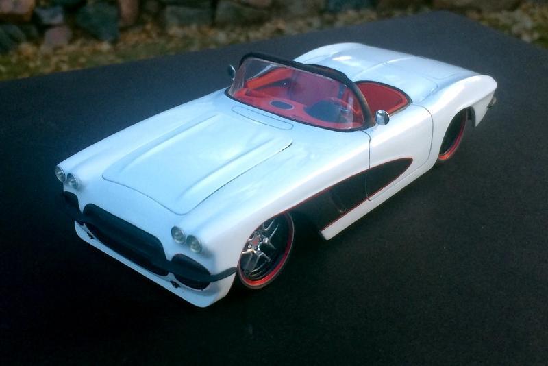 Started with the AMT Boyd Coddington kit. Not a great kit by any run, bought it a a less expensive alternative to the newer Revell 1962 Corvette, which I ended up buying to build it in a different style. So this AMT kit got built like this after seeing a rendering of it. Body mods: Molded in custom from air-dam. Shaved chrome detail off the top of both front fenders. Paint: Duplicolor Artic White with lots of Wet Look Clear polished. Note fine red pinstripe around cove and front wheel. Engine: Corvette ZR1 C4 Wheels: from a C5 Z06 inserted into Pegasus aluminum sleeves