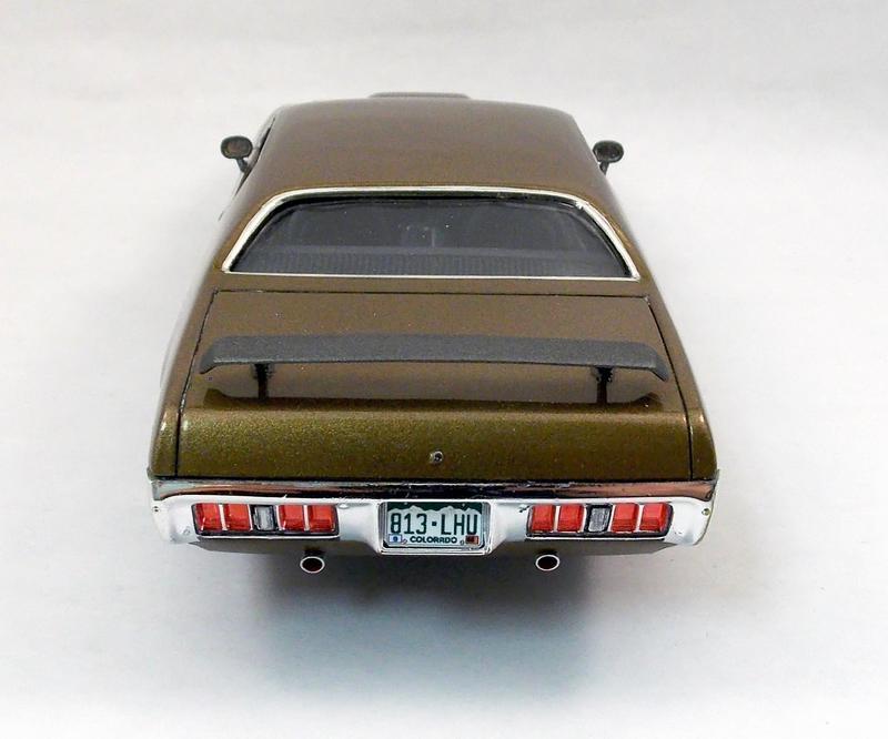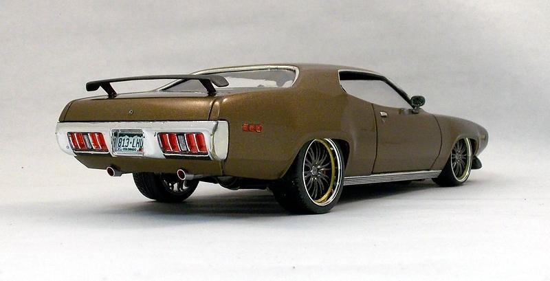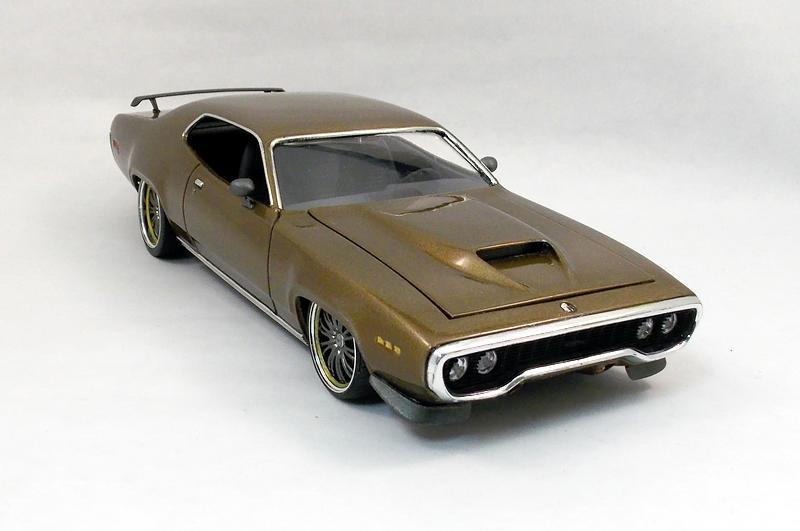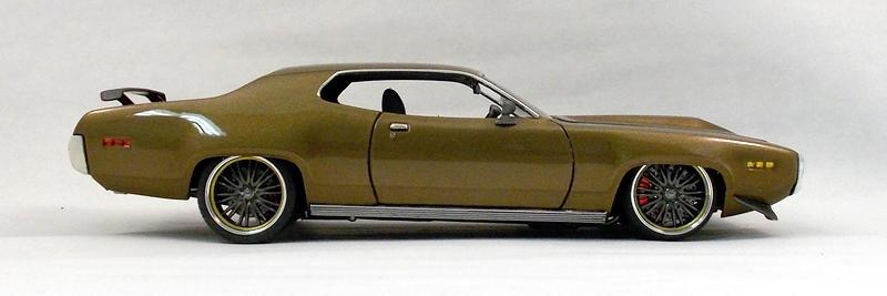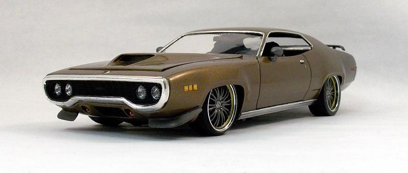 Monogram 71 Plymouth GTX kit is a very good kit, minimal flash, and everything fit perfect. This was a bucket-list build for many years and finally built one. Paint is Testor One Coat Lacquer Bronze with lots of hand polished Wet Look Clear. Wheels are Pegasus I staggered the rears and used a smaller diameter front tire. AAR hood is a resin piece with PE screen, changes the look on this one from a stock GTX. A little detailing, did the hood lift spring with fine wire. The air-filter is being redone with some PE screen over the K&N painted lines I've always liked the raked look of the 70-80 cars