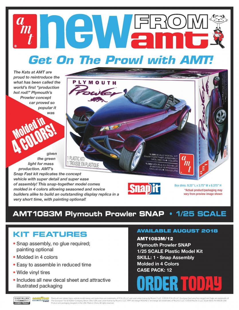 Here’s my build of the AMT/ERTL Plymouth Prowler with Trailer. Painted in Extreme Lacquer Purplelicious with Krylon matte gray interior and top. Fit and finish on this kit was tricky: the headlight pods don’t fit in the body with the chrome inner headlight buckets mounted, the front suspension is incredibly fragile, and the rear tires don’t fit in the wheel wells. I had to crudely grind out the chassis and remove the rear sway bar and upper dual shocks to get the wheels in. I managed to get it together and looking ok. At final assembly, I realized that I assembled one of the front wheels with the tire tread backwards. This kit has those hard solid rubber tires that you have to assemble the rim halves around, so no chance of fixing the tread direction. These Prowlers are such cool looking cars; it’s kind of a shame they were panned by enthusiasts since they were “only” v6 automatics (and wildly impractical). It’s shocking Chrysler even built these cars in the first place!