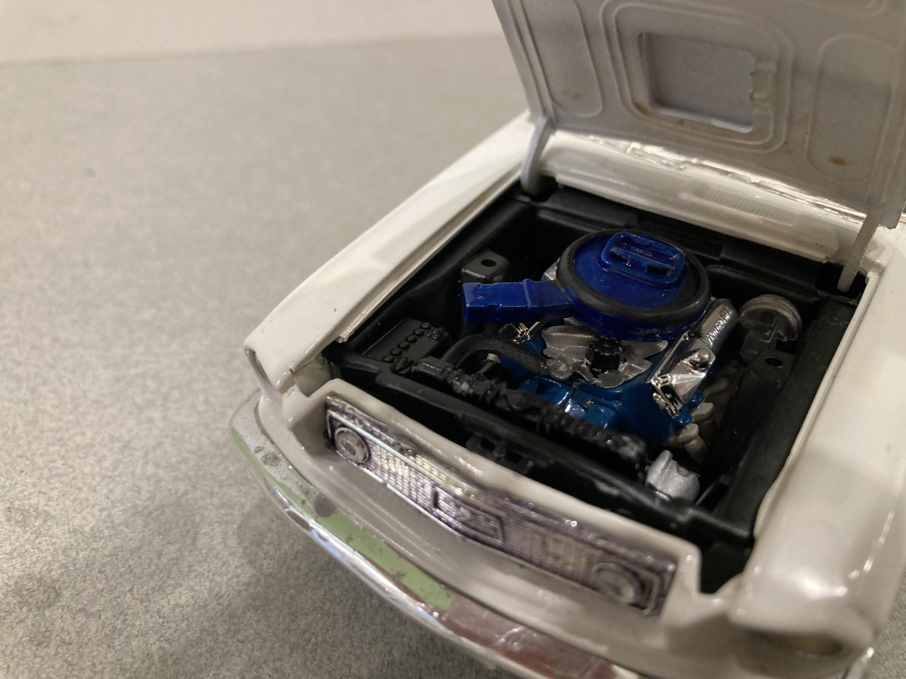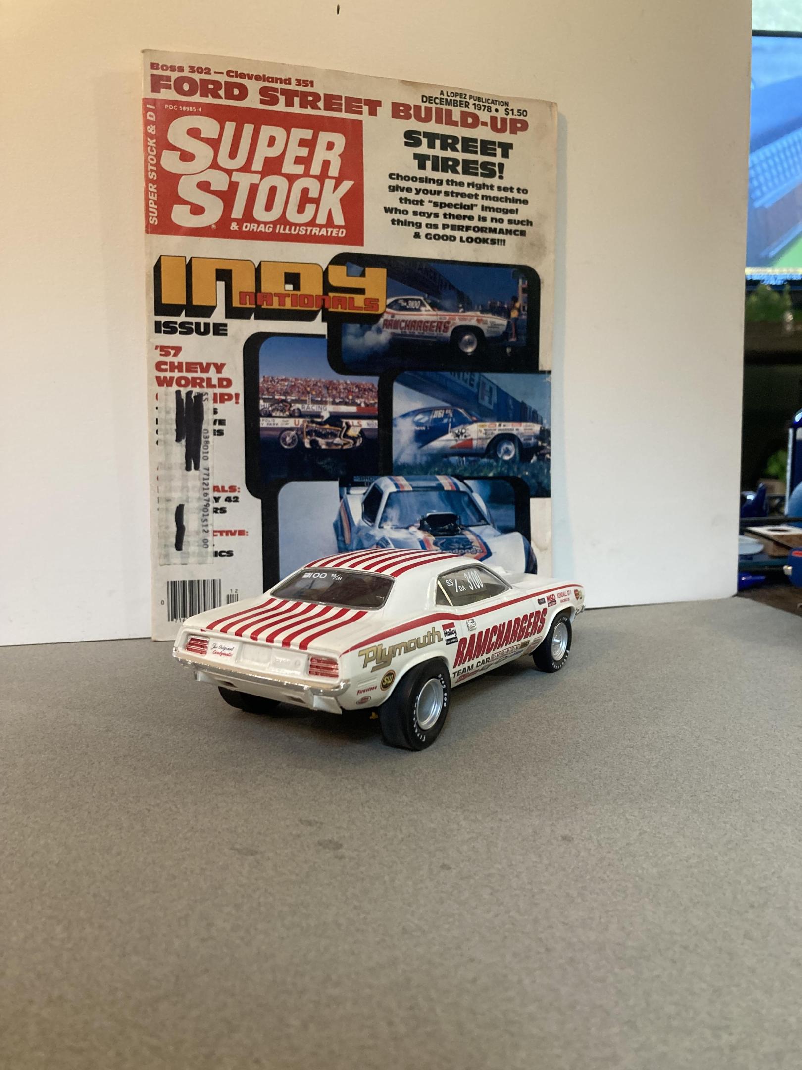 I built this out of the revell 1970 barracuda kit. I used amt wheels and slicks l crafted the headers from solder and aluminum tubing. It’s painted in testors white enamel with aftermarket decals. It’s a nice simple build. However I think the revell body is a bit on the chunky side with its dimensions. All in all it looks good on the shelf. Until next time thanks for looking ? , Mike