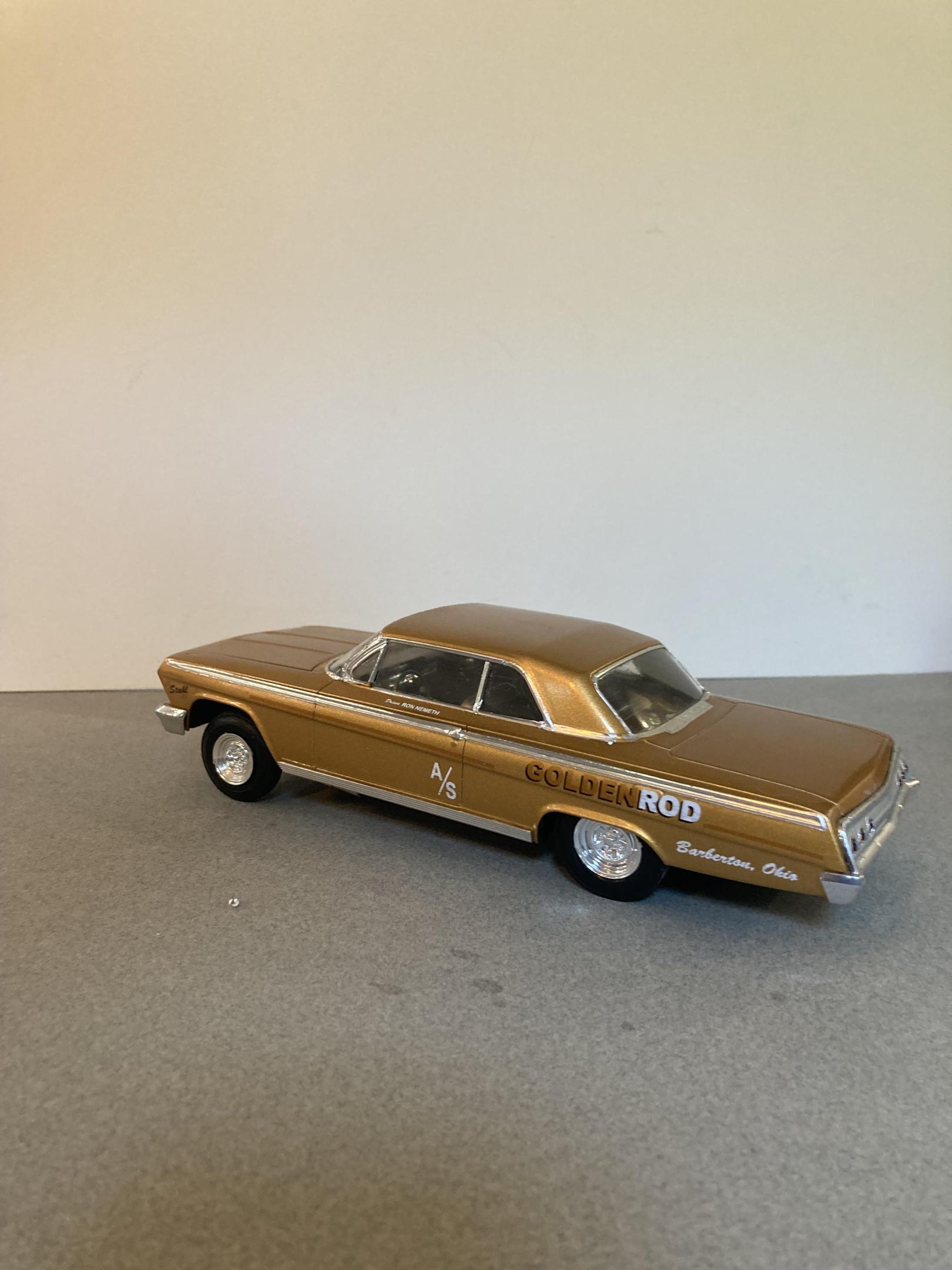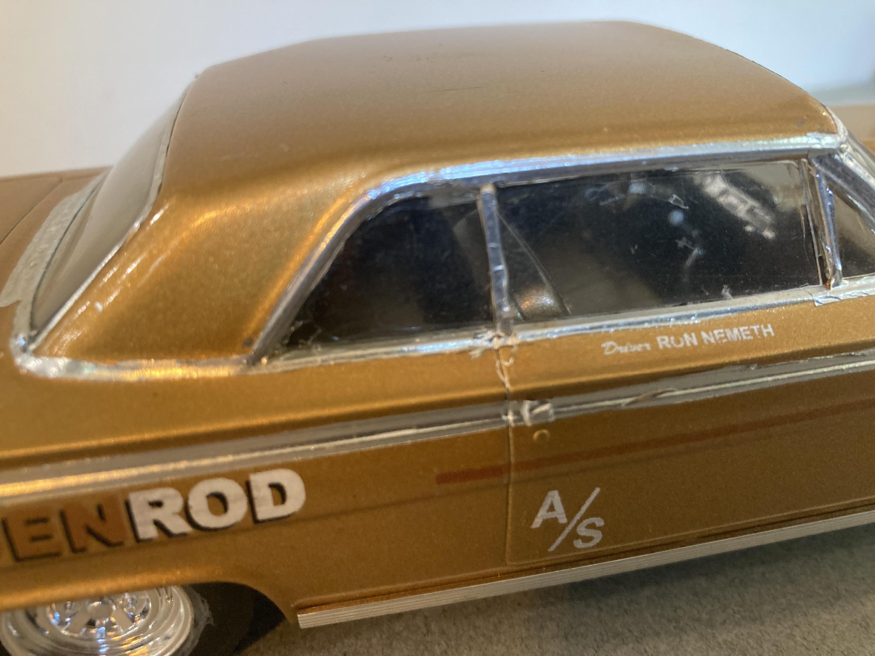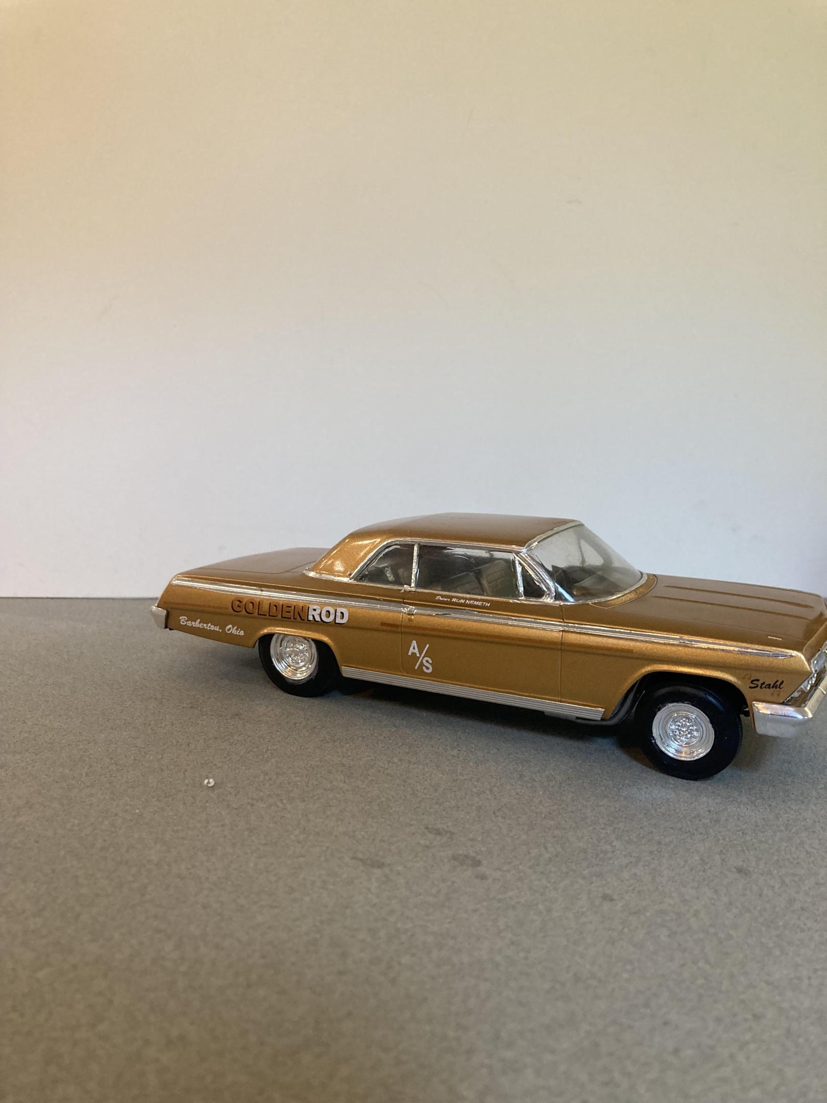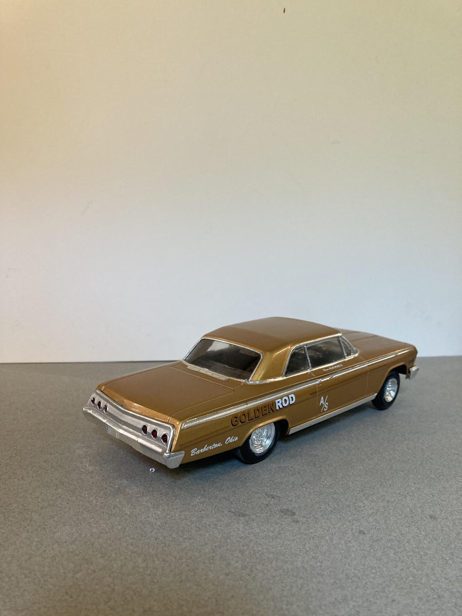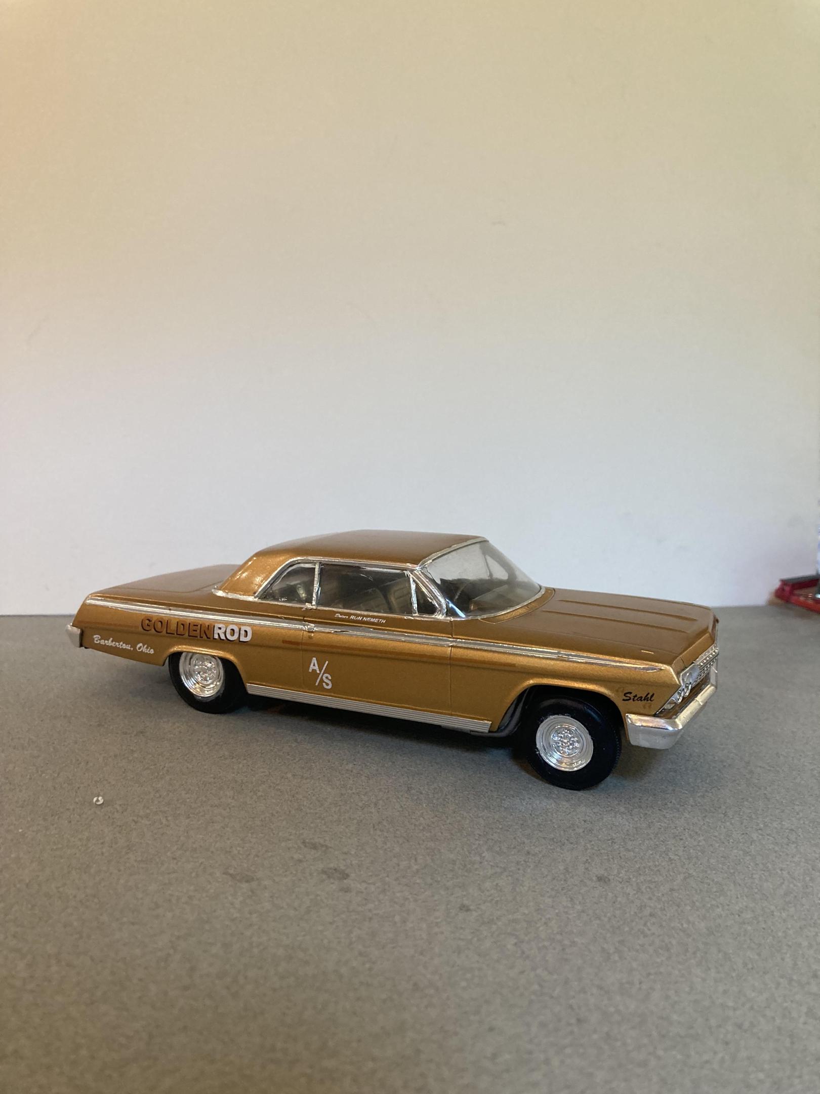 This is the revell 1962 impala kit which I converted to super stock trim by making a custom set of headers, and adding slicks. I also slightly modified the front suspension to give it a more aggressive stance. The decals came from mcw paint and resin which I believe are no longer available ? with decals you buy them when you see them as most are not mass produced. If they weren’t so expensive I would buy a second set just in case I screw up the first set.Until next time thanks for looking ?. Mike