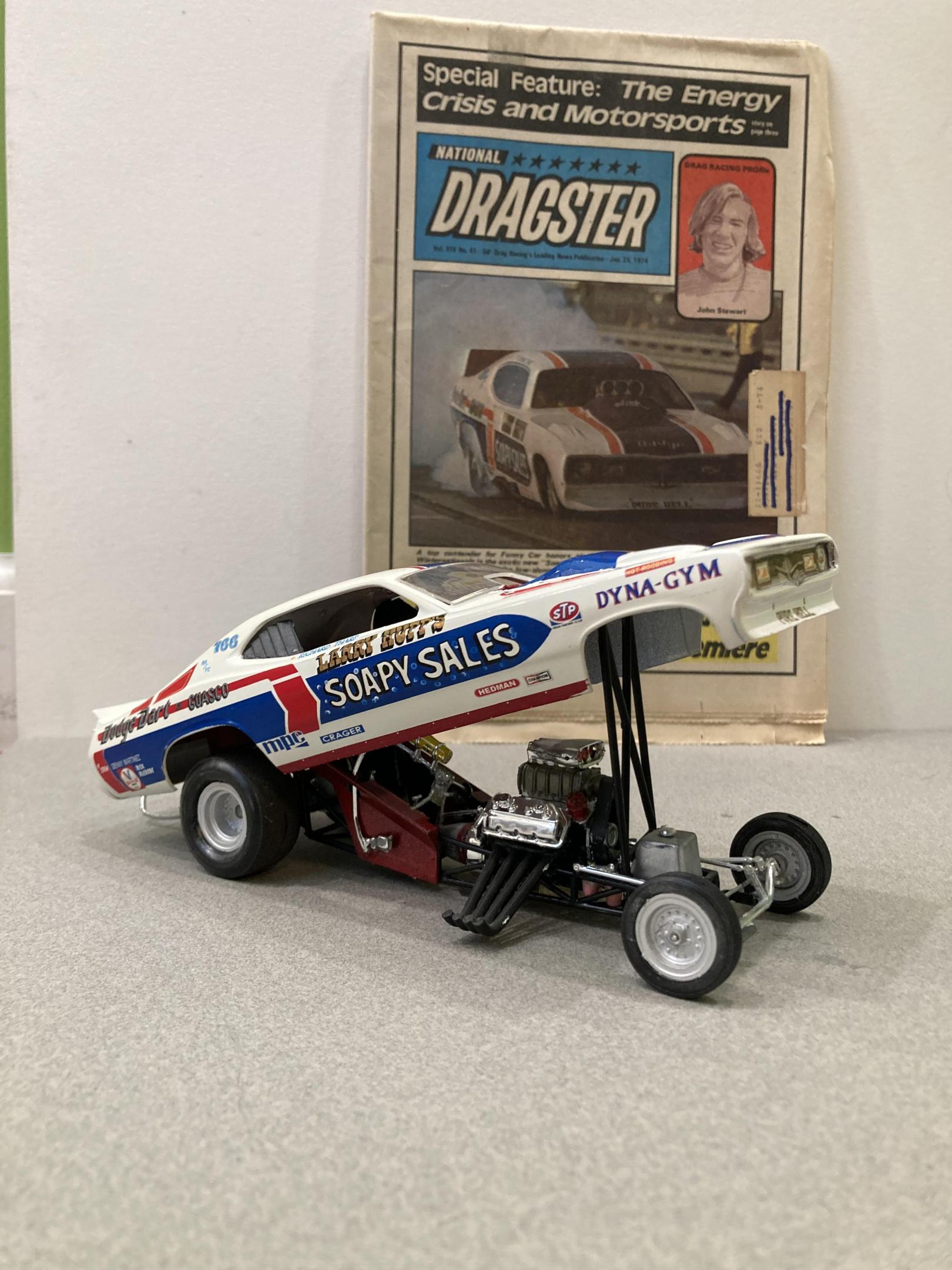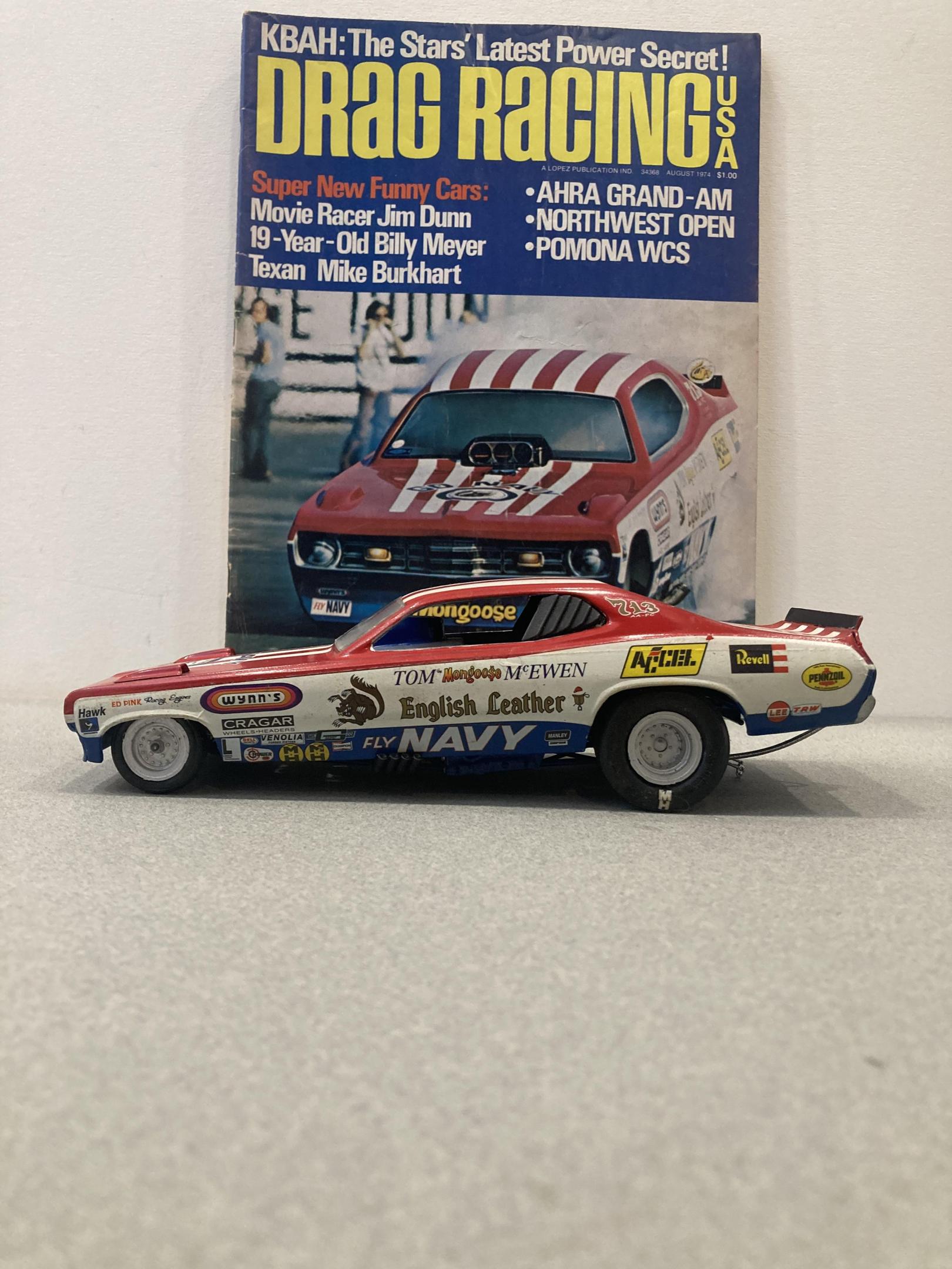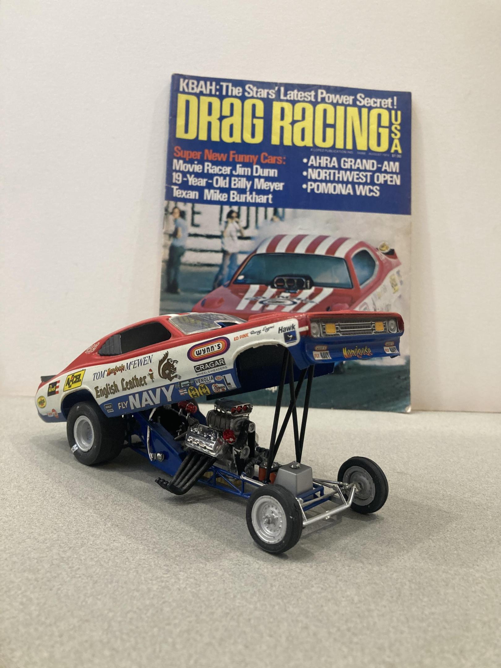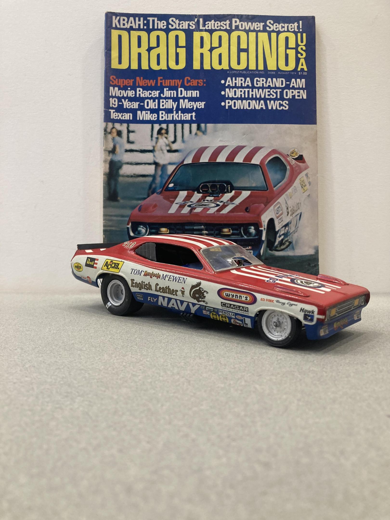I built this one from the revell duster Funny car I used the latest Mongoose issue. I moved the engine forward in the chassis, and hood bulge was cut out of the Don Schumacher Vega body , and grafted to the duster body. I also cut down the roll cage a little to get the body as low on the chassis as possible. The paint is Testors white with chuck Boener decals. Until next time thanks for looking. Mike