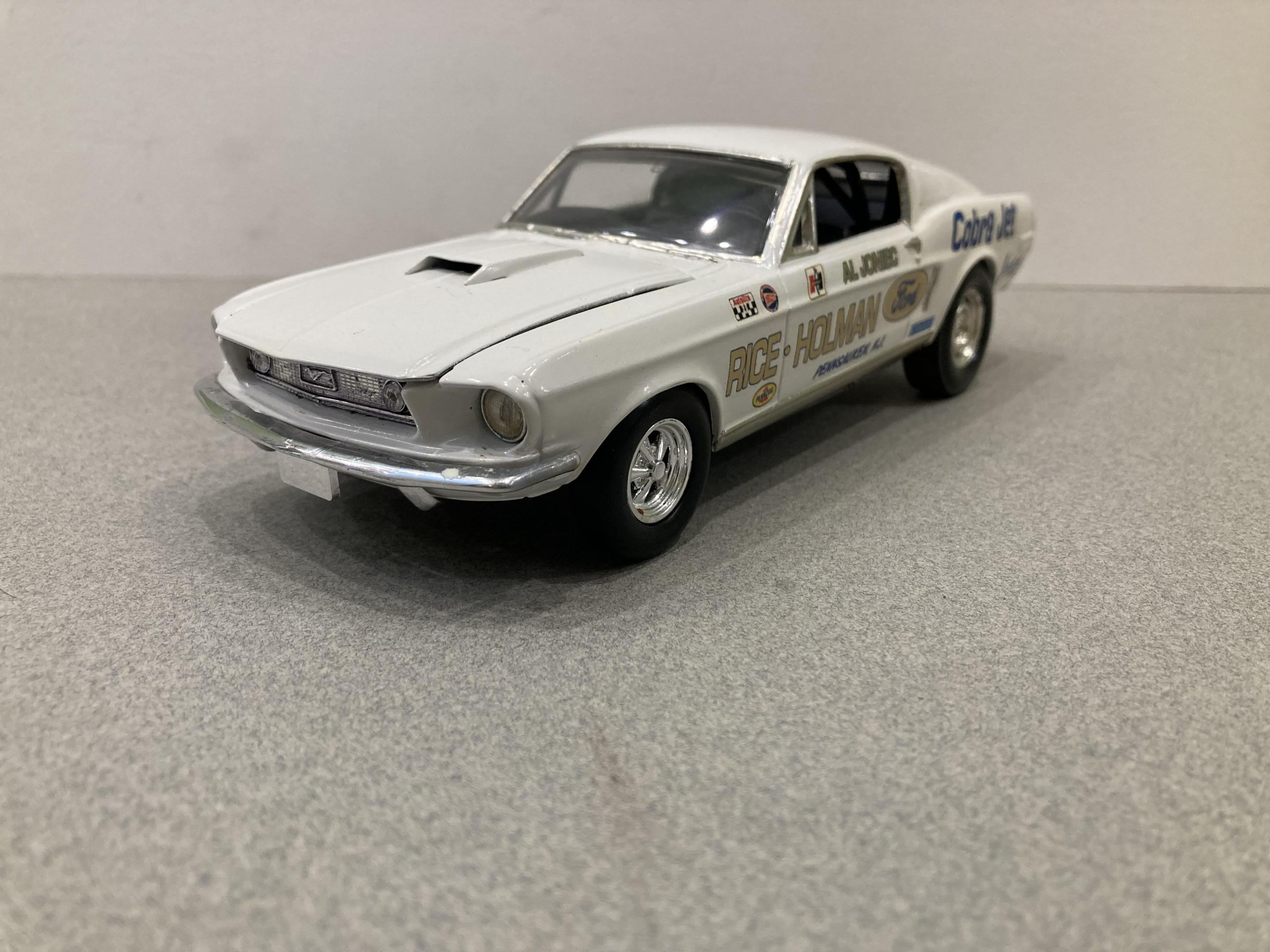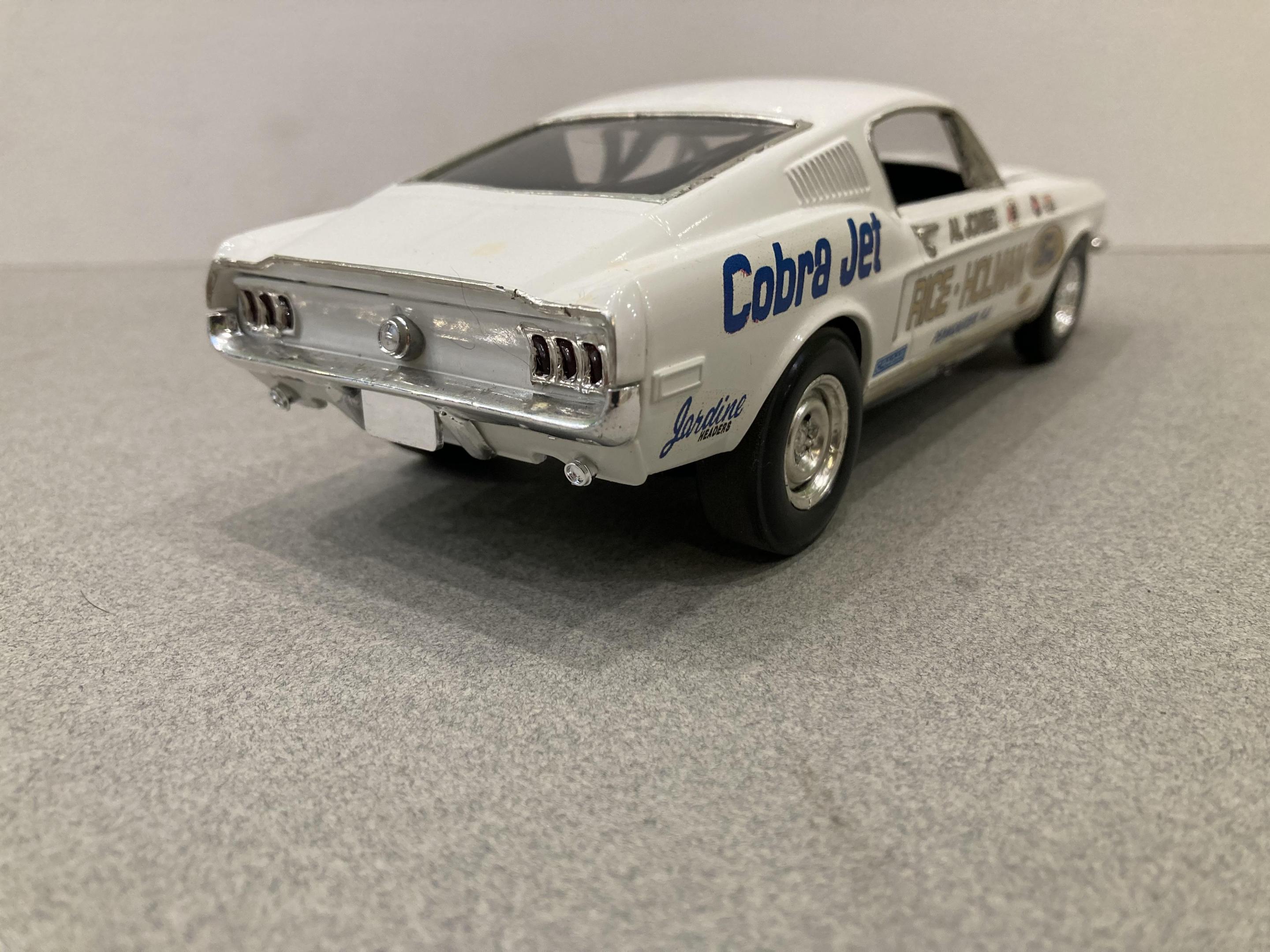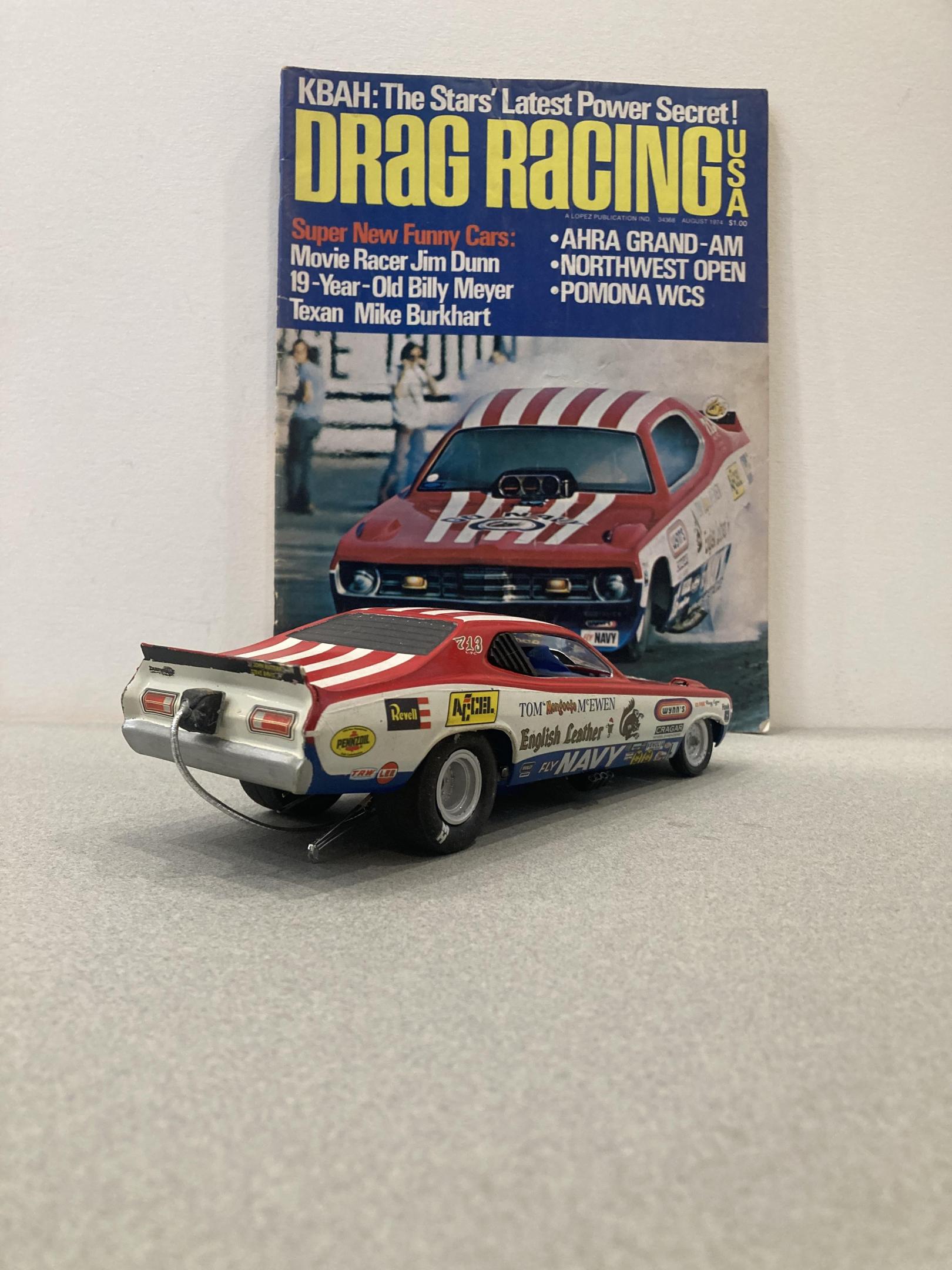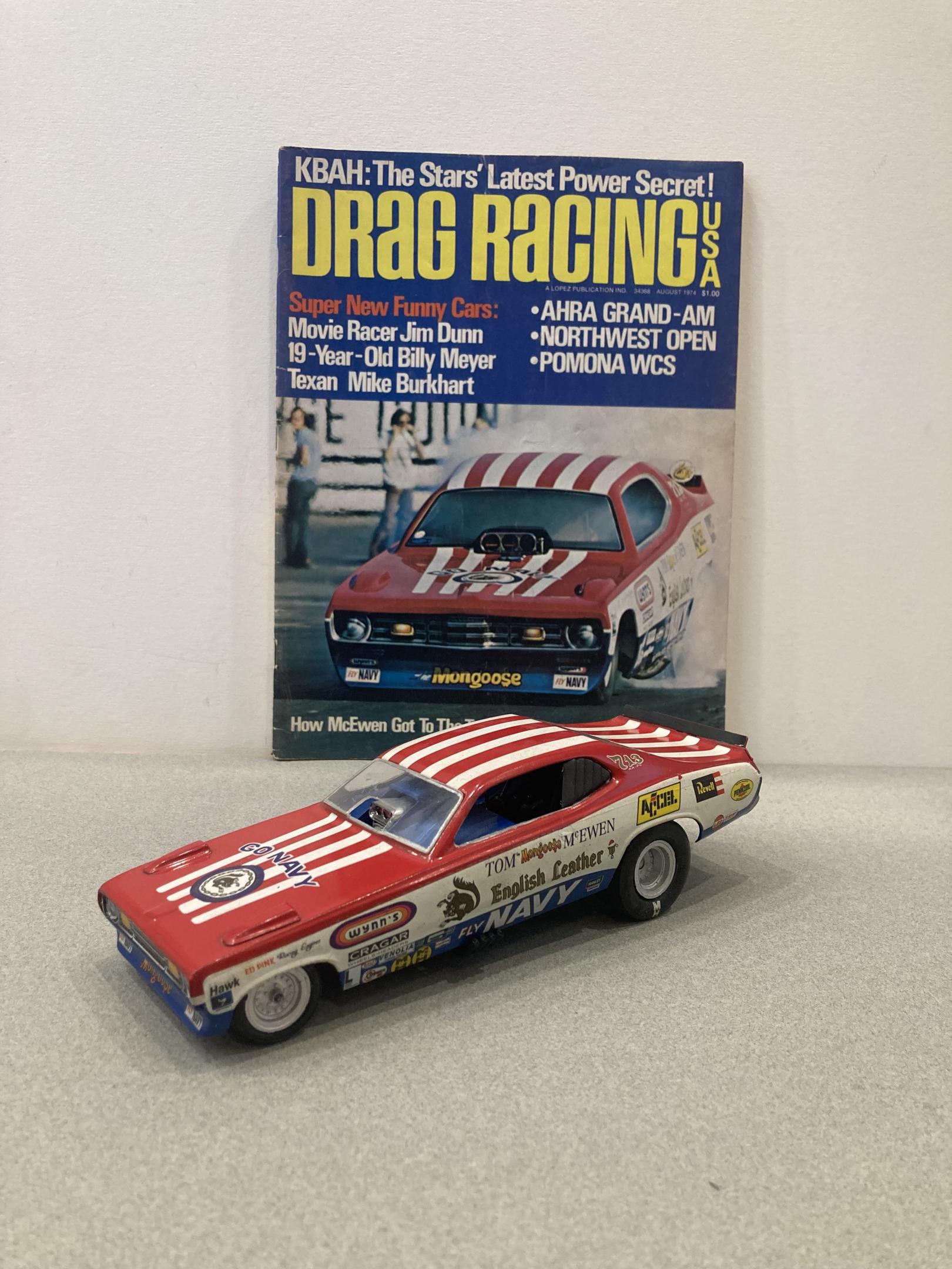 I built this one from the revell duster Funny car I used the latest Mongoose issue. I moved the engine forward in the chassis, and hood bulge was cut out of the Don Schumacher Vega body , and grafted to the duster body. I also cut down the roll cage a little to get the body as low on the chassis as possible. The paint is Testors white with chuck Boener decals. Until next time thanks for looking. Mike