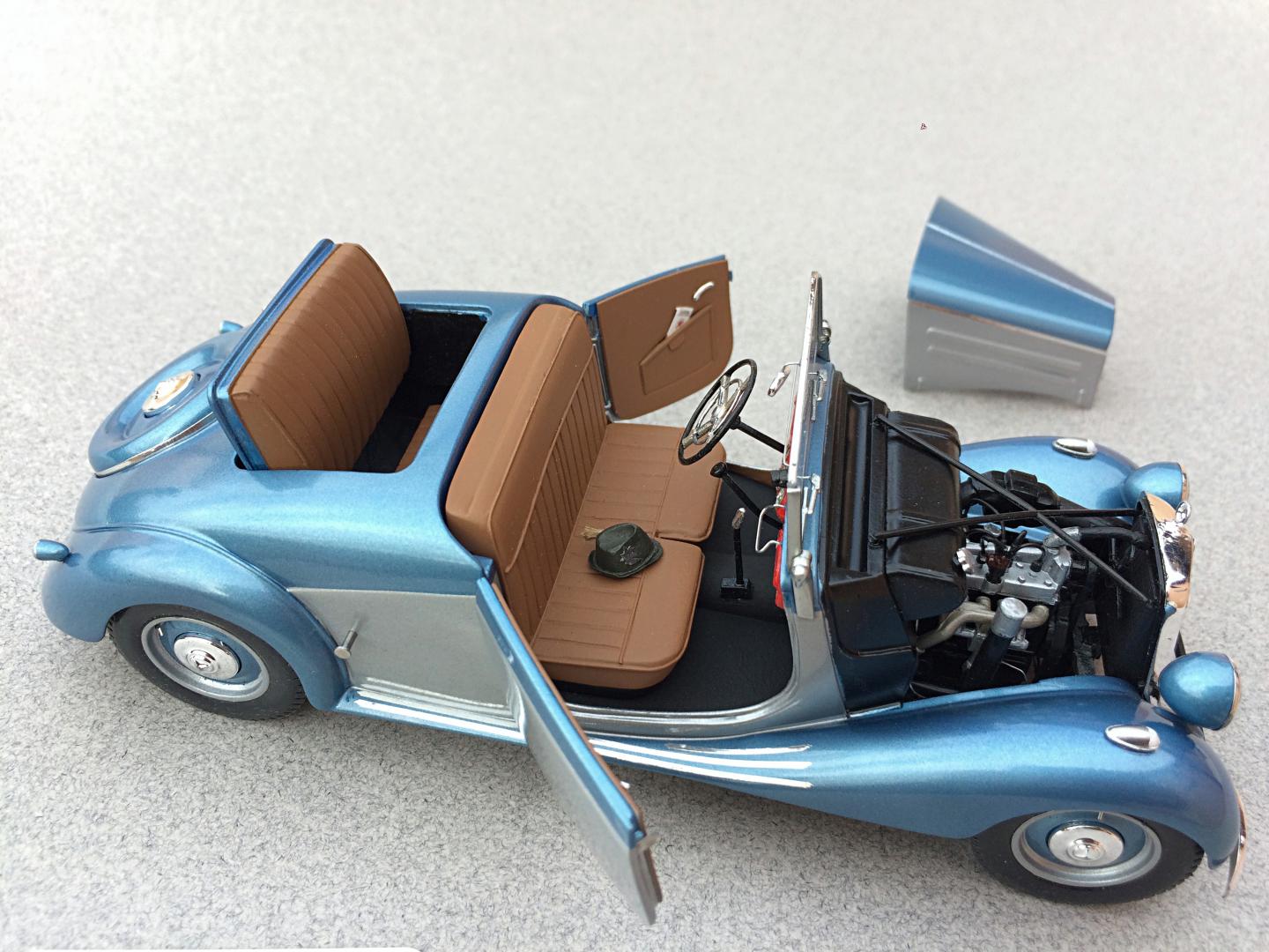 I'm back...... My dad restored a real one about 50 years ago, when I was a brat. I sort of recall a drive from Flagstaff to our home at Grand Canyon (he was a park Ranger), riding in the rumble seat. I'm giving this to my mom for Christmas, but I'm sure she will let me enter it in contests. It started as a Heller 170V Berline 1:24 scale kit, that I got by mail prior to 1995, when I sketched what I needed to do. I chopped off the roof and used Corian (kitchen countertop) to fabricate the rear part, including the rumble seat. The windshield is also scratch-built, and folds down. The back seat was modified into the front seat. The steering wheel was incorrect 3 spokes. I turned the spare tire cover out of Corian, using a drill press and wood chisel. I cut up about 80% of the interior door panels for various body parts. The engine and chassis are almost box stock, *had to* use real coil springs on the rear suspension. I used Alclad "chrome" paint, and aluminum tape; Testors custom mix of metallic blue, and 'aluminum' (looks much better than so-called 'German Silver' which looked like steel). I made body mounts and grill mount, to screw together. I even carved his hat that I have, that's older than me. The diorama is another story.