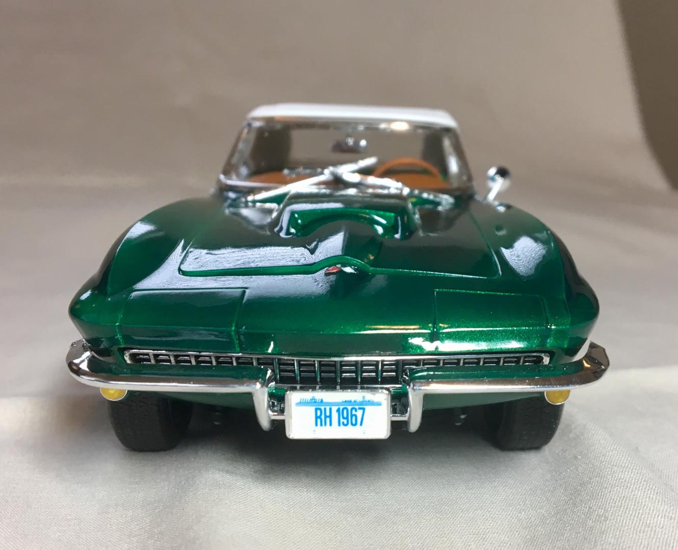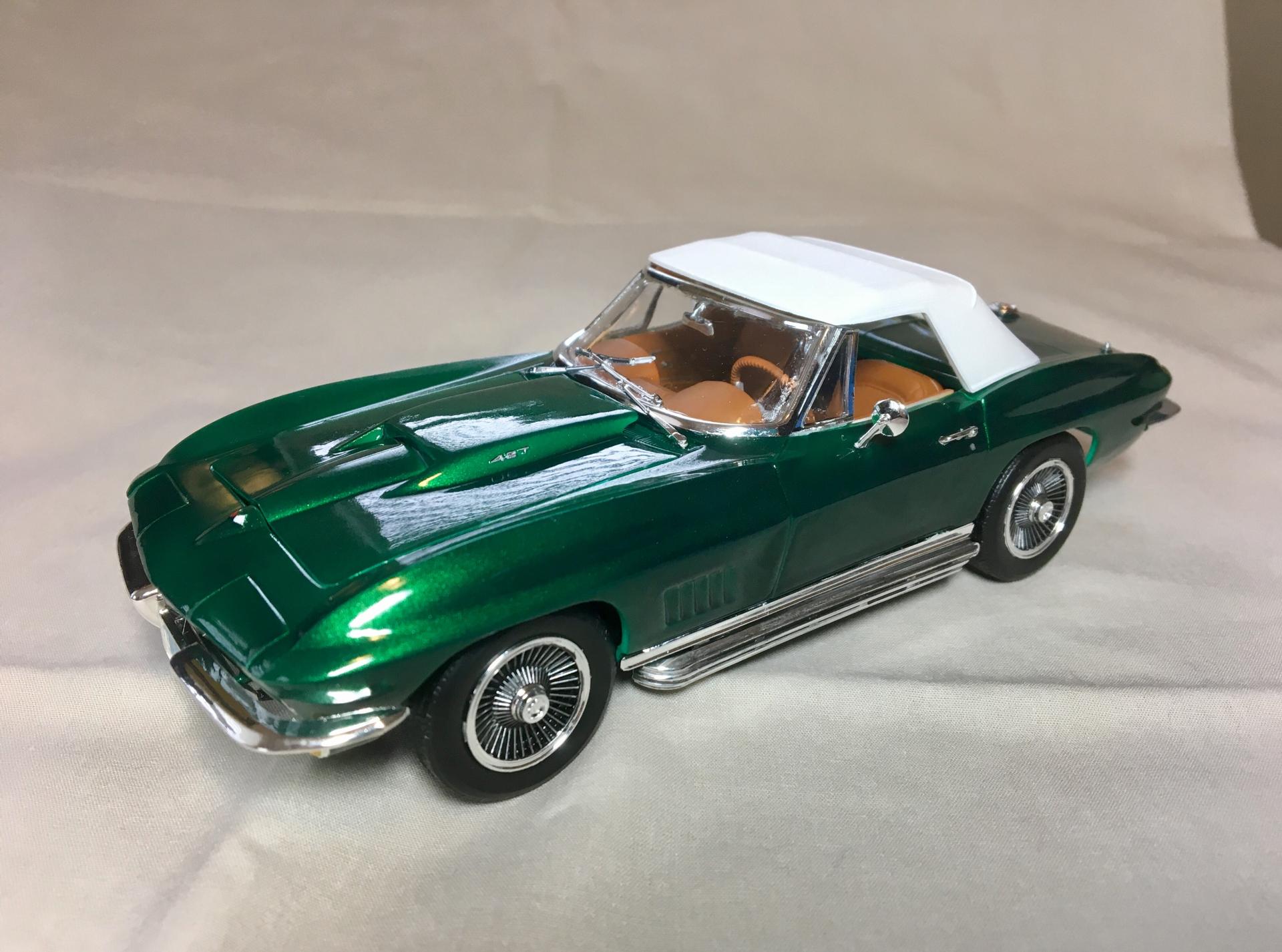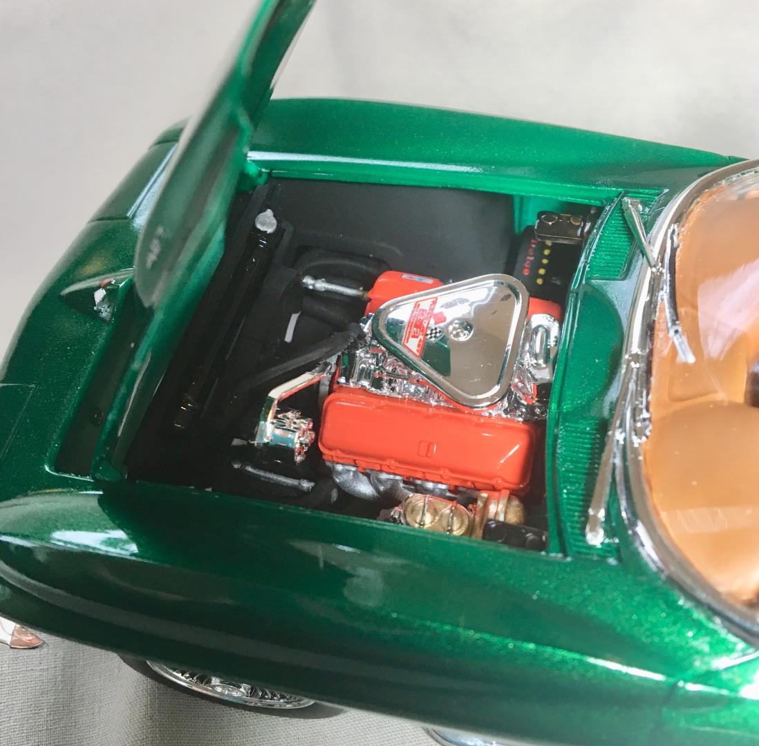 This is a 1:25 Revell Monogram kit of a '67 Corvette 427 Roadster. This is one of many kits generously given to me by a friend from work. It turned out almost exactly as I imagined it. The only differences were the omission of the white hood stripe and the redline tires. The decals were really old and had been stored in a garage with poor air conditions. Some of the decals disintegrated in water. I found a product online, a brush-on film for preserving old decals I can use on future models. Most of the parts under the hood and in the interior have a color scheme based on Corvette part pictures I found online. The Workbench thread is located here: