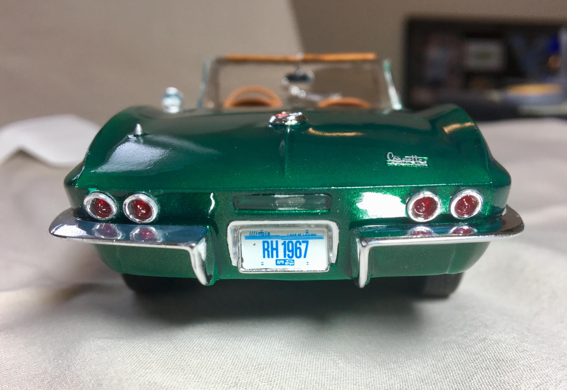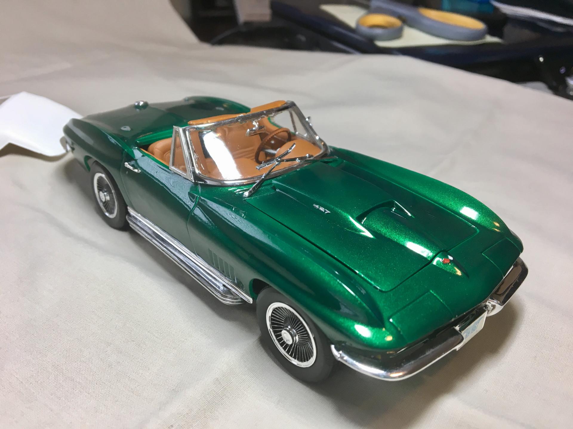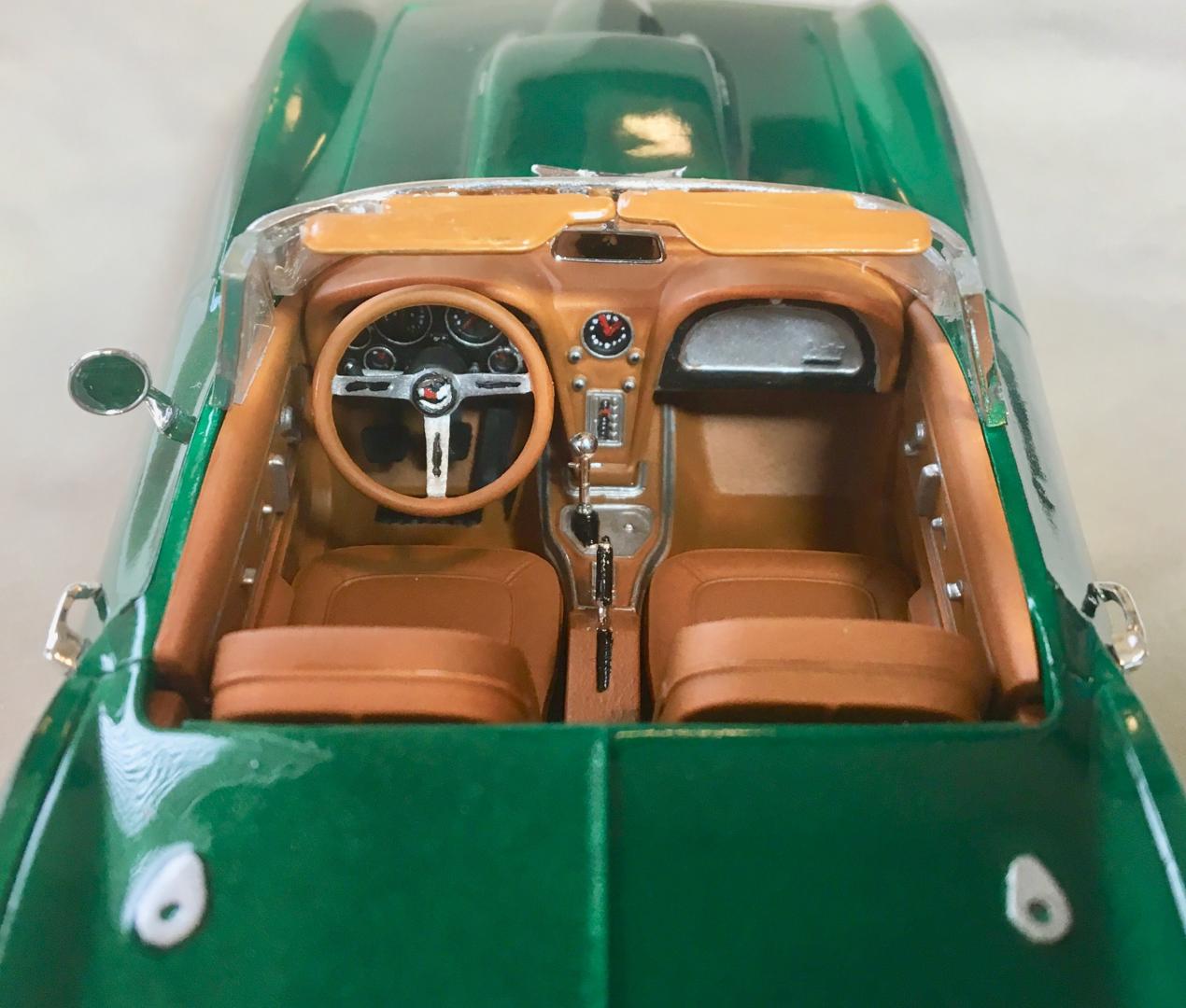 This is a 1:25 Revell Monogram kit of a '67 Corvette 427 Roadster. This is one of many kits generously given to me by a friend from work. It turned out almost exactly as I imagined it. The only differences were the omission of the white hood stripe and the redline tires. The decals were really old and had been stored in a garage with poor air conditions. Some of the decals disintegrated in water. I found a product online, a brush-on film for preserving old decals I can use on future models. Most of the parts under the hood and in the interior have a color scheme based on Corvette part pictures I found online. The Workbench thread is located here: