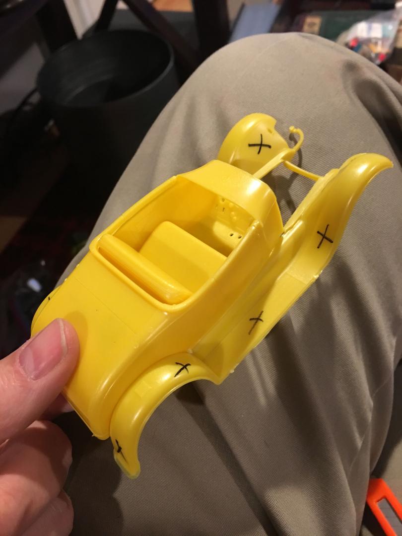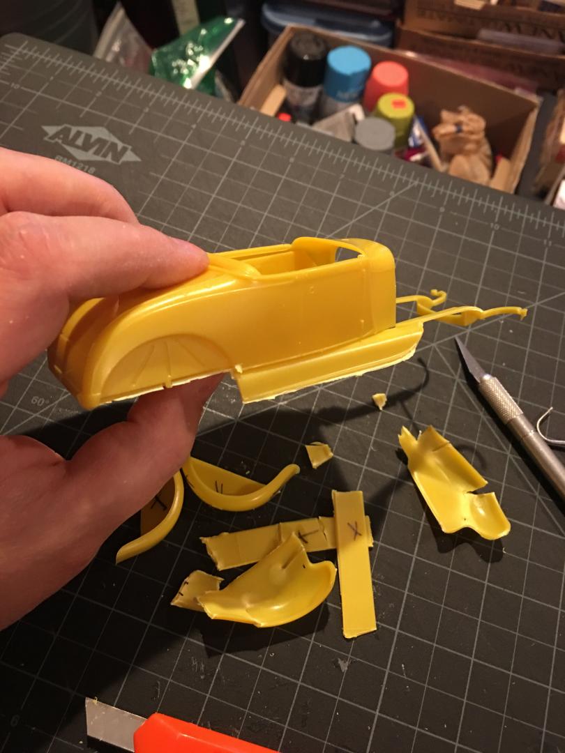 Hey all, The ideas have been in my head for a while, so I was glad when I finally made some time last night to get started on a few projects. The first project is the '29 Ford Roadster I'm building for the Mid-Atlantic NNL theme, The Race of Gentlemen. I'll be building it from the AMT Mod Rod / Model A '29 Ford kit. As I've been learning more about Model A's and looking through photos of them online I came across a variation I had not seen before, where the fenders and running board are removed, but the skirt (not sure of the actual name) is left intact as in the photo below. I marked out the areas that would need to be removed with a sharpie and began cutting. The plastic on the newer, Chinese made kits is thinner than the older, USA made kits in my opinion, and was pretty easy to cut through. I used an Exacto blade and scored the straight lines and the curve behind the front fenders. I used nippers to cut out sections so that when I pulled them apart from the main fender assembly it didn't tear off larger areas than I wanted. Based on the photo of the 1:1 '29 Ford, I made sure to cut out the flat vertical areas behind the rear fenders as well. A little trimming and sanding made a big difference and balanced out the appearance on both sides (not shown). I'll trim out the fork area and radiator mount next. I'm happy with the progress I made and it's a good start to this project.