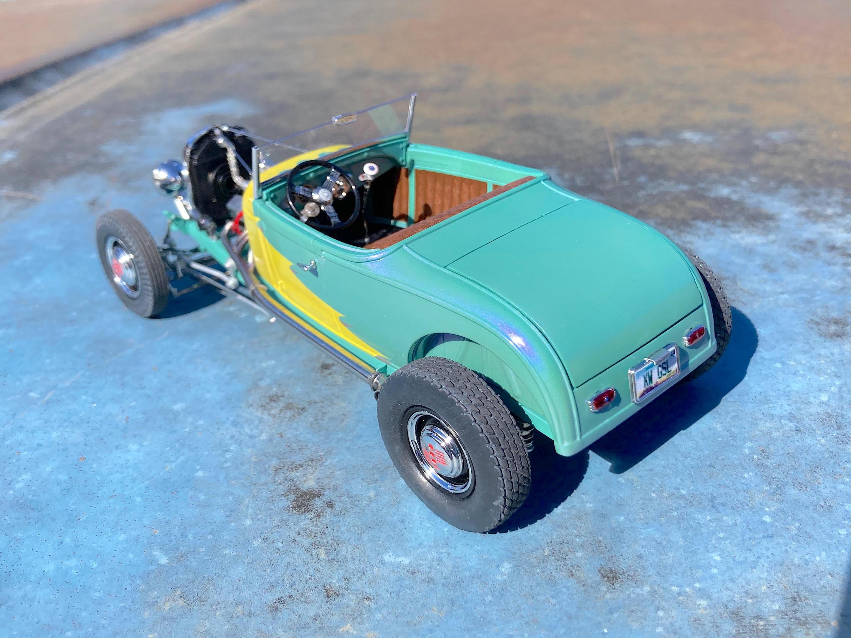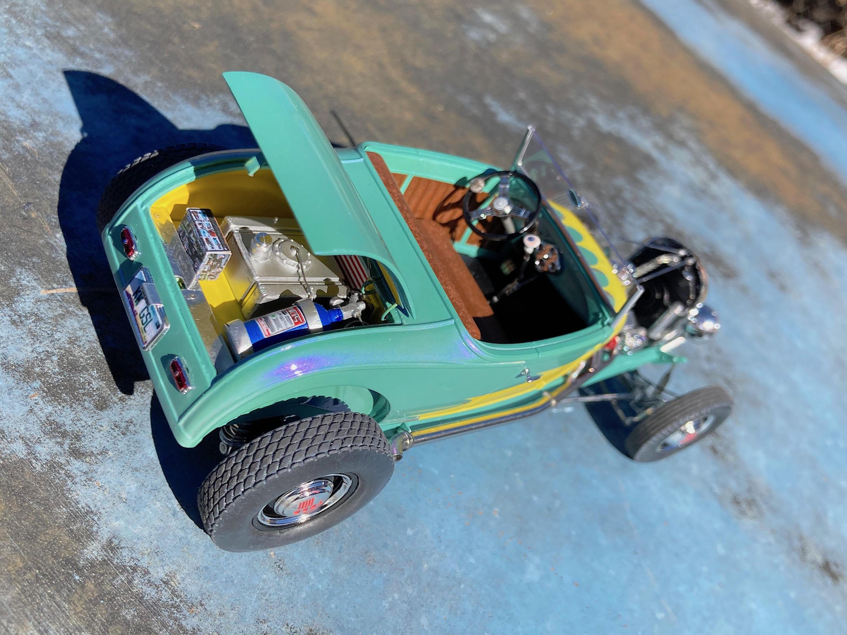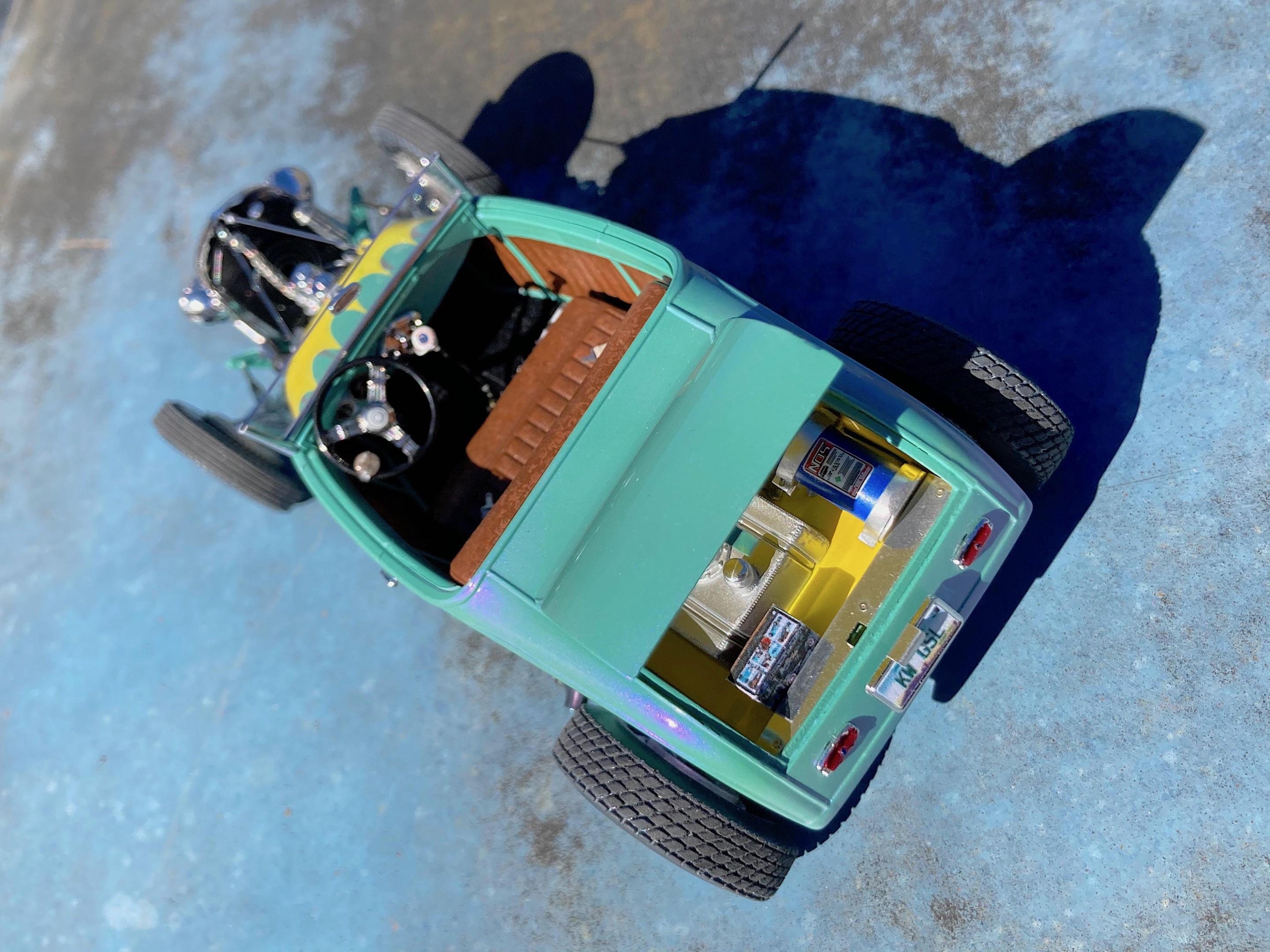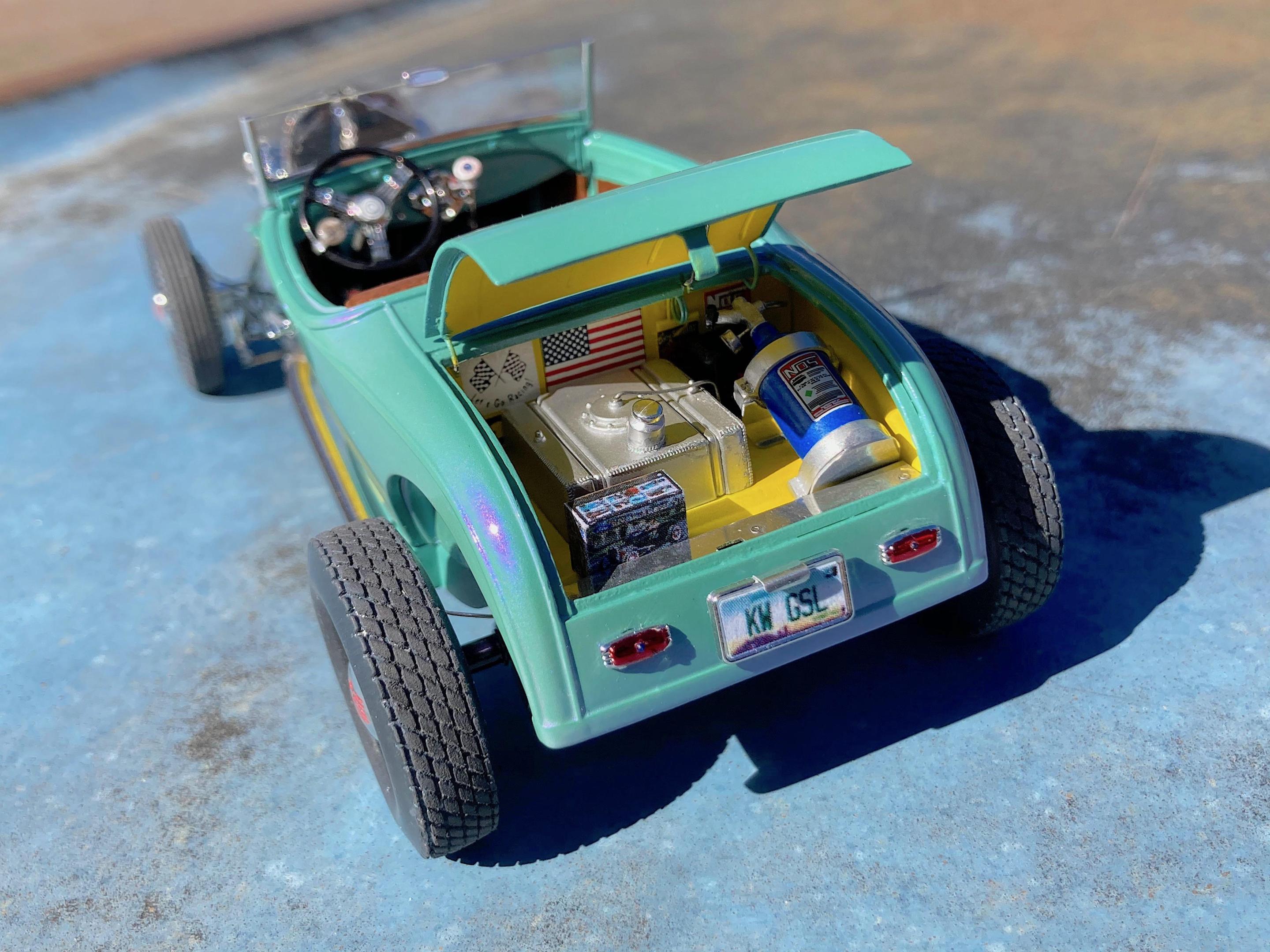 WIP: GSL Common Kit: [revision] just another Model A Roadster Fresh off the bench. After looking at the pictures, will be cleaning off the fuzz, and add some road trip weathering. It's been decades since I built a hot rod, and never a Model A. The only reason I built it, have entered the Common Kit class at every GSL (they have my Porsche 911 Speedster Turbo in the 'If I Had Designed It' class ?) that I attended, and have almost always got an award. I don't expect anything this time because I expect everyone and their brother will enter all kinds of awesome builds, so I hope that my additional details that are missing from the kit will make points. I have to admit, this was fun. ? Primary paint is special order Splash paints used on my '69 Chevy pickup THE GREEN BARGE with Model Master pearl clear on the body. My favorite scratch-building material is newspaper printing plate, almost every part utilized it. There are only five parts that are turned aluminum, four turned from Corian®. Added a nitrous system. If there is anything everyone should do when they build this kit, open the trunk so you can see the fuel tank and battery, come on Revell! I should take pictures of the bottom, since many details added are there. Will take glamor "studio" shots sometime.