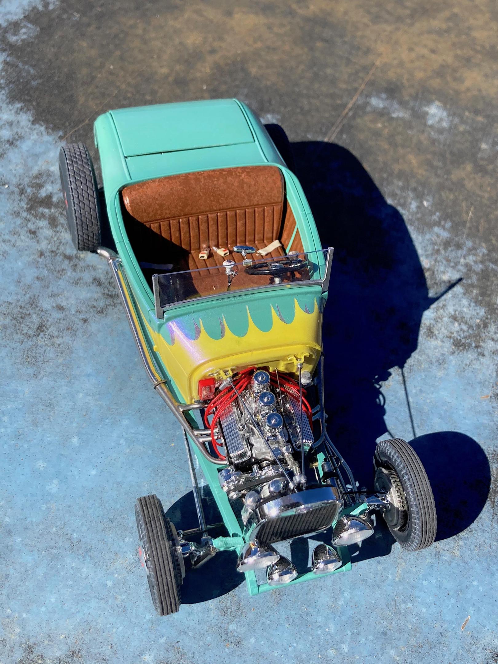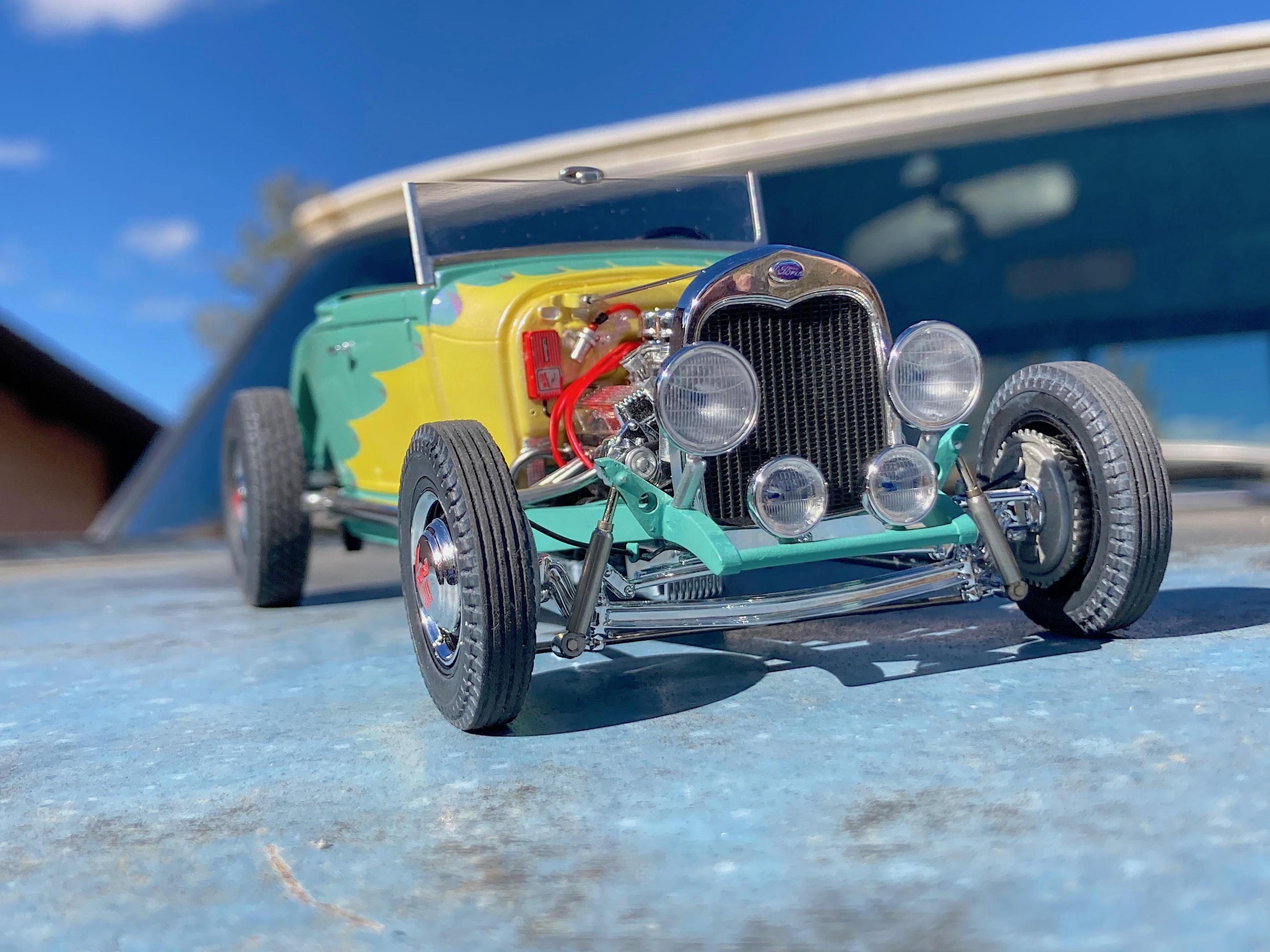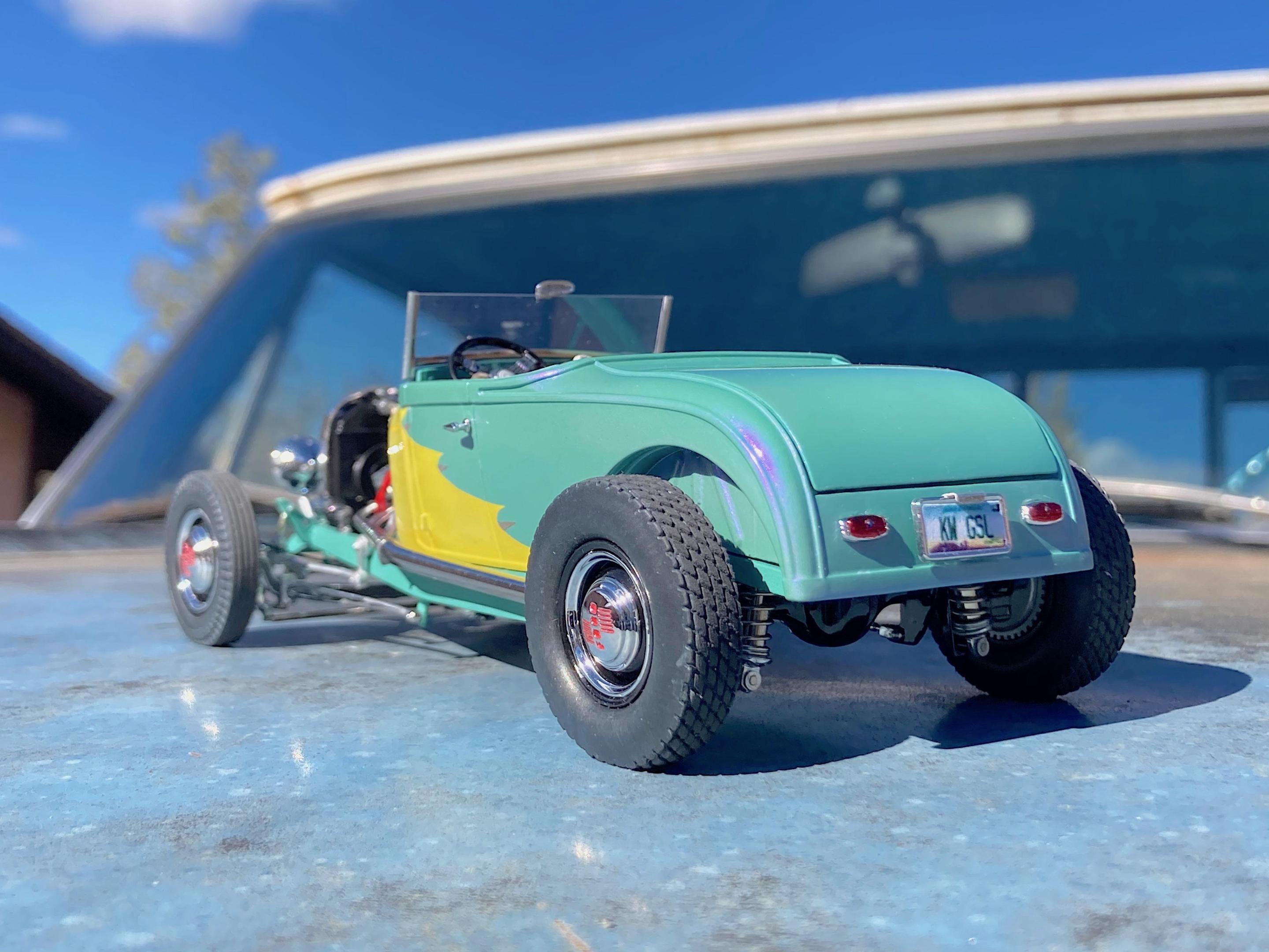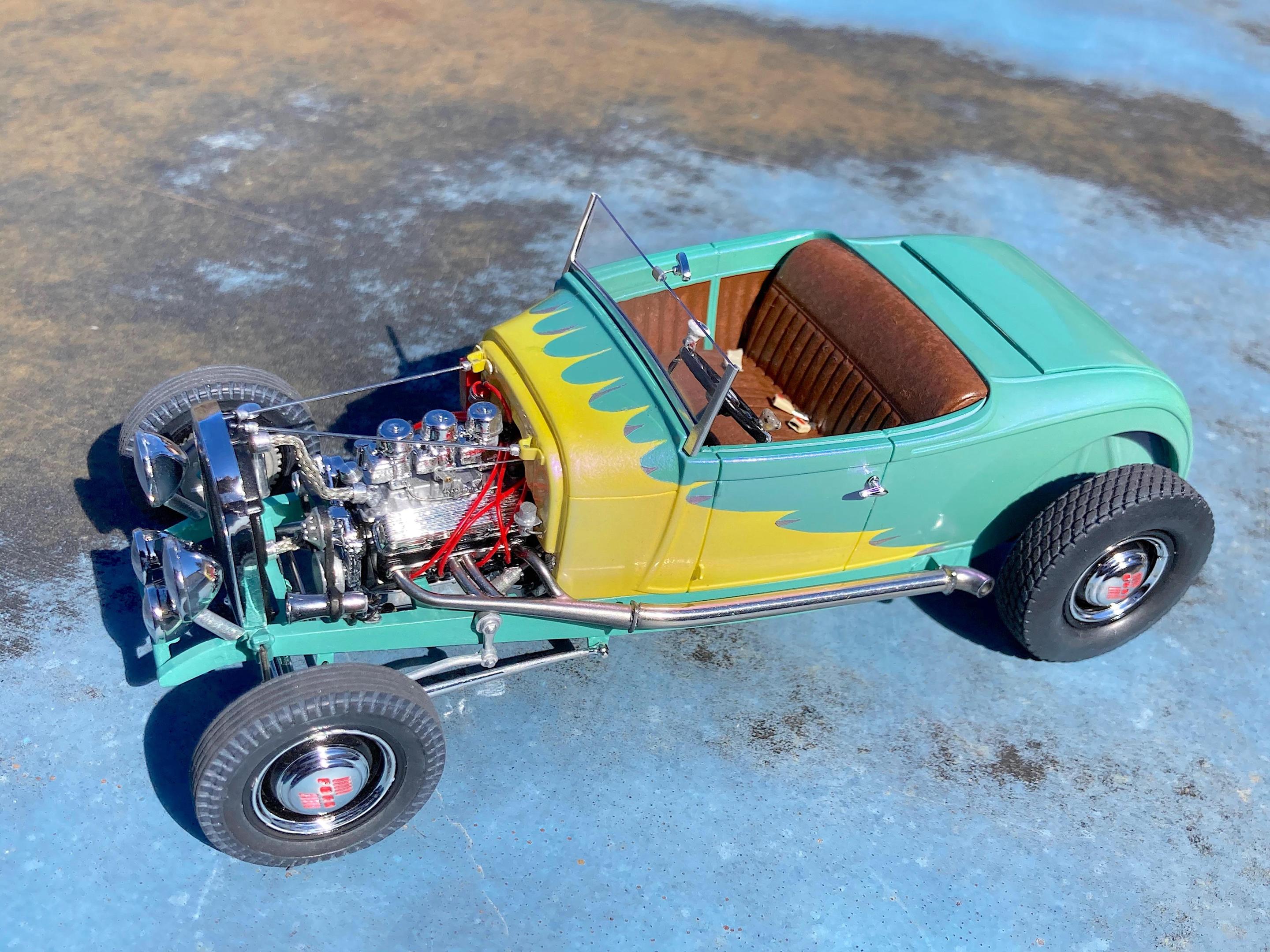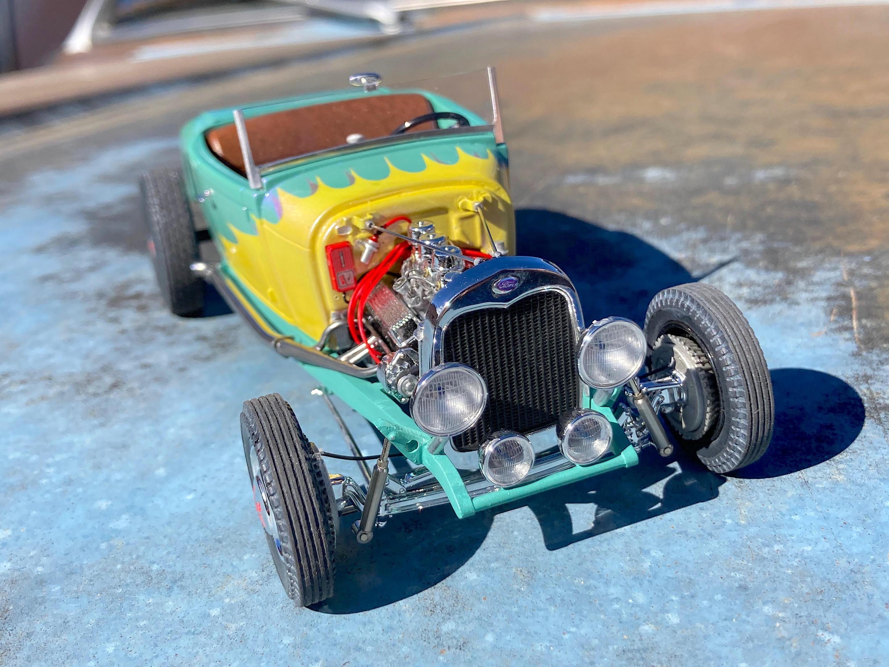 WIP: GSL Common Kit: [revision] just another Model A Roadster Fresh off the bench. After looking at the pictures, will be cleaning off the fuzz, and add some road trip weathering. It's been decades since I built a hot rod, and never a Model A. The only reason I built it, have entered the Common Kit class at every GSL (they have my Porsche 911 Speedster Turbo in the 'If I Had Designed It' class ?) that I attended, and have almost always got an award. I don't expect anything this time because I expect everyone and their brother will enter all kinds of awesome builds, so I hope that my additional details that are missing from the kit will make points. I have to admit, this was fun. ? Primary paint is special order Splash paints used on my '69 Chevy pickup THE GREEN BARGE with Model Master pearl clear on the body. My favorite scratch-building material is newspaper printing plate, almost every part utilized it. There are only five parts that are turned aluminum, four turned from Corian®. Added a nitrous system. If there is anything everyone should do when they build this kit, open the trunk so you can see the fuel tank and battery, come on Revell! I should take pictures of the bottom, since many details added are there. Will take glamor "studio" shots sometime.