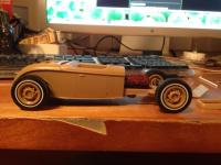 Just completed this one recently (it may get some light weathering in future, though. We'll see...). This is a project that was started in 2013, sat in the box for years, and then sat partially assembled for over a year before I decided to make a few changes and finish it up. Some notes: -AMT 29 roadster, AMT '34 Ford flathead with aluminum intake stacks and scratchbuilt wire looms. Headers modified from Revell '32 Tudor kit, AMT '34 Ford wire wheels on Johan Mercedes 500k tires out back, and Revell '31 Woody wire wheels/tires in front. Firewall was modified with extra flanges to look more like the 1:1, and it has a flattened front crossmember and AMT '34 Ford coupe front axle to get the front end down. Cut-down steering wheel, '31 Woody door handles, and the windshield frame was chopped and removed from the stanchions then attached to the chopped-down roadster roof--so they can be removed as a unit for that stripped-down racer appearance. The headlights and taillight/license plate are held on with wire clips and are also removeable. Thanks for looking!