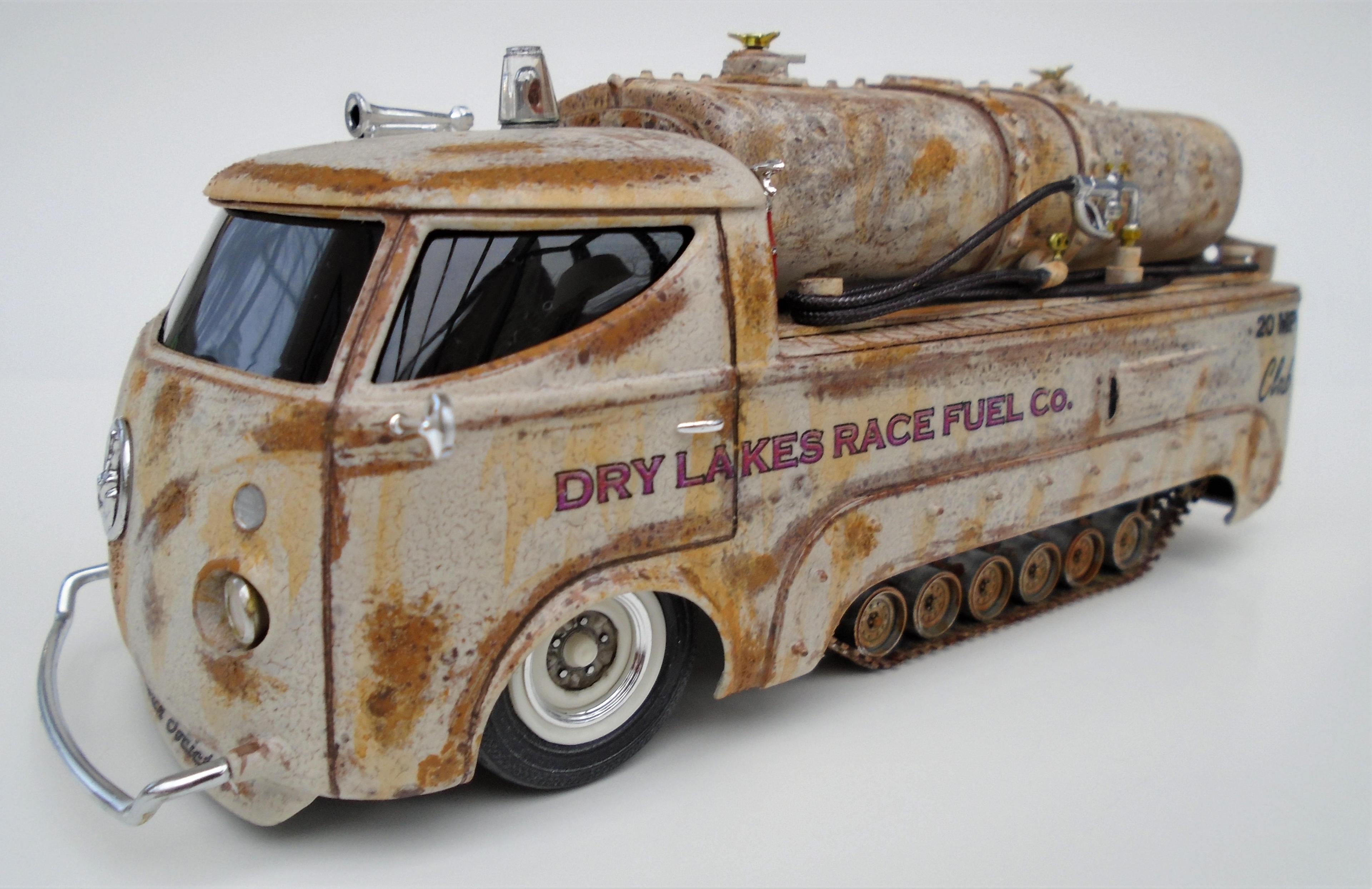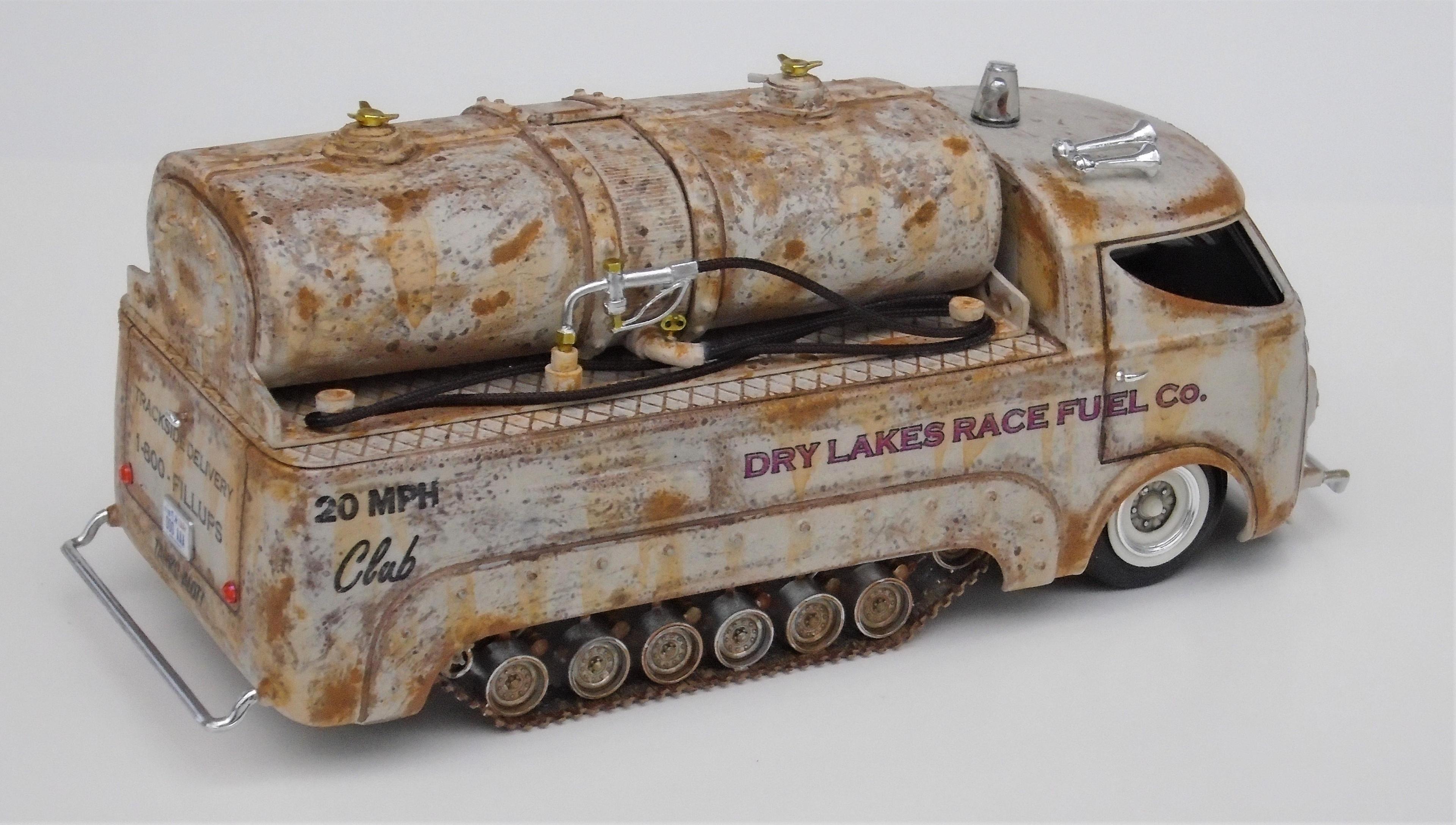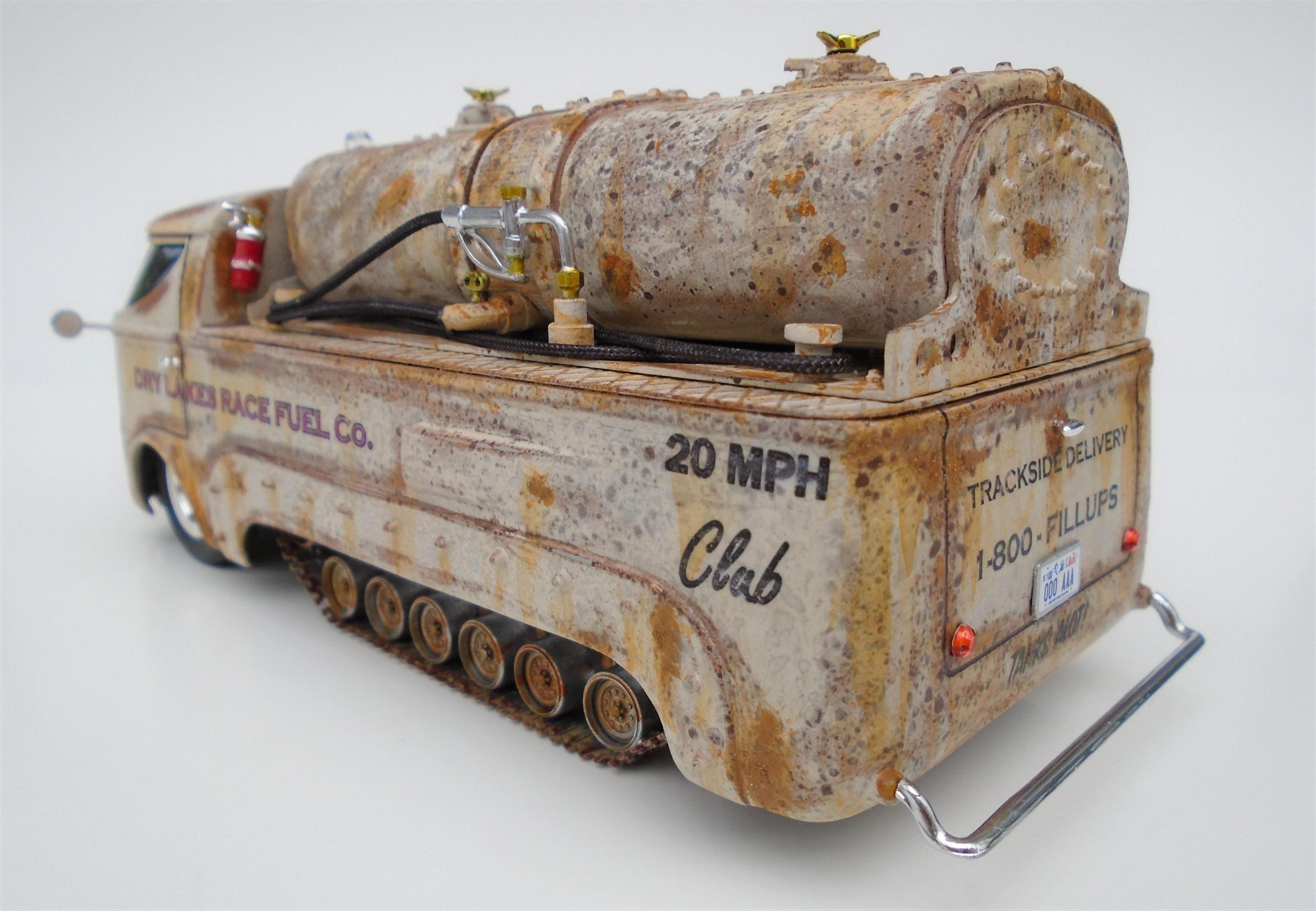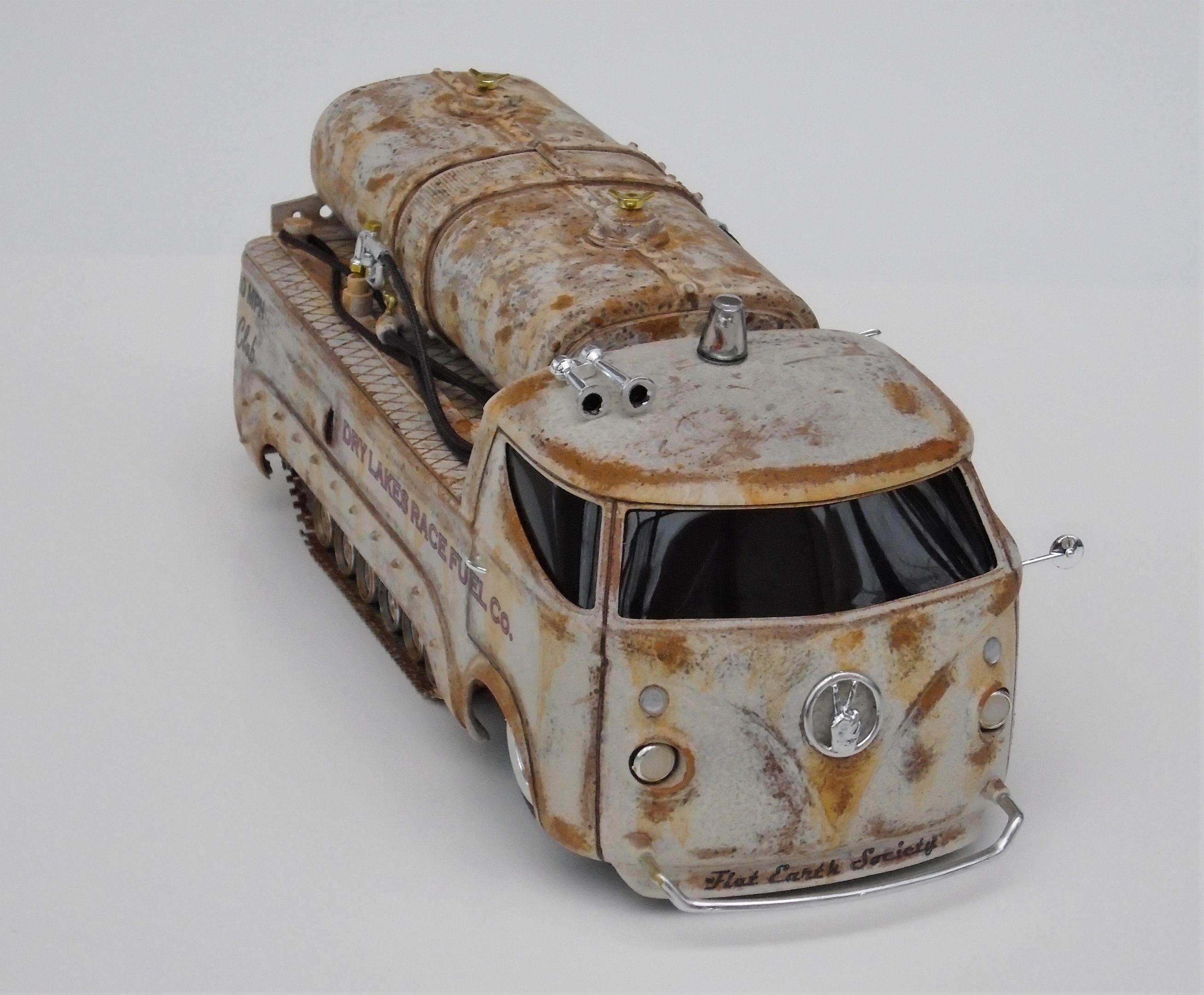 HI! Over the years, I've built many lakesters, all members of my FLAT EARTH SOCIETY. But, I realized that this fleet needed trackside refueling, so, why not deliver, even if the flats become soaked, as they are once in a while? I started with a gluebomb junk bin Baja Beast VW van (heavily modified) and a Revell Patton 1/72 tank undercarriage (also modified). Front wheels & tires, horns, extinguisher and door handles from my parts box. Inverted bumpers. I saved the windshield with polishing, Future dip and inner black-out. All the rest scratchbuilt: rear platform, gas tank, gaz nozzles & hoses & meters, roof light, rear stops & licence plate, etc. Various Craftsmart acrylics, weathered with the spray-net method, Testor's satin clear + Vallejo light rust wash, Molotow chrome. And countless Meng "nuts and bolts", fully rusted. Long live the salt!