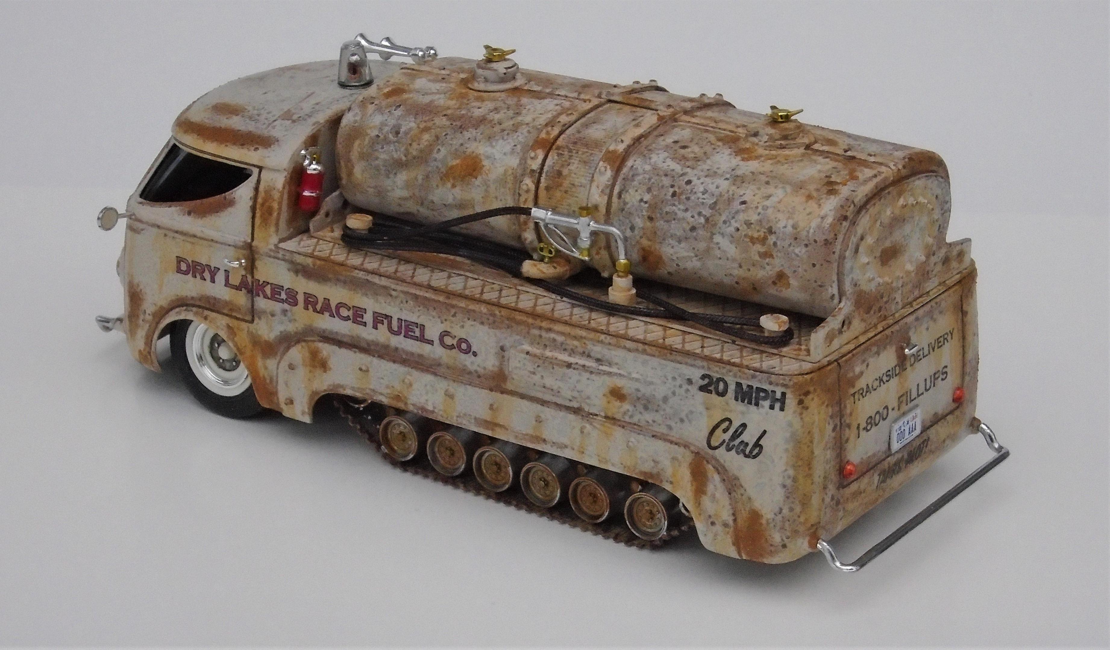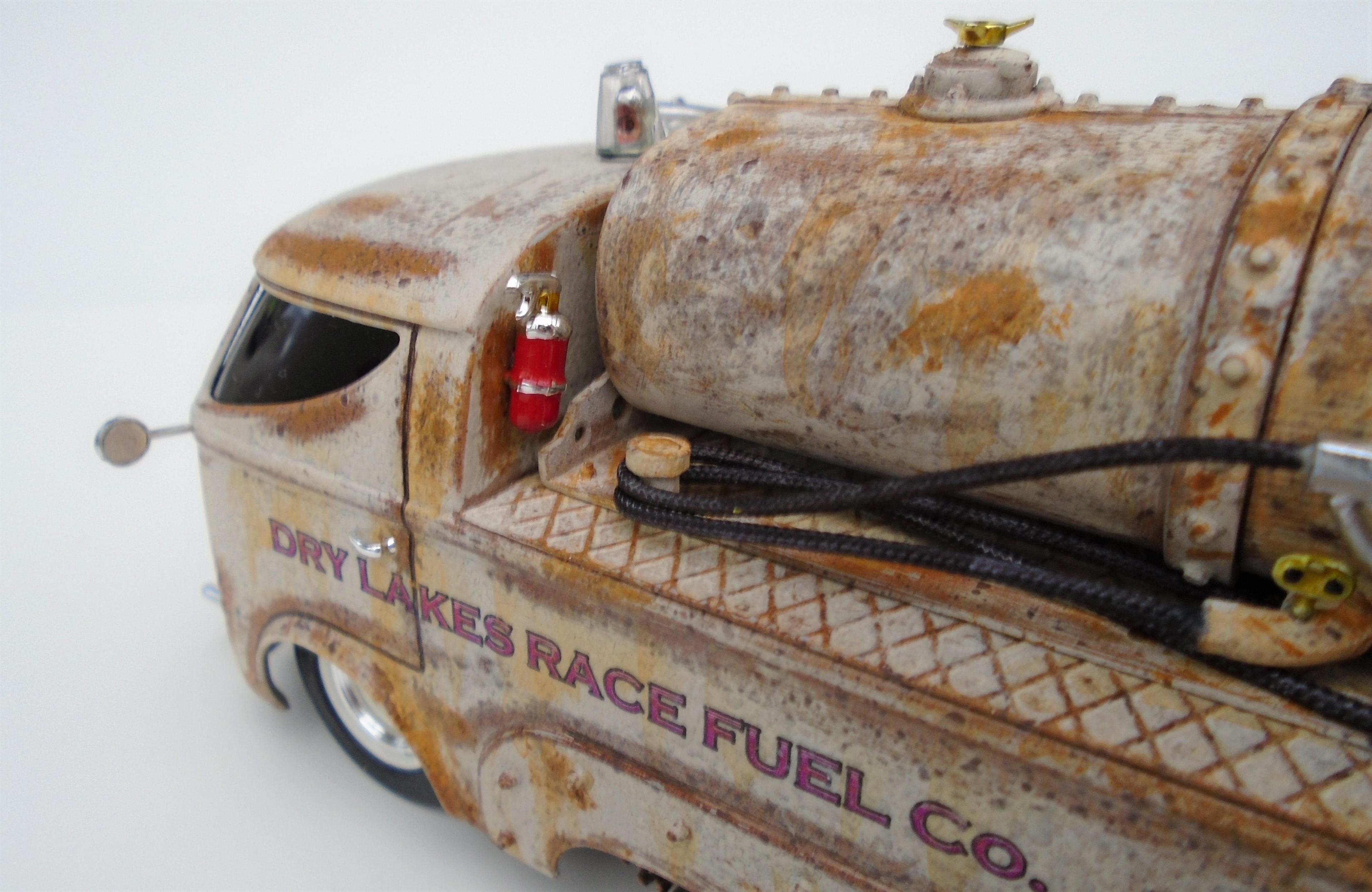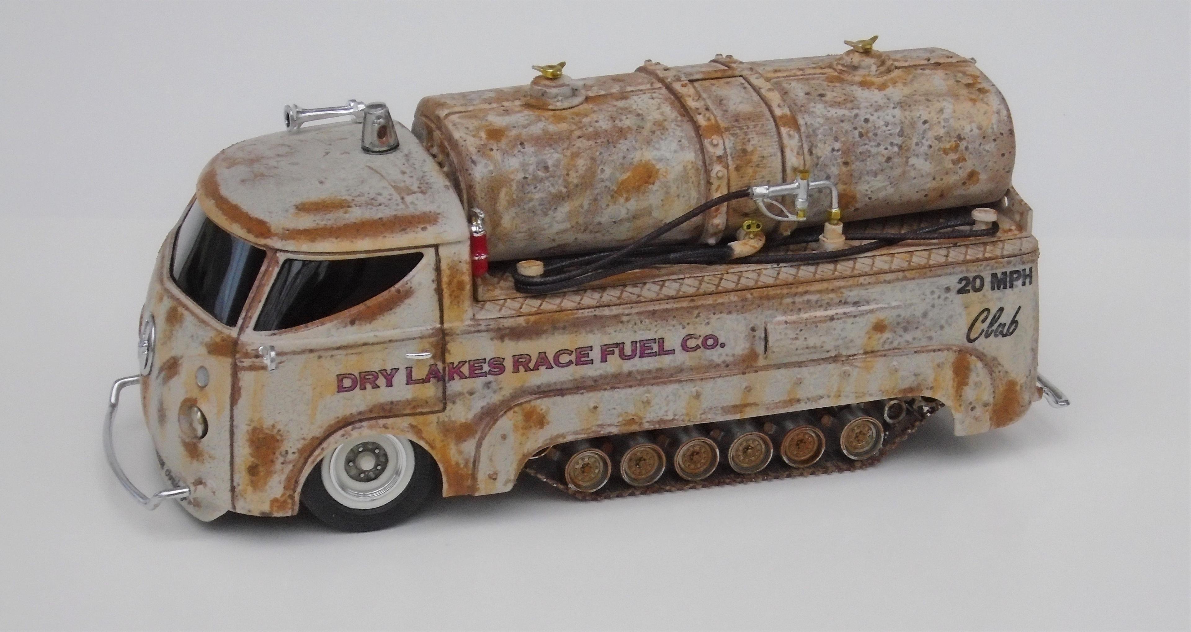 HI! Over the years, I've built many lakesters, all members of my FLAT EARTH SOCIETY. But, I realized that this fleet needed trackside refueling, so, why not deliver, even if the flats become soaked, as they are once in a while? I started with a gluebomb junk bin Baja Beast VW van (heavily modified) and a Revell Patton 1/72 tank undercarriage (also modified). Front wheels & tires, horns, extinguisher and door handles from my parts box. Inverted bumpers. I saved the windshield with polishing, Future dip and inner black-out. All the rest scratchbuilt: rear platform, gas tank, gaz nozzles & hoses & meters, roof light, rear stops & licence plate, etc. Various Craftsmart acrylics, weathered with the spray-net method, Testor's satin clear + Vallejo light rust wash, Molotow chrome. And countless Meng "nuts and bolts", fully rusted. Long live the salt!