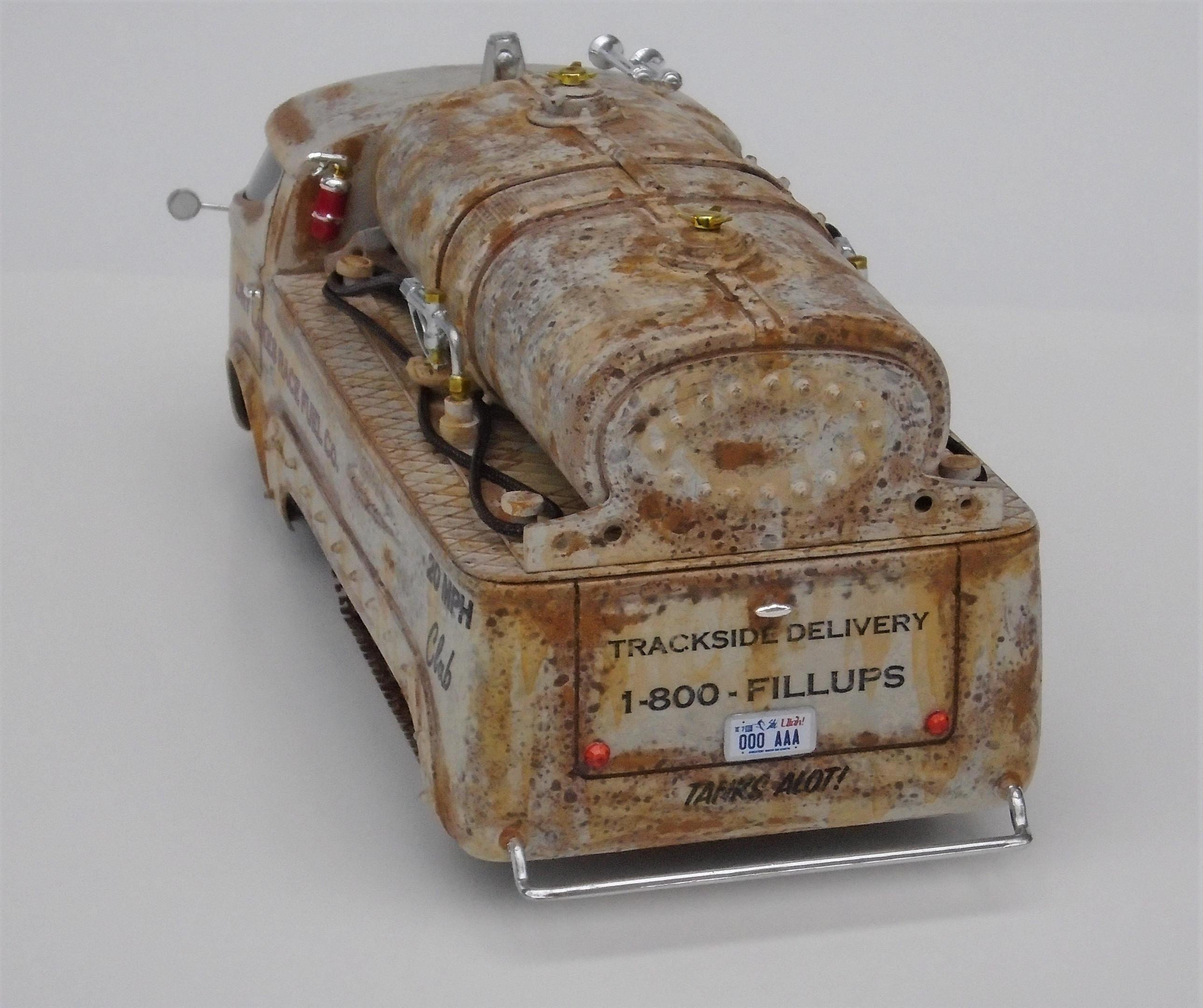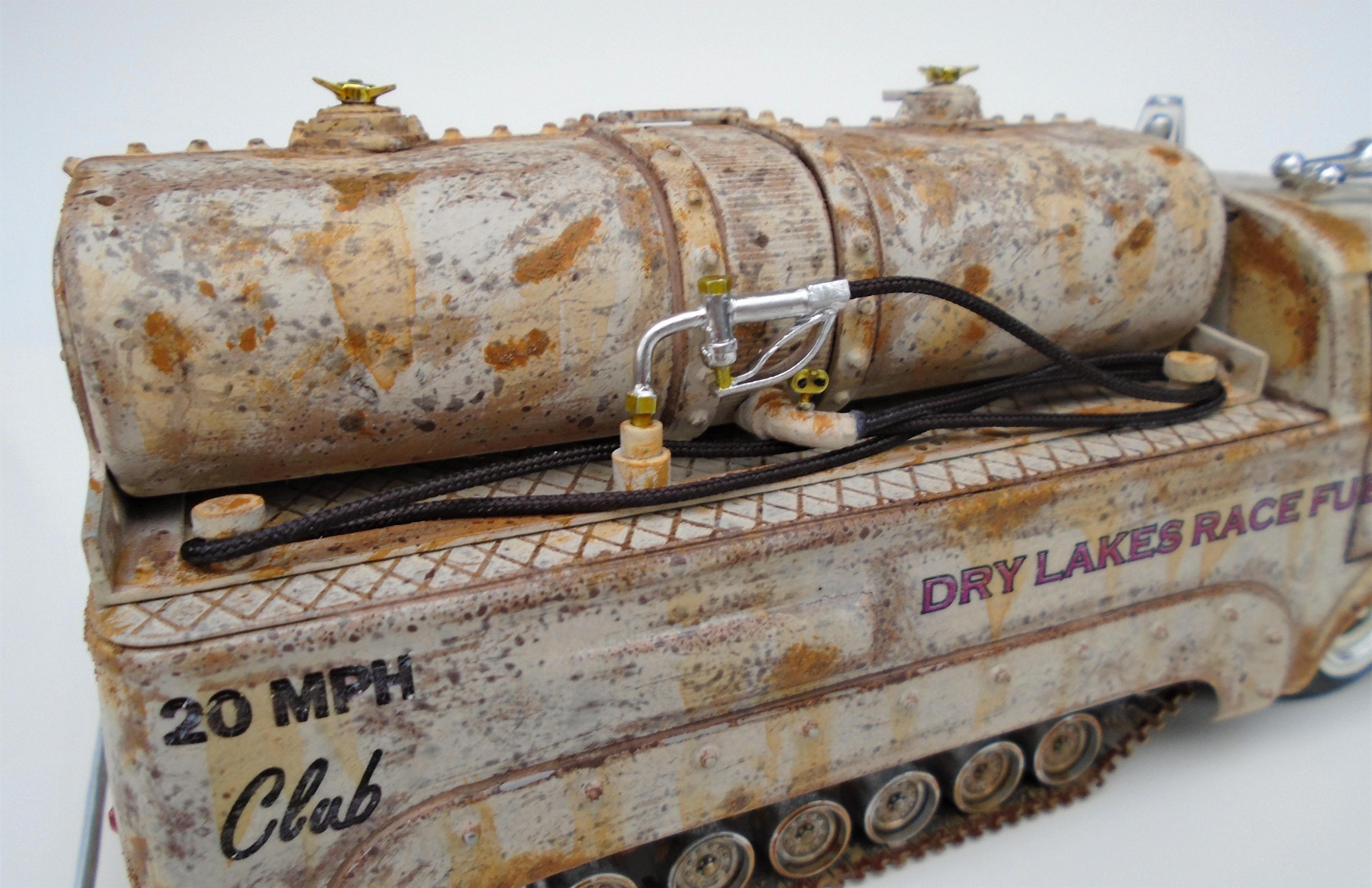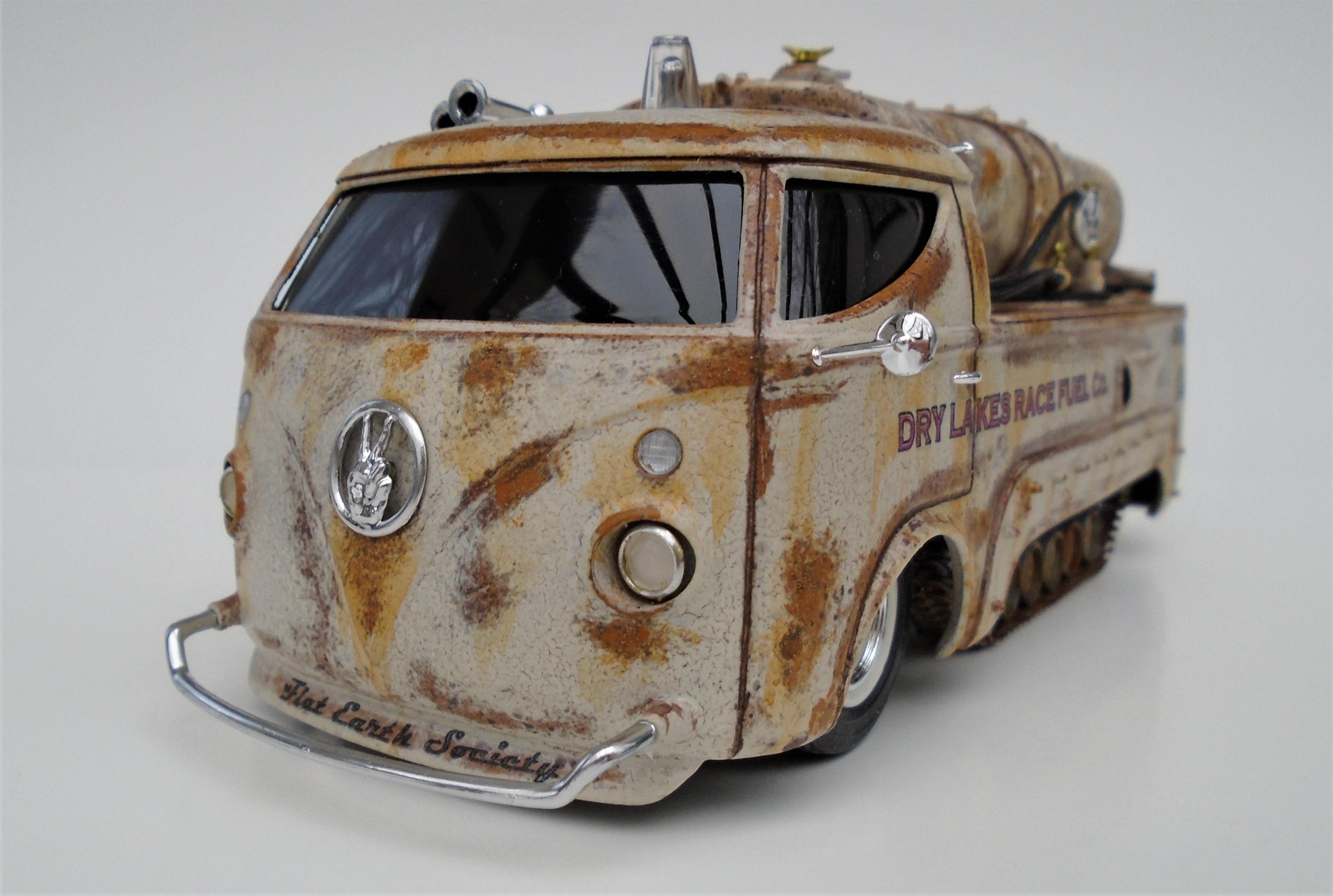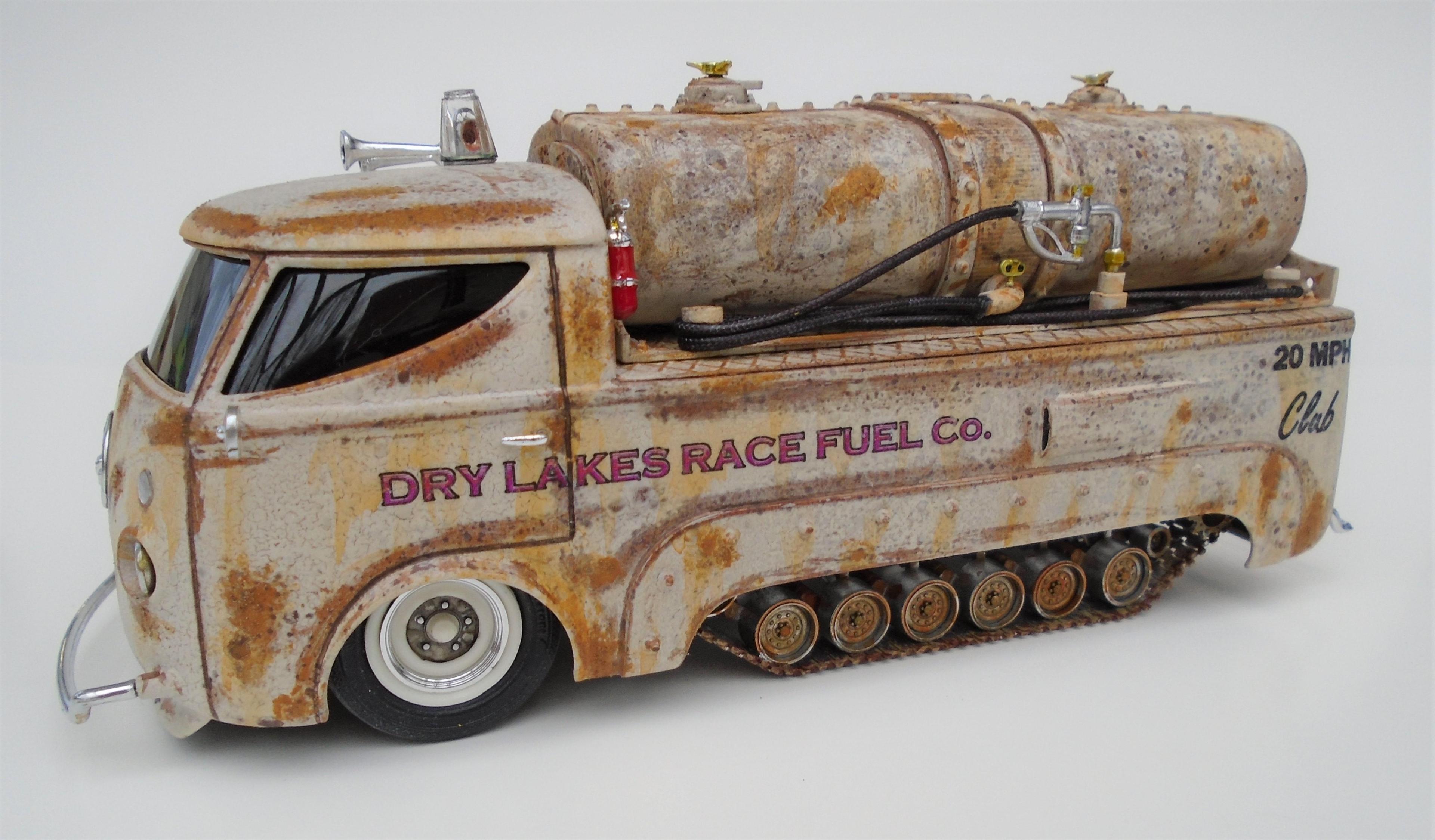 HI! Over the years, I've built many lakesters, all members of my FLAT EARTH SOCIETY. But, I realized that this fleet needed trackside refueling, so, why not deliver, even if the flats become soaked, as they are once in a while? I started with a gluebomb junk bin Baja Beast VW van (heavily modified) and a Revell Patton 1/72 tank undercarriage (also modified). Front wheels & tires, horns, extinguisher and door handles from my parts box. Inverted bumpers. I saved the windshield with polishing, Future dip and inner black-out. All the rest scratchbuilt: rear platform, gas tank, gaz nozzles & hoses & meters, roof light, rear stops & licence plate, etc. Various Craftsmart acrylics, weathered with the spray-net method, Testor's satin clear + Vallejo light rust wash, Molotow chrome. And countless Meng "nuts and bolts", fully rusted. Long live the salt!