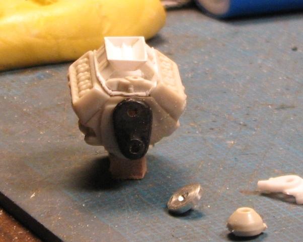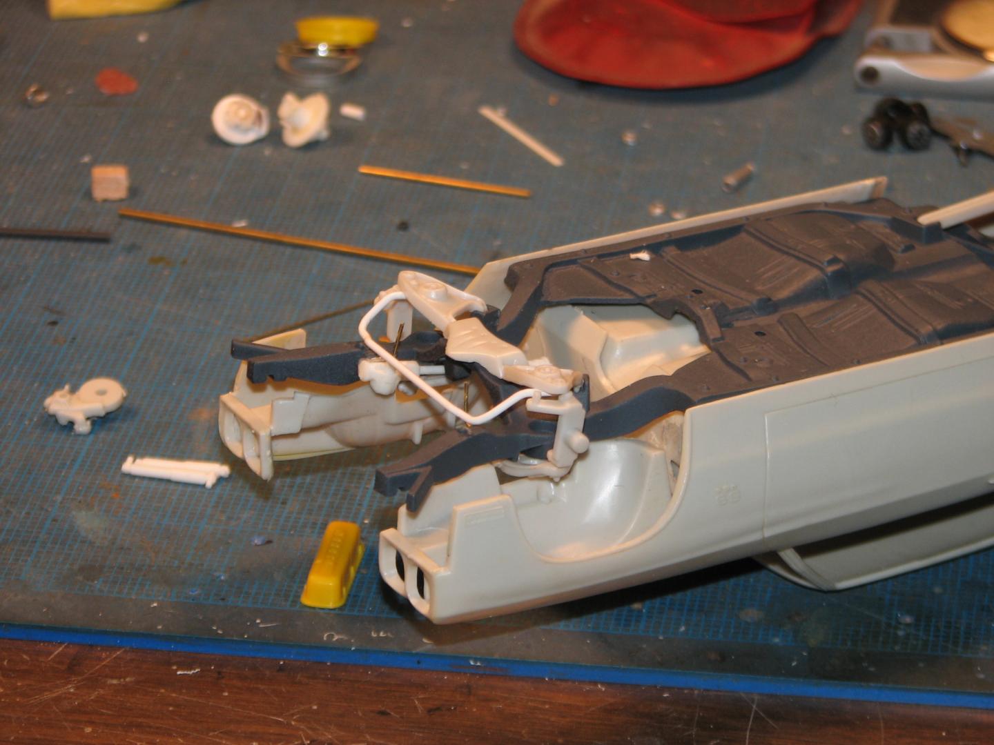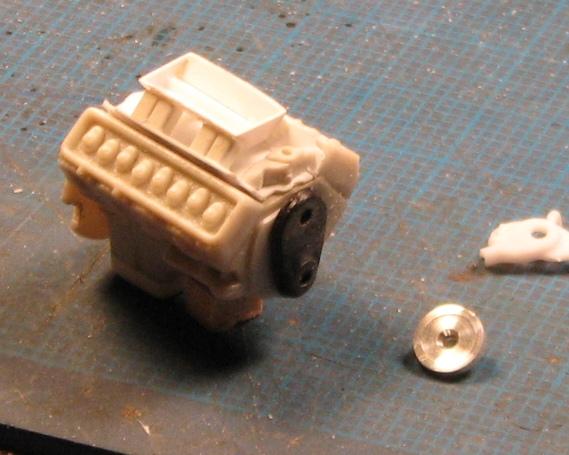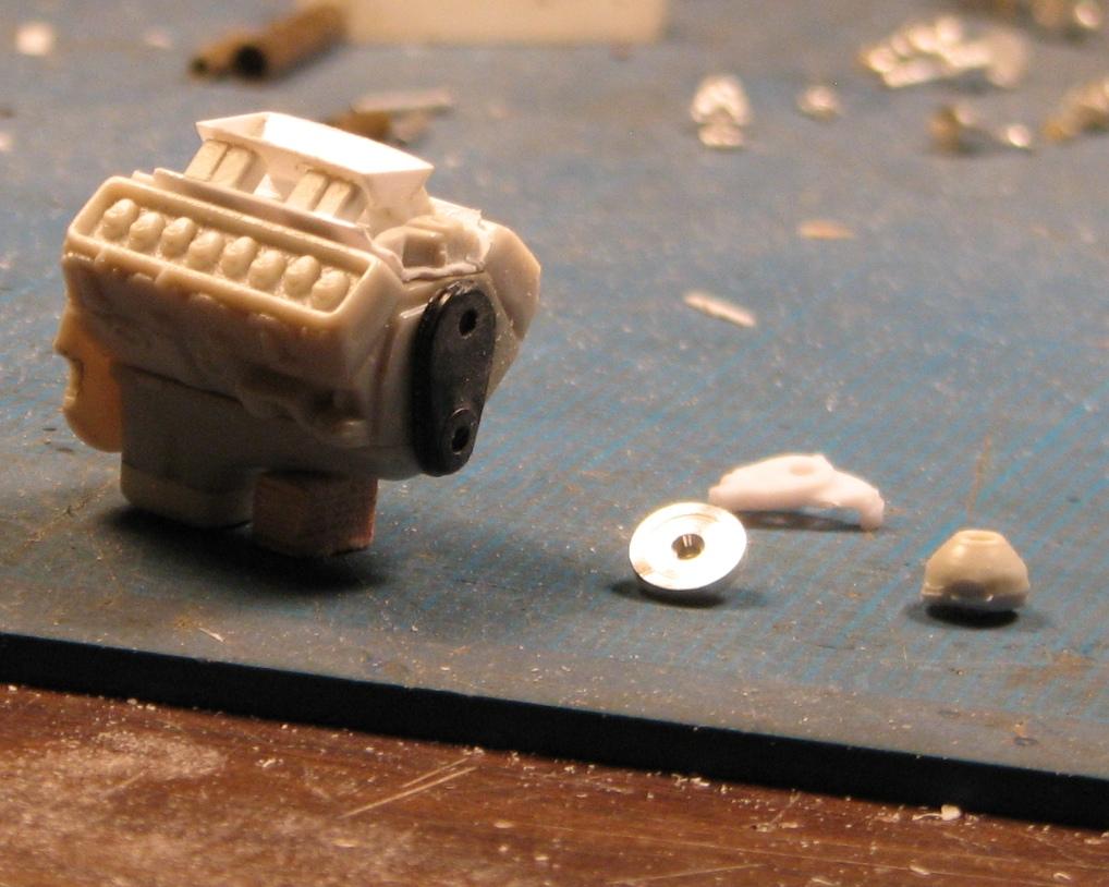 Having recently moved back to Colorado, and finally having my workshop up and running, I came across this project I started fifteen years, ago--or so. It's AMT's '70 Malibu, to be built to comply with the NHRA's 1975 rules for Modified Production. I began by replacing the Chevelle's front inner fenderwells and front clip with those from AMT's '70 Monte Carlo, along with the Monte's front suspension including its steering box. I replaced the single-piece cast timing cover/water pump/harmonic balancer assembly with a timing cover from the parts box, a water pump from a Revell Camaro and a harmonic balancer turned from aluminum. The manifold is scratchbuilt from 23 pieces of styrene. I also deepened the sump on the oil pan. The lower control arms have been boxed, and a few minor details thrown at them. Changes to the front suspension revolve mostly around the removal of the swaybar/tierod assembly. The steering will be built to be posable. The brass pins you see will mount the steering arm and the stabilizer arm, on the opposite side. I have already built a new sway bar, but, a friend of mine questioned its necessity on a drag car, so I removed it, just in time for another friend to tell me he'd removed the one from his racer, and after one pass, decided that he wanted it back on the car! So, I am yet undecided, as to which way I'll go, in that regard. This is a mixture of photos from back when I began work on it (had a crappy camera!), and from the past few days, when I've done most of the chassis "details", and all of the engine work. Comments, compliments and poo-flinging are welcome!