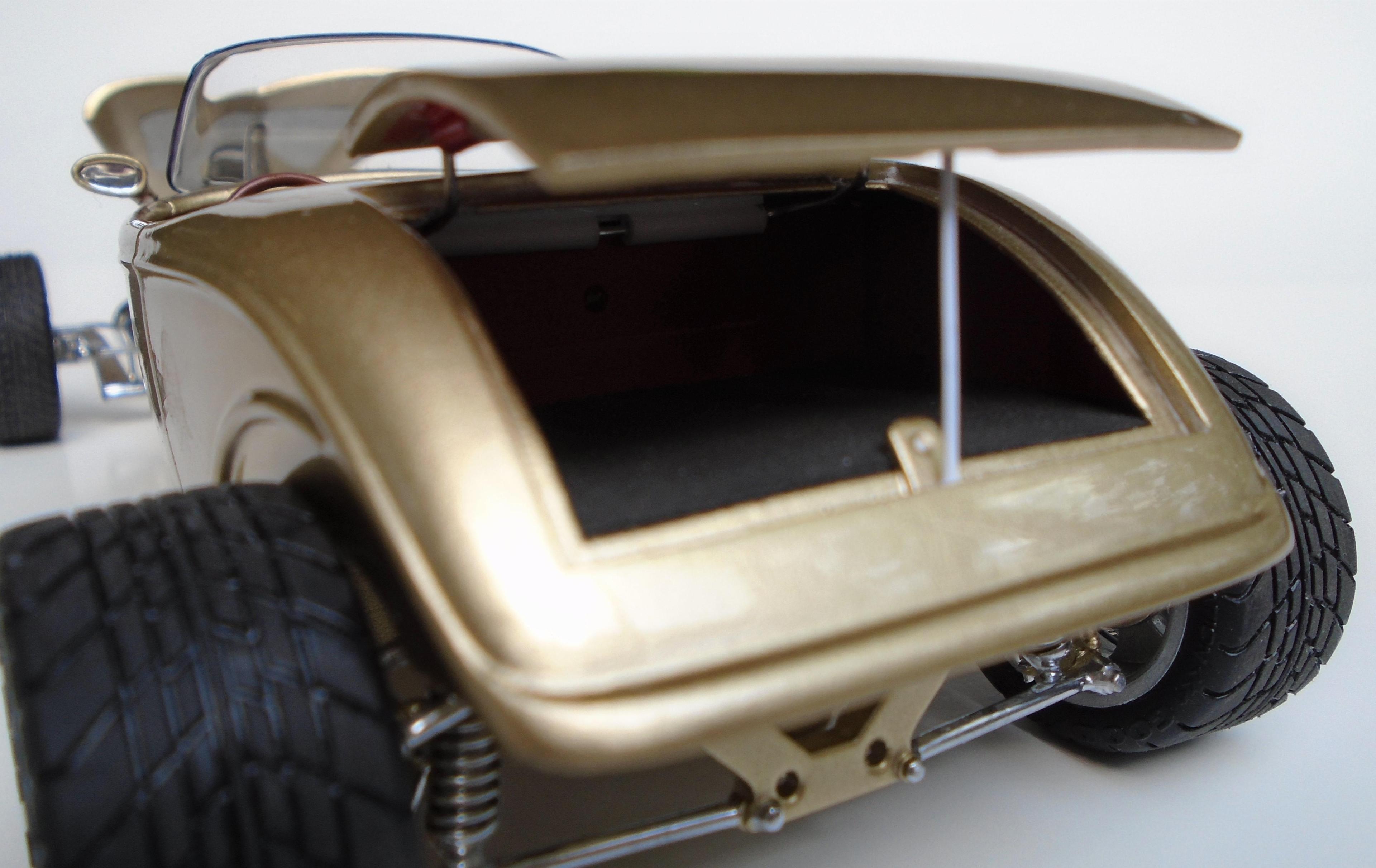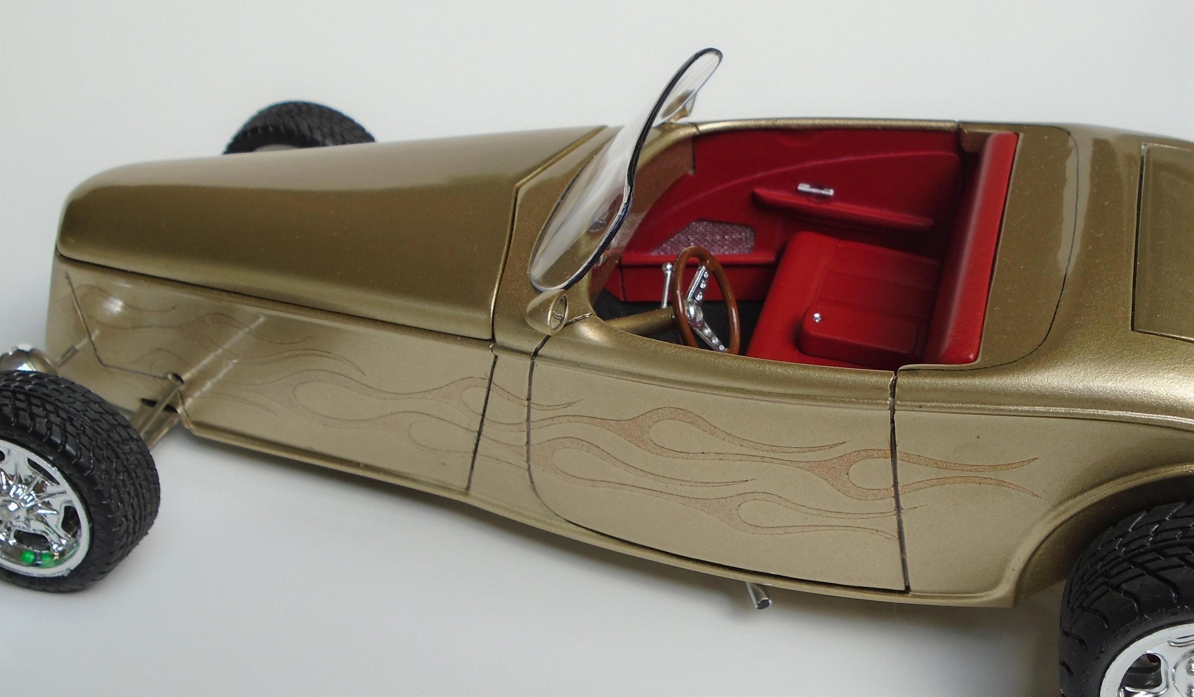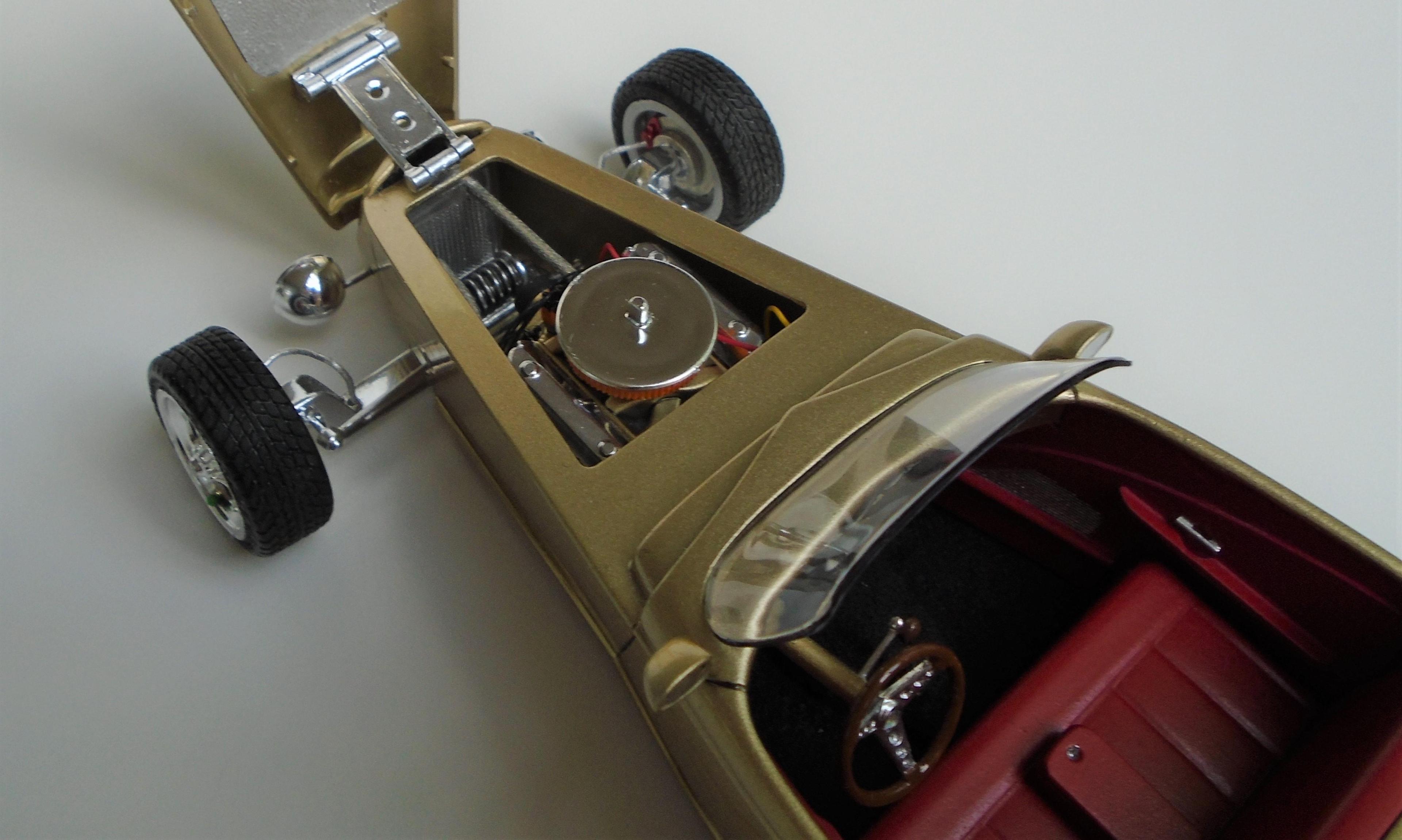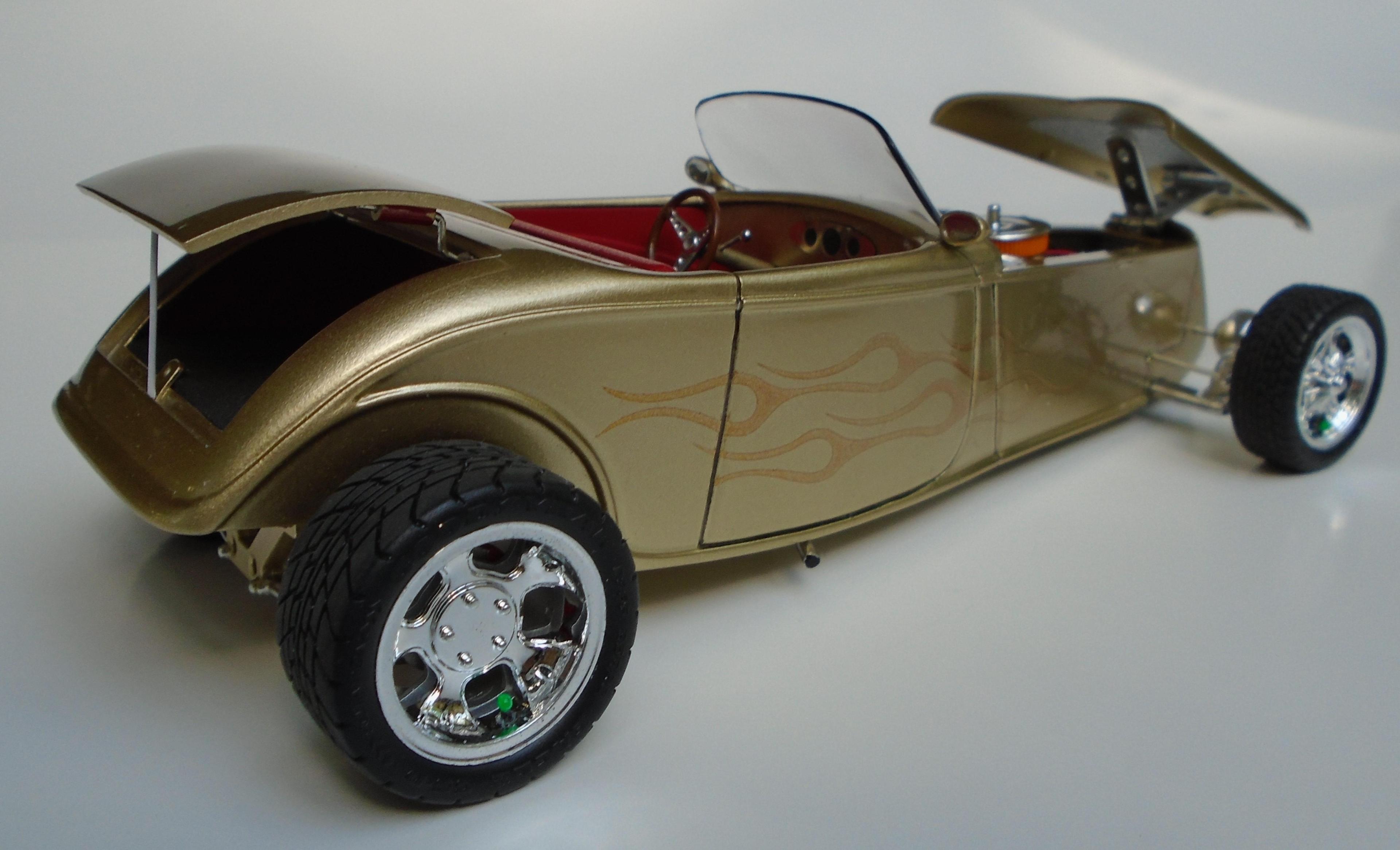 HI! Say what you want, Boyd and his numerous collaborators were a powerhouse for a while. I was mostly impressed by the string of unique coachbuilt cars that came out of his shop, via Marcel Delay Custom Metal in Corona. AMBR anyone? One car that floored me was the Ron Craft 33 roadster, precursor of the 33 Boydster as it may. And the unique IFS that Boyd created for Buz DiVosta Roadstar was impressive. So, why not pay hommage to all of the above? Start with Monogram's ZZ Top coupe, discard the roof, put on AMT's 36 Ford roadster upper cowl, Monogram's 35 Mercedes hood, and FD100 powertrain + Phantom Vicky rollingstock & Dodge Sidewinder IRS (all extensively modified). Scratchbuild the frame, IFS, floorpan, beltline reveal, hoodsides, dash,interior, hinges, etc. And throw in a few parts box leftovers. Metallic gold with ghost flames, Molotow chrome, and VOILÀ! Hope you like it. It was a long and tedious built! CT