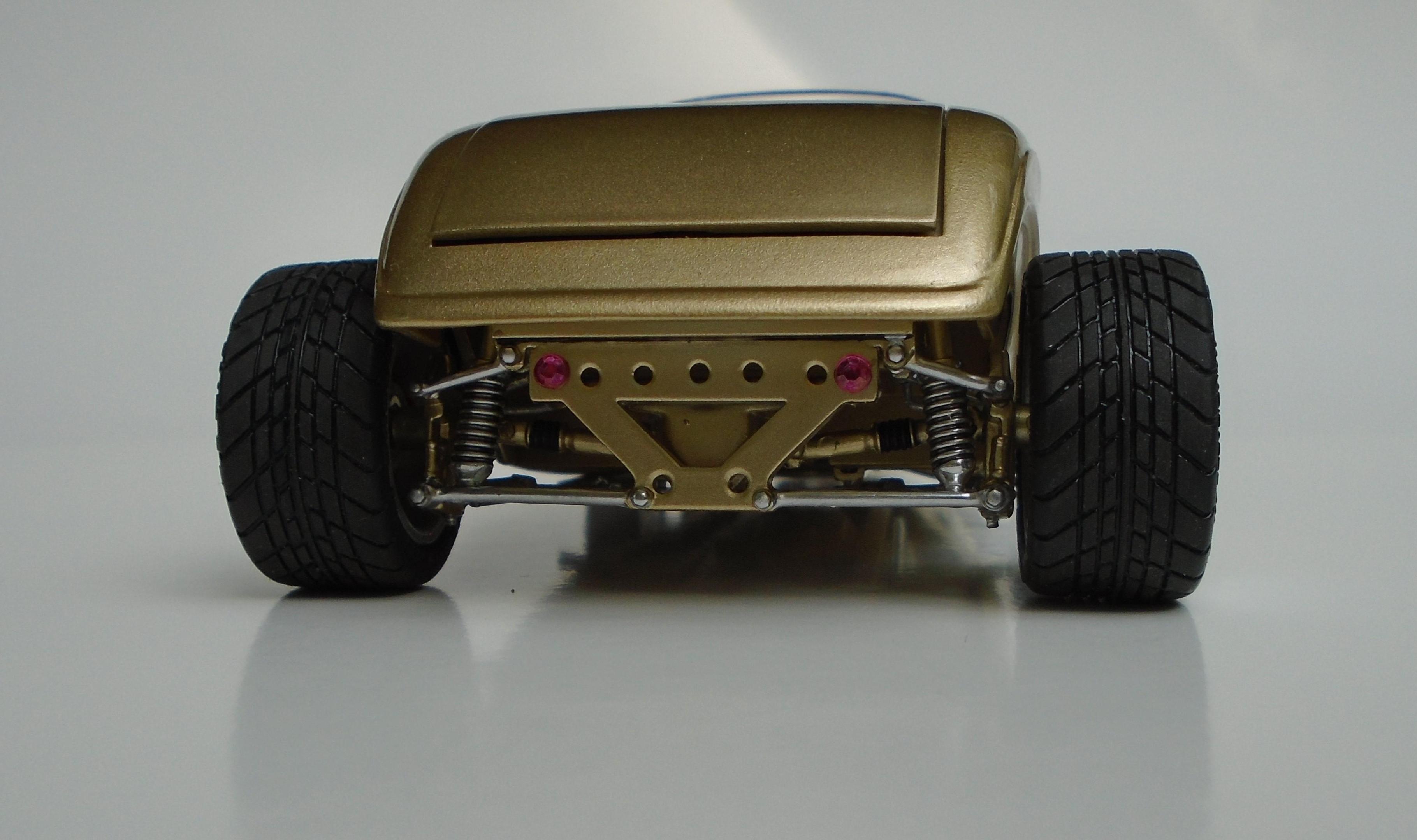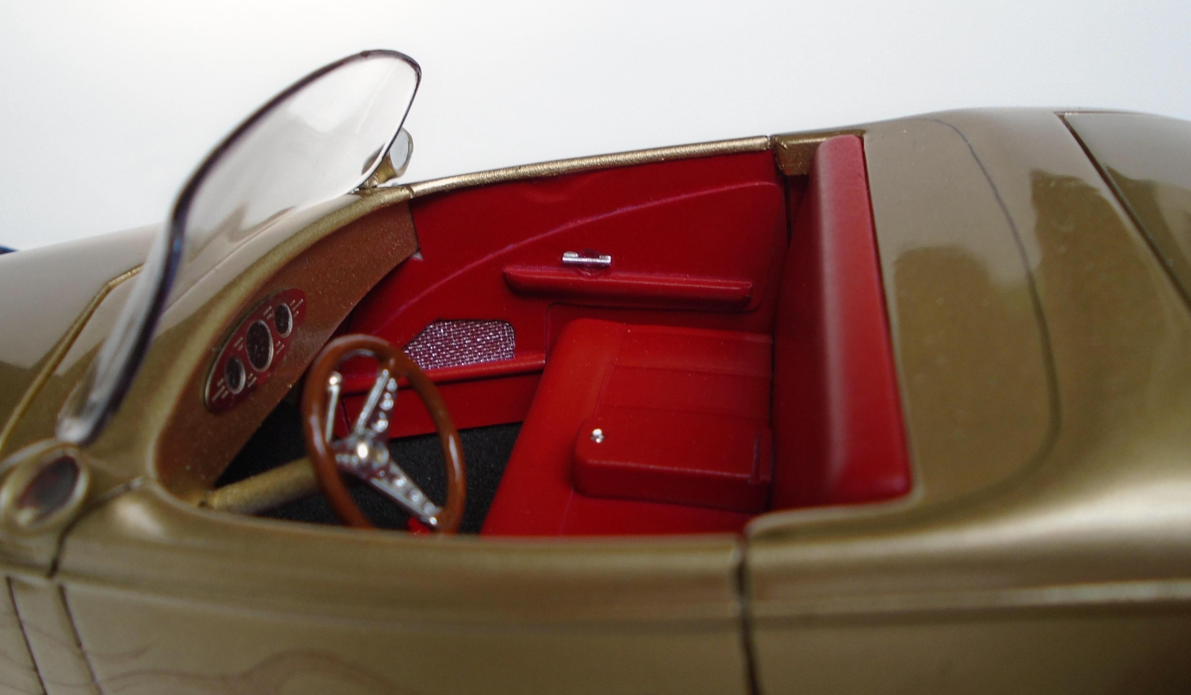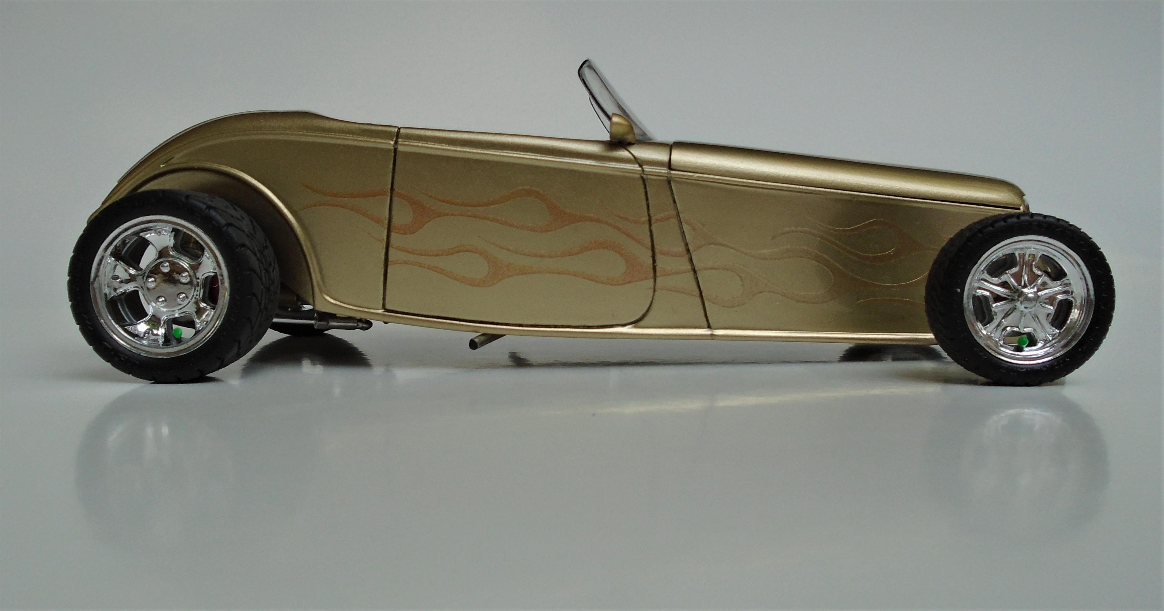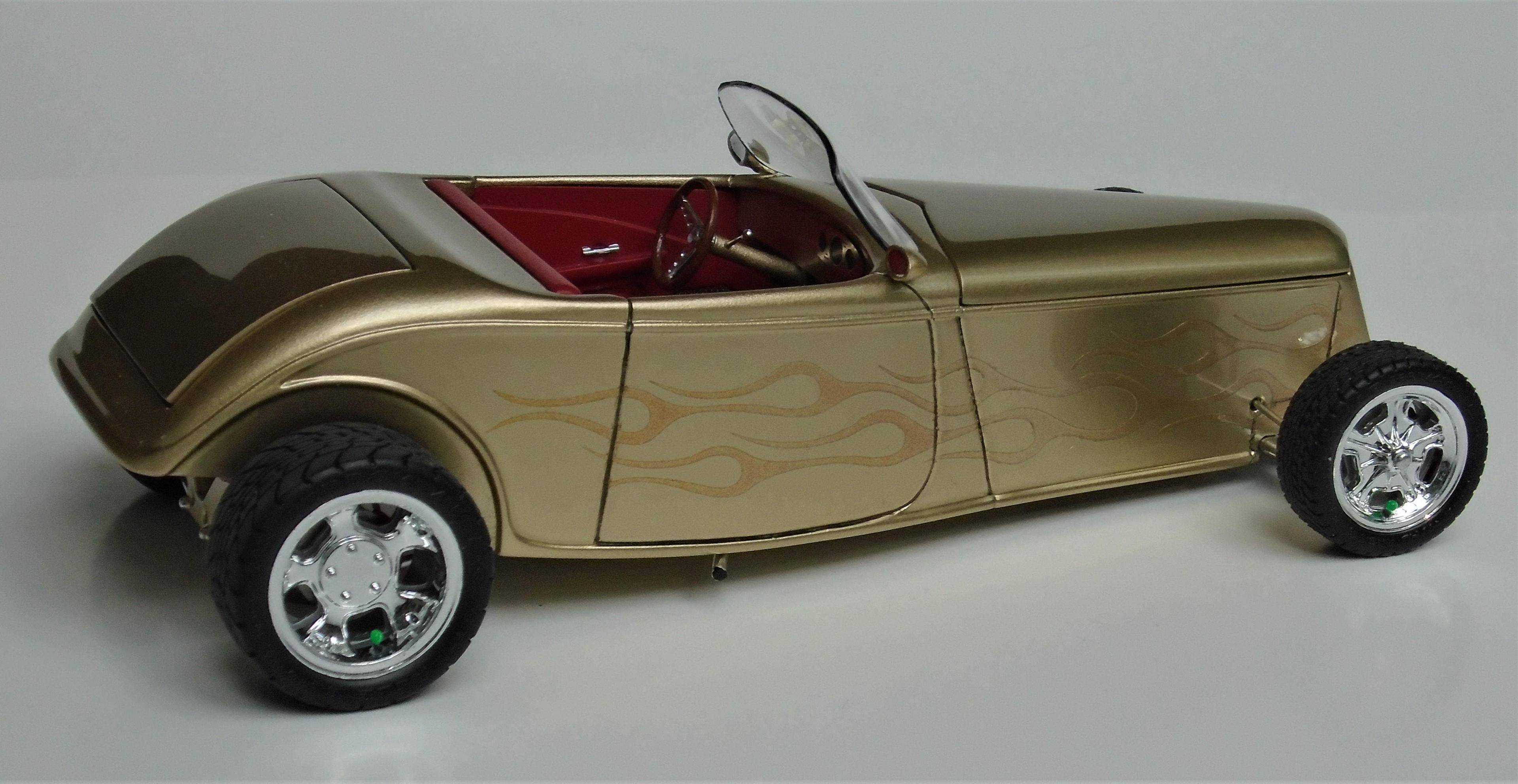 HI! Say what you want, Boyd and his numerous collaborators were a powerhouse for a while. I was mostly impressed by the string of unique coachbuilt cars that came out of his shop, via Marcel Delay Custom Metal in Corona. AMBR anyone? One car that floored me was the Ron Craft 33 roadster, precursor of the 33 Boydster as it may. And the unique IFS that Boyd created for Buz DiVosta Roadstar was impressive. So, why not pay hommage to all of the above? Start with Monogram's ZZ Top coupe, discard the roof, put on AMT's 36 Ford roadster upper cowl, Monogram's 35 Mercedes hood, and FD100 powertrain + Phantom Vicky rollingstock & Dodge Sidewinder IRS (all extensively modified). Scratchbuild the frame, IFS, floorpan, beltline reveal, hoodsides, dash,interior, hinges, etc. And throw in a few parts box leftovers. Metallic gold with ghost flames, Molotow chrome, and VOILÀ! Hope you like it. It was a long and tedious built! CT