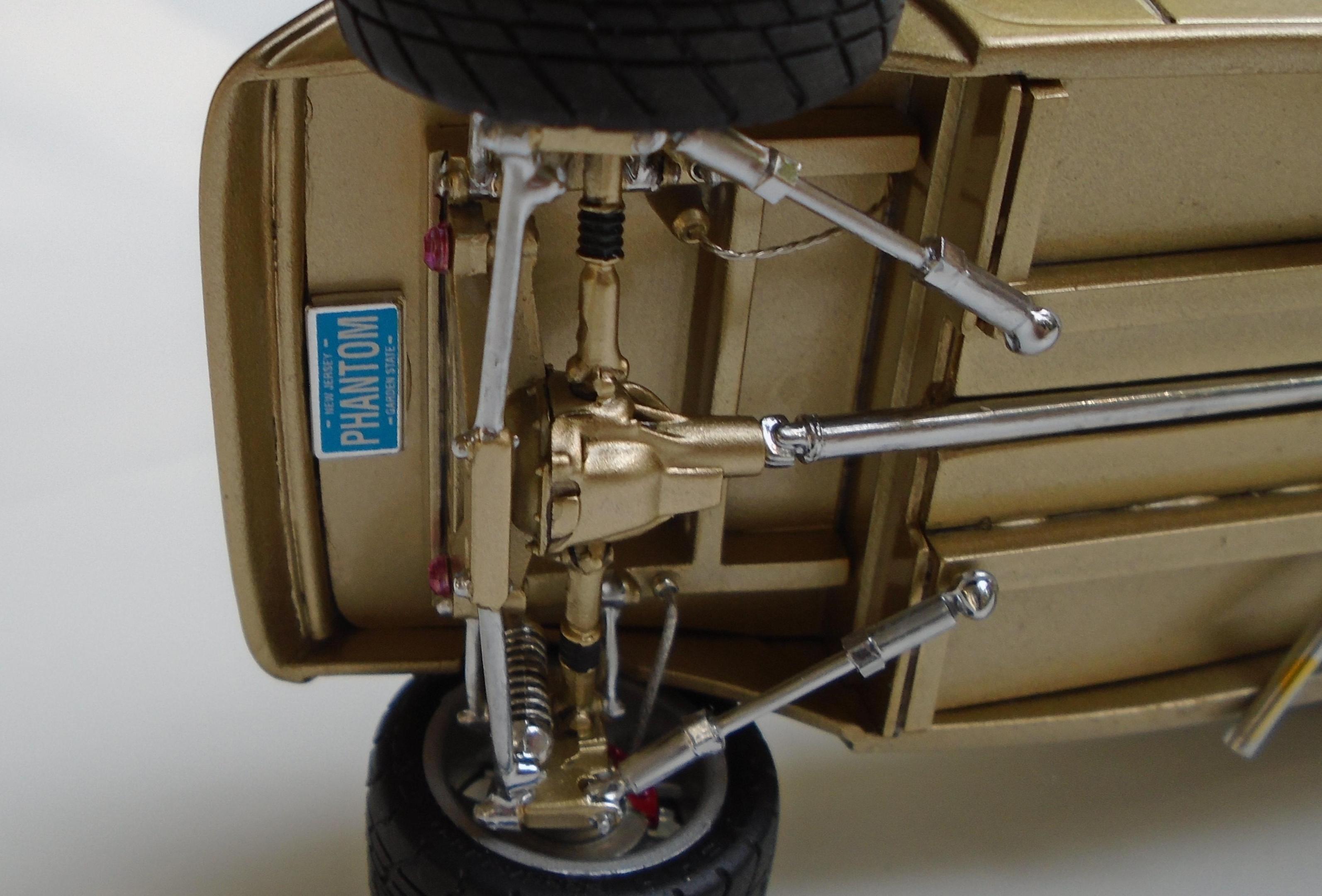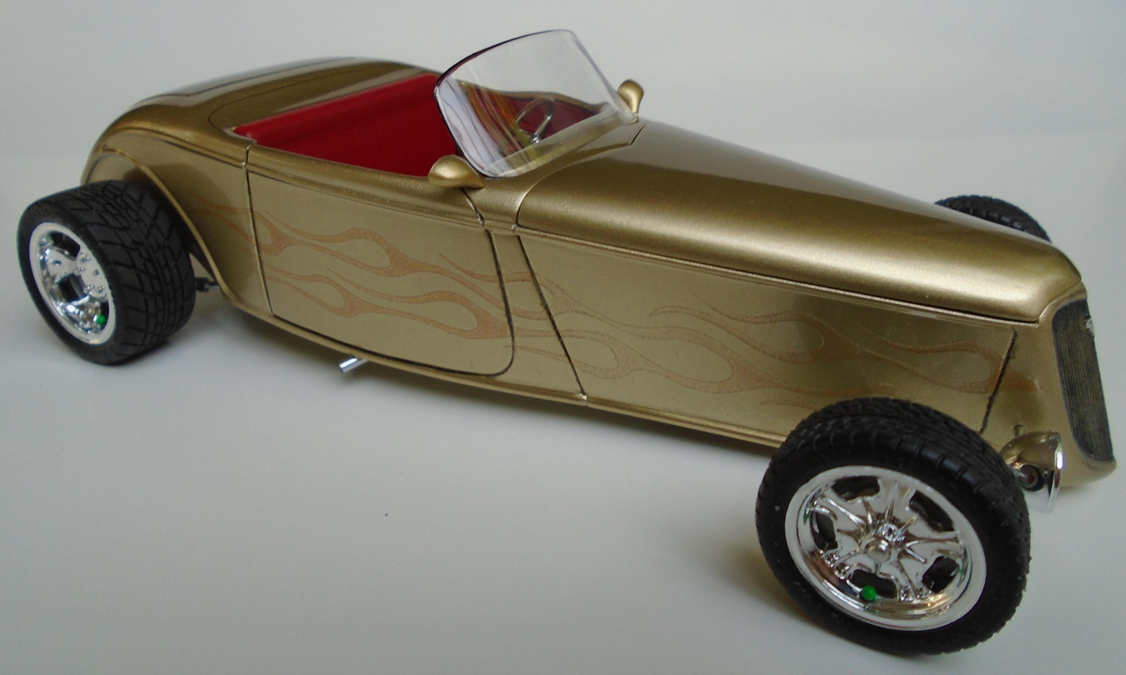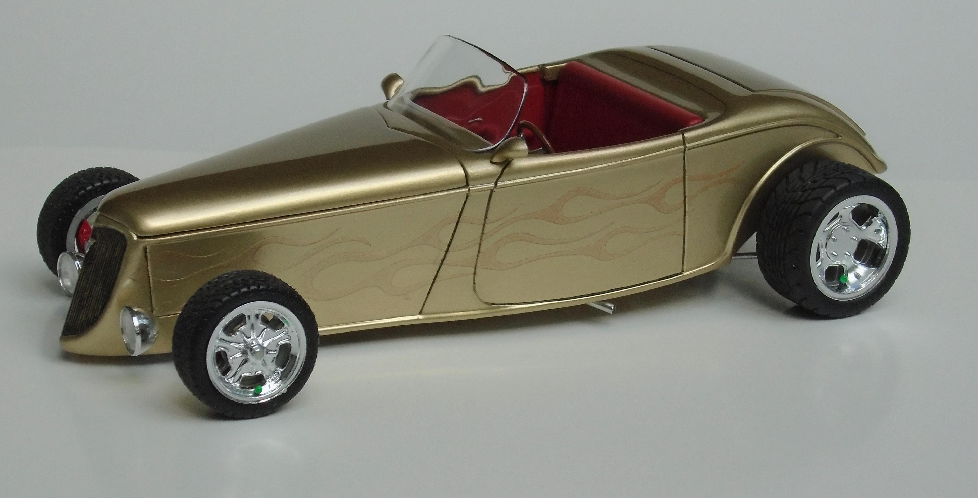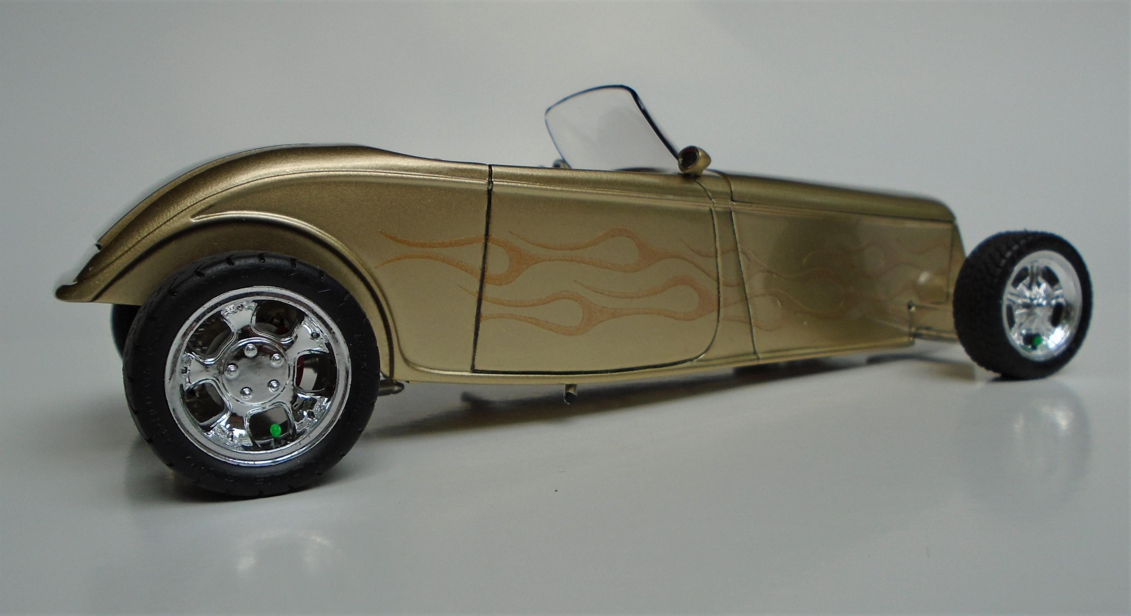 HI! Say what you want, Boyd and his numerous collaborators were a powerhouse for a while. I was mostly impressed by the string of unique coachbuilt cars that came out of his shop, via Marcel Delay Custom Metal in Corona. AMBR anyone? One car that floored me was the Ron Craft 33 roadster, precursor of the 33 Boydster as it may. And the unique IFS that Boyd created for Buz DiVosta Roadstar was impressive. So, why not pay hommage to all of the above? Start with Monogram's ZZ Top coupe, discard the roof, put on AMT's 36 Ford roadster upper cowl, Monogram's 35 Mercedes hood, and FD100 powertrain + Phantom Vicky rollingstock & Dodge Sidewinder IRS (all extensively modified). Scratchbuild the frame, IFS, floorpan, beltline reveal, hoodsides, dash,interior, hinges, etc. And throw in a few parts box leftovers. Metallic gold with ghost flames, Molotow chrome, and VOILÀ! Hope you like it. It was a long and tedious built! CT