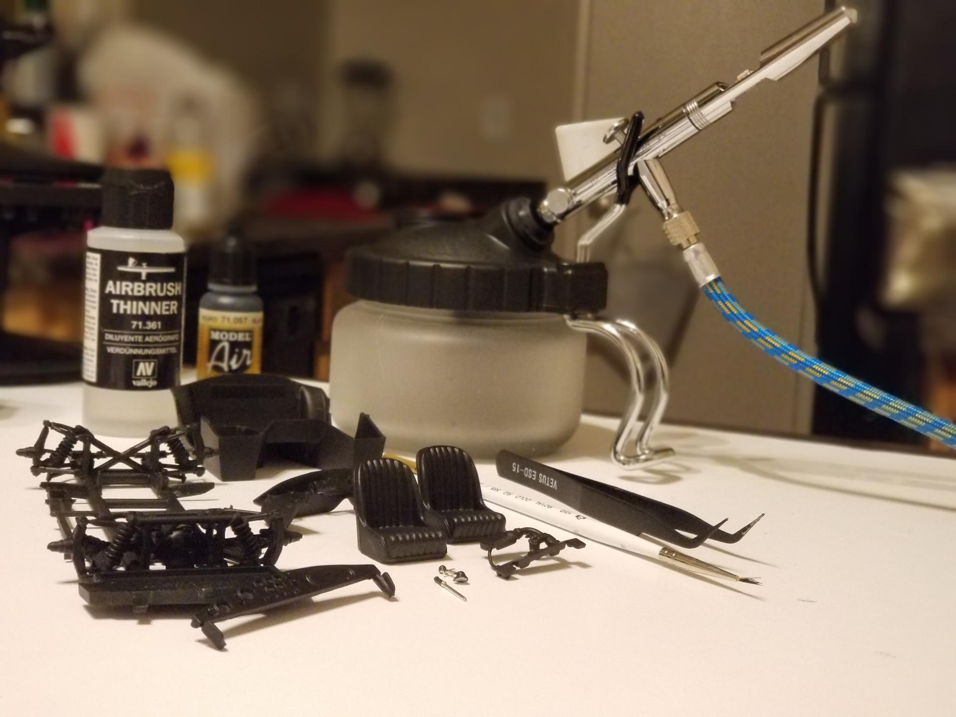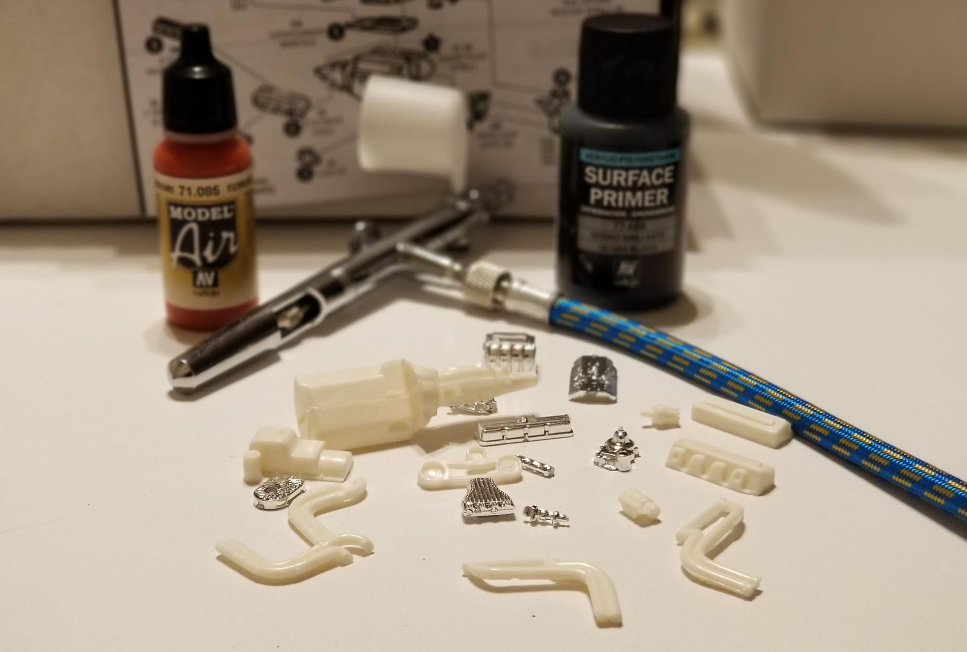 Hi, I've been lurking the forums for tips in how to get started in the hobby and the tools and supplies I would need. I finally started my first model so I thought I would subscribe and post the progress. I settleled for a Level 2 Monogram Shelby cobra, but I didnt want to replicate the model on the box so I made a few changes. I used a different engine from another car, with a blower so I had to mod the hood of the shelby to accomodate the engine. Also the color I wanted a metallic orange, but I didnt have any so I mixed 3 parts Vallejo Orange with 1 part vallejo cooper and I think that did the trick. Also different style wheels. I had to learn to use the airbrush on the fly so the paint jobs are probably not the best lol. Anyway here it goes. The choosen one All these parts, almost gave up before even starting... Interior and chassis first Finished interior Startung the engine Engine and chassis done