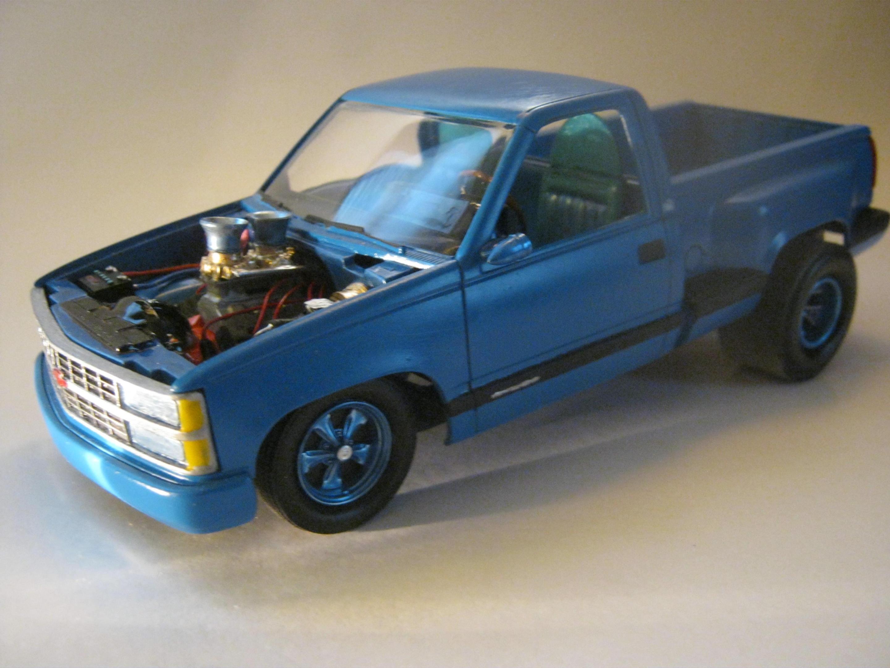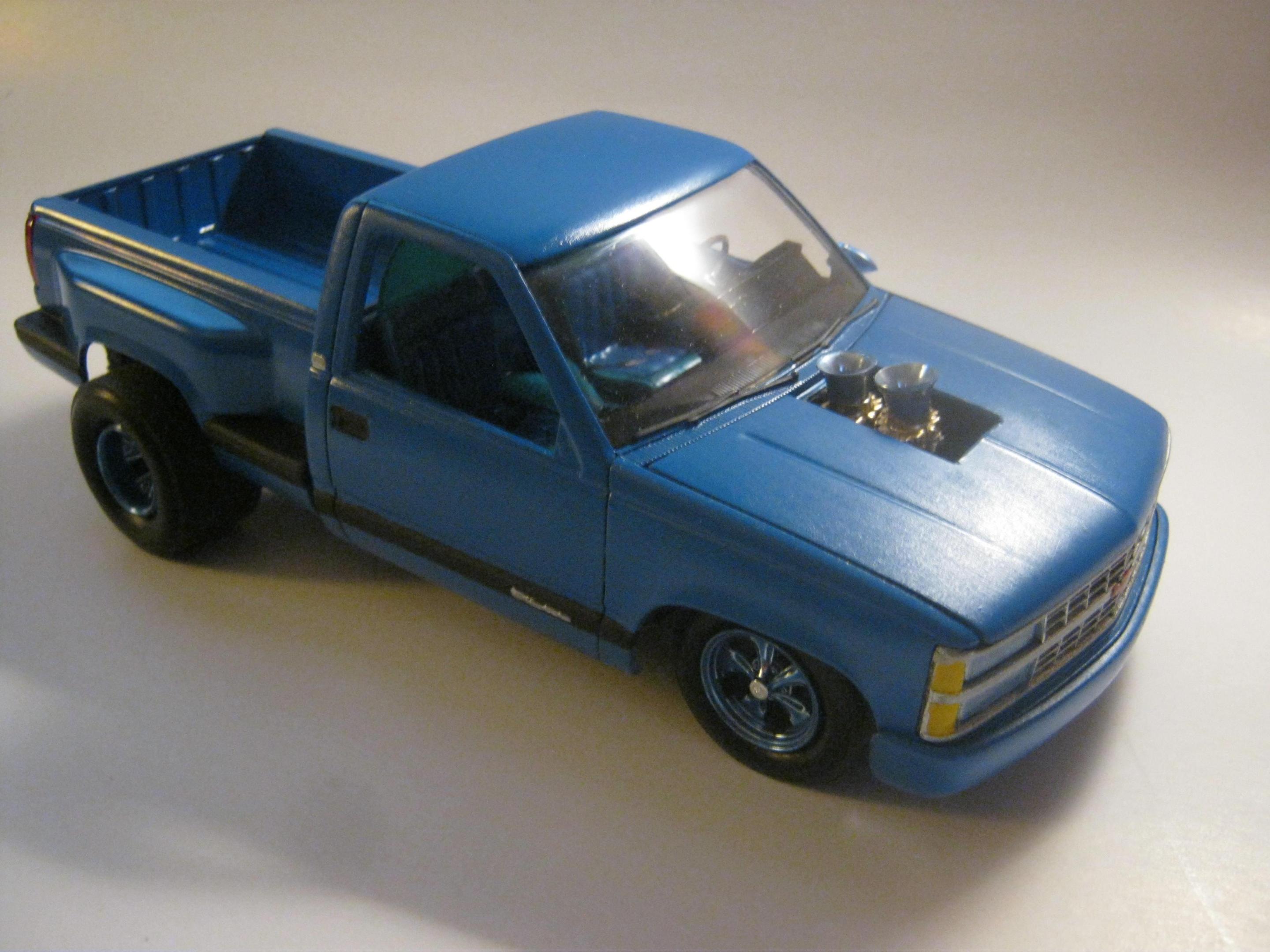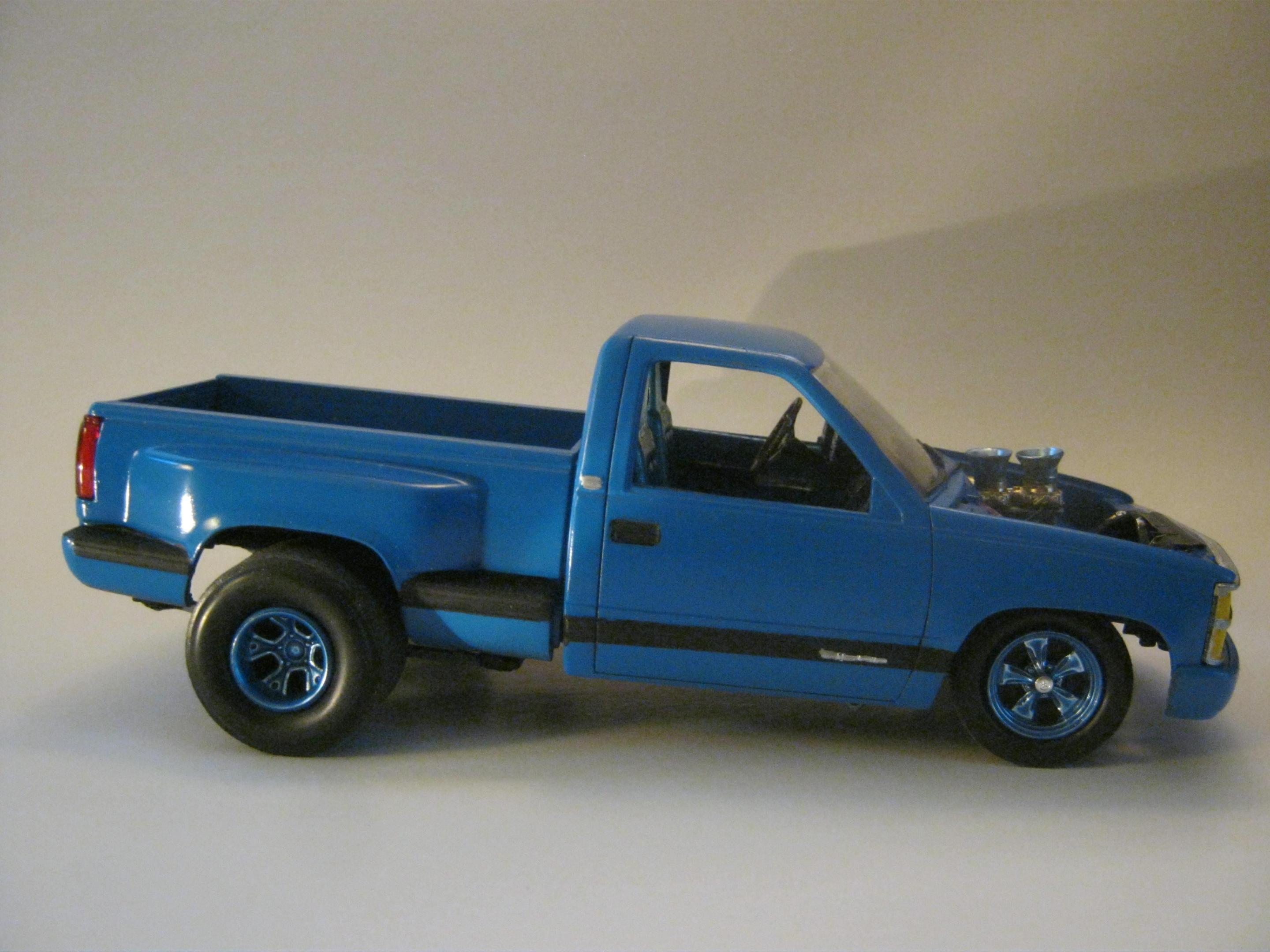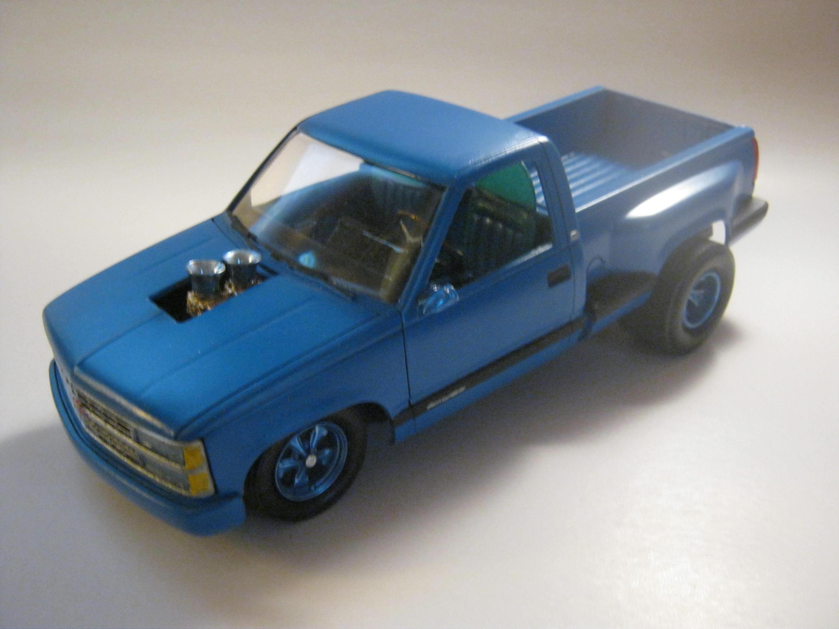 Happy spring all,,finally getting warmer so just gettin a few things off the bench. This is I believe a 1990's early 2000's Chevy kit from the AMT Hot Trucks 3 pack kit. But he wanted a Hemi,,so,,let it be. Got this at a swap meet years ago,,5$ glue blob in a ziplock bag,,1/2 built and painted. I added some different tires+ rims, Put A HEMI Hi-rise duel carb from the junk leftovers bx,,,made it kindof a street/strip truck. Would also make a good pulling truck if I ran the headers upright thru the hood. Painted w/hardware store paint,,and hand painted rest. One thing for sure,,the back tires would last about 3 days on this,,lol Cheers S