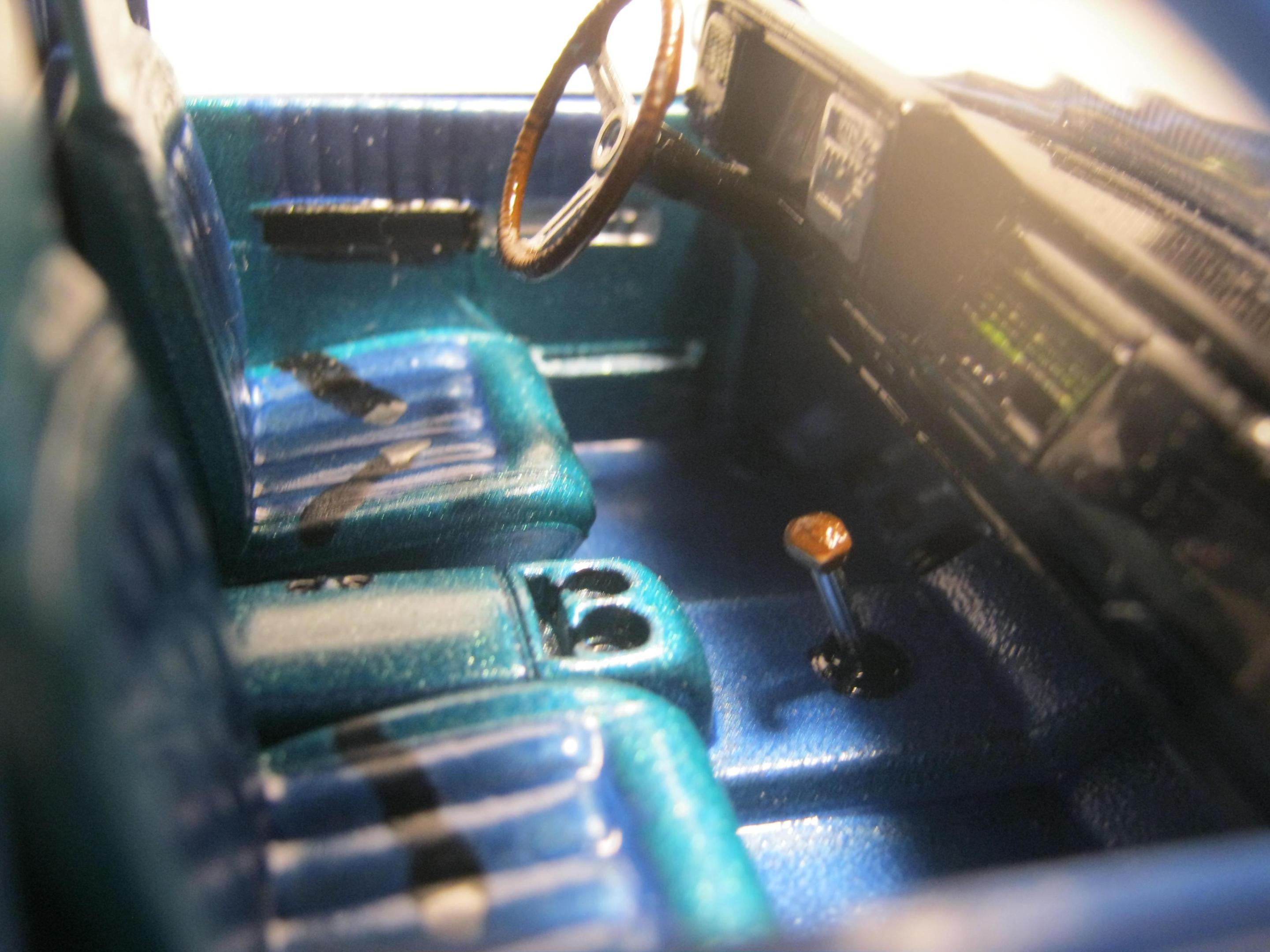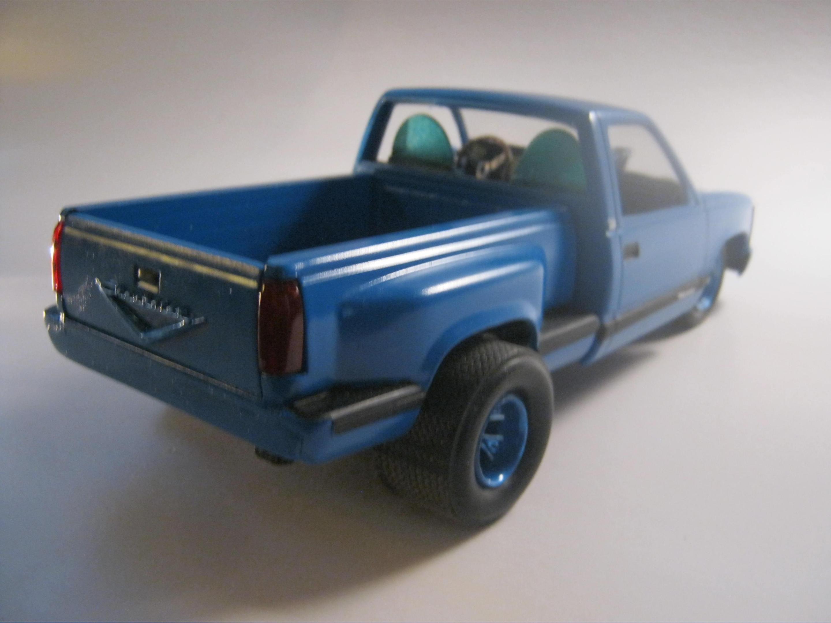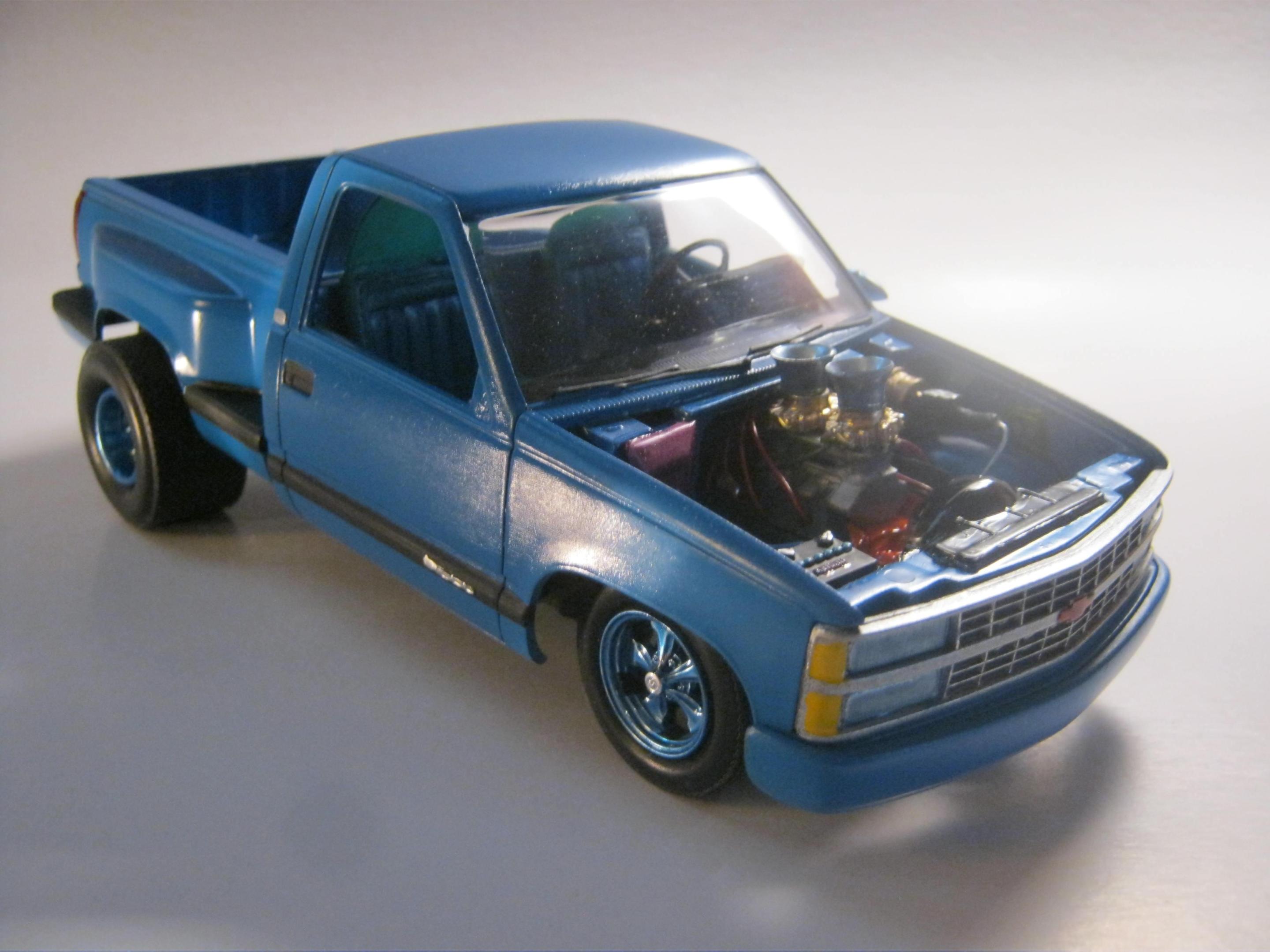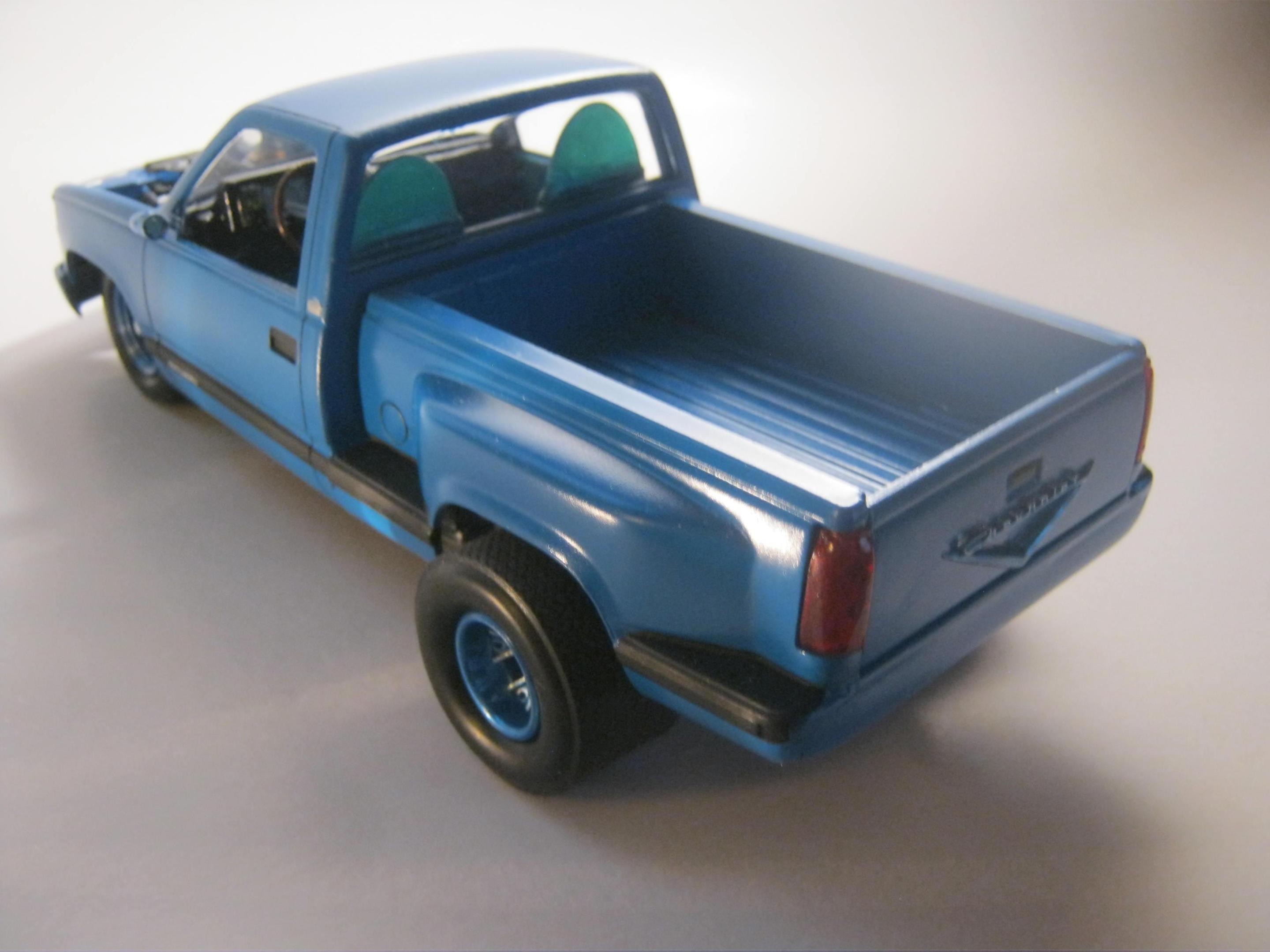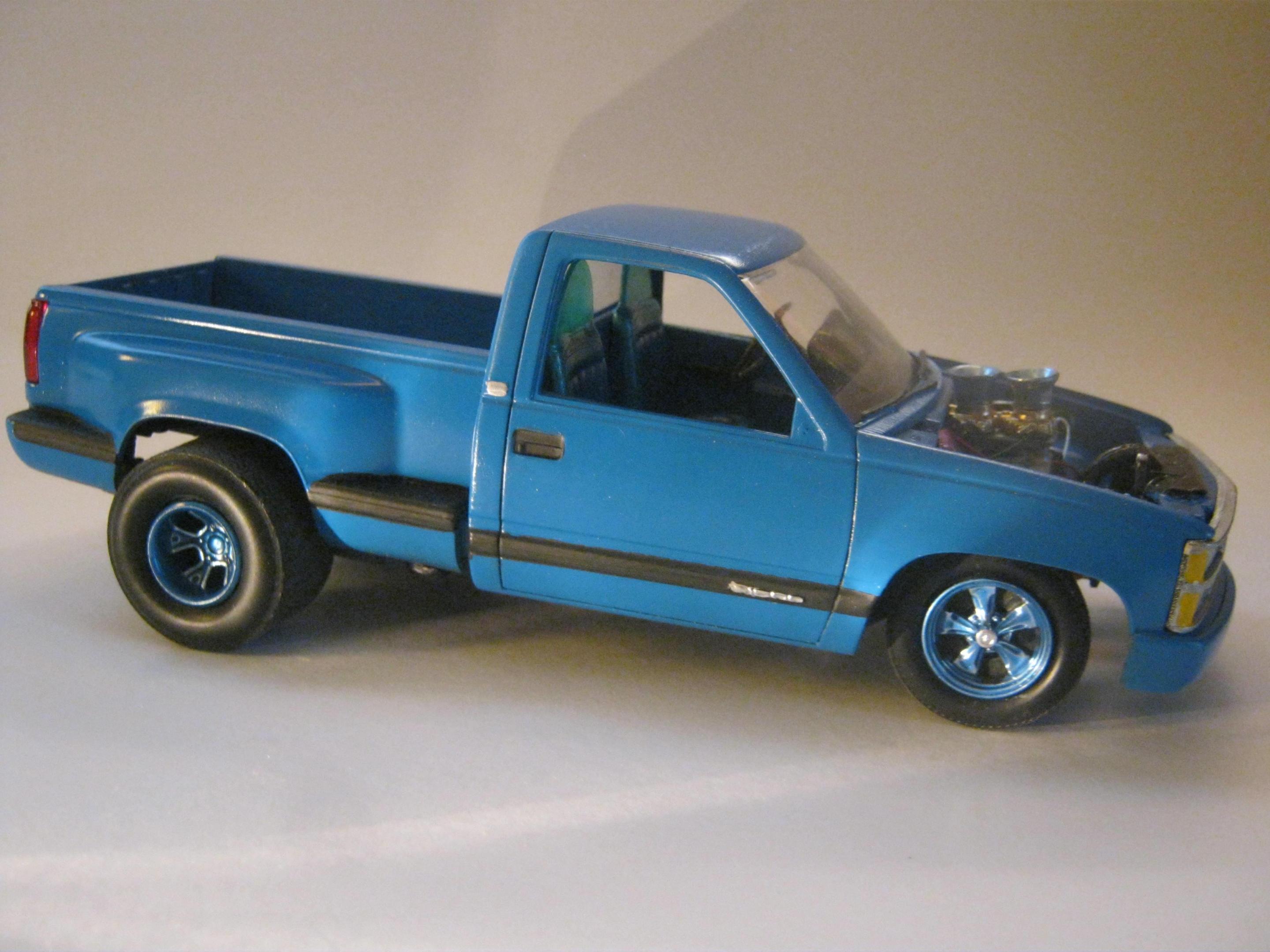 Happy spring all,,finally getting warmer so just gettin a few things off the bench. This is I believe a 1990's early 2000's Chevy kit from the AMT Hot Trucks 3 pack kit. But he wanted a Hemi,,so,,let it be. Got this at a swap meet years ago,,5$ glue blob in a ziplock bag,,1/2 built and painted. I added some different tires+ rims, Put A HEMI Hi-rise duel carb from the junk leftovers bx,,,made it kindof a street/strip truck. Would also make a good pulling truck if I ran the headers upright thru the hood. Painted w/hardware store paint,,and hand painted rest. One thing for sure,,the back tires would last about 3 days on this,,lol Cheers S
