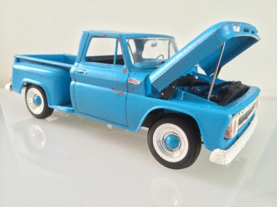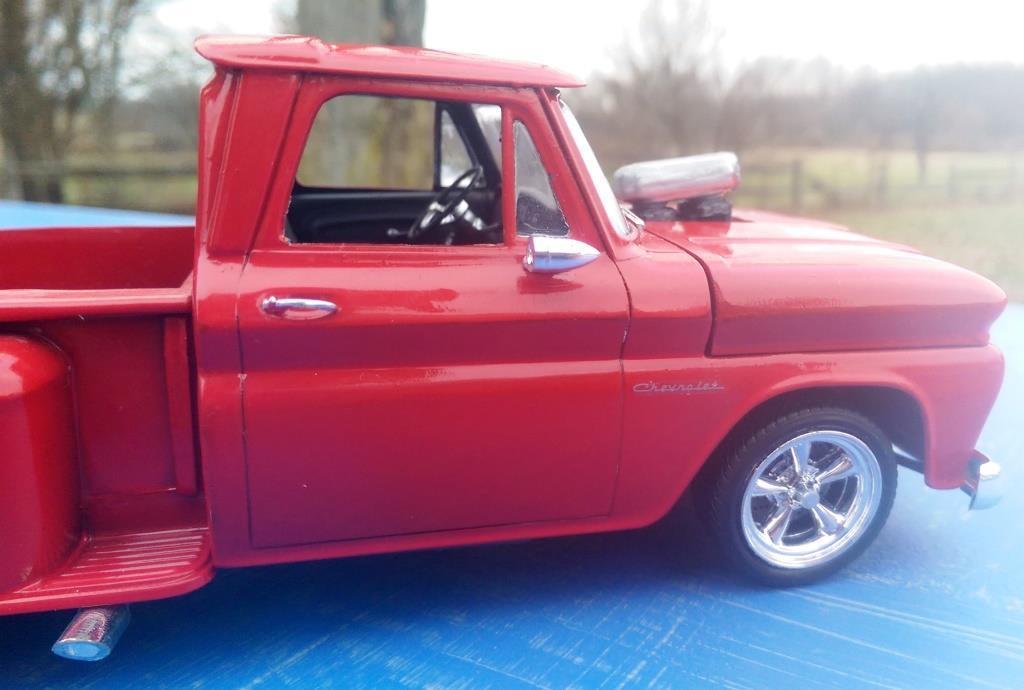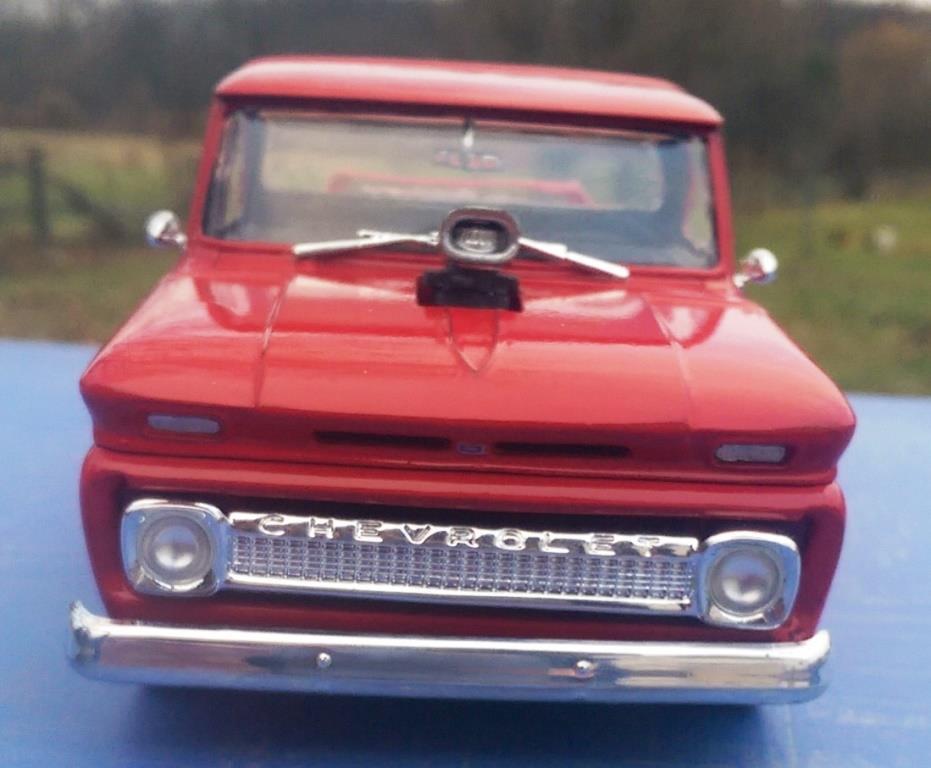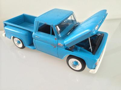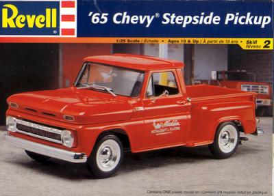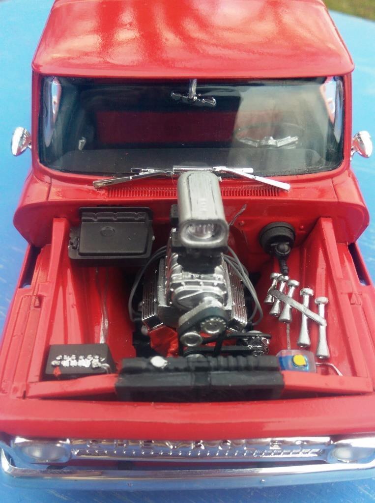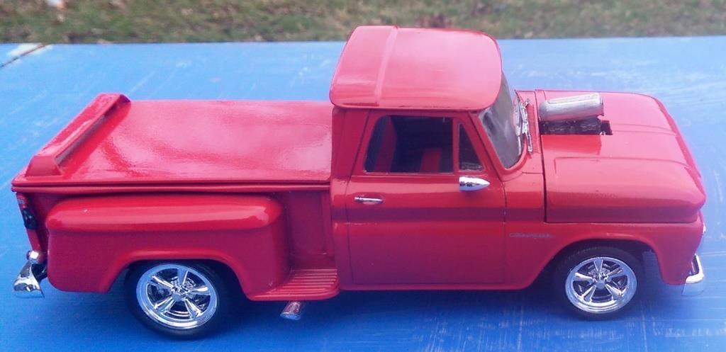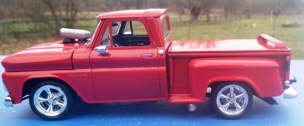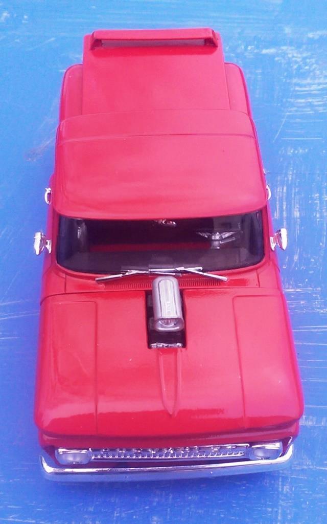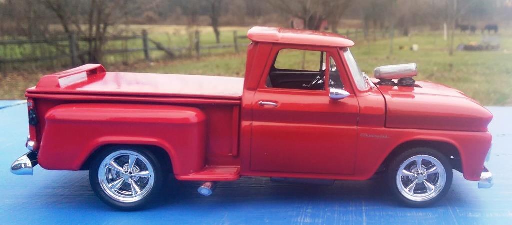 This truck was supposed to be a quick build, something to tow the trailer with my 68 Mustang Drag (Link) on it. I quickly purchased the Revell '65 Chevy Stepside Pickup 2 'n 1 to take the place of an AMT 1953 Ford Pickup Street Machine that I simply failed at when building. I was going to make the custom version of the truck straight out of the box and paint it with the same rattle can red as what I painted the trailer it is going to be towing. However if you look at the pictures you will soon discover that I got a bit carried away with some customizing of my own. I went through my parts box and managed to find the stuff to put a supercharger and such on top of the engine. As you notice I also found am air horn...so I put it in the extra space in the engine compartment. I then looked over and saw a piece of styrene laying on the desk and decided that a truck like this needed a fiberglass tonneau cover over the bed. I made a custom spoiler for the cover also. I could not leave the bed alone and had to put some wood and strips of styrene painted chrome. The mirrors are from the 68 Mustang (who needs mirrors on a drag car anyway??). (the truck is straight, the board it is on is not) The last thing I did to finish the custom job on this truck was to put a custom exhaust on the bottom. I used some solder to make the pipes and added to round styrene for the mufflers. Once again I stole something from the 68 Mustang, the exhaust tips finish it out, don't you think? Thanks for looking