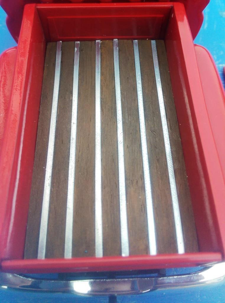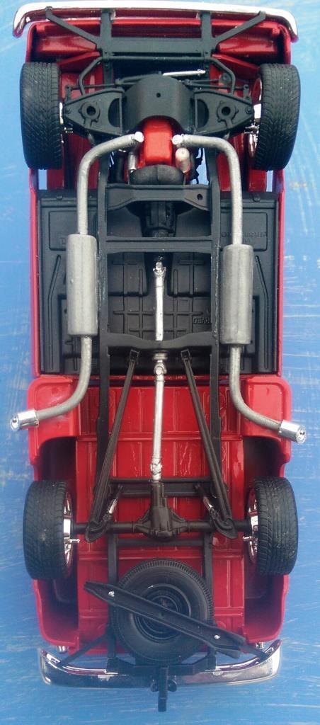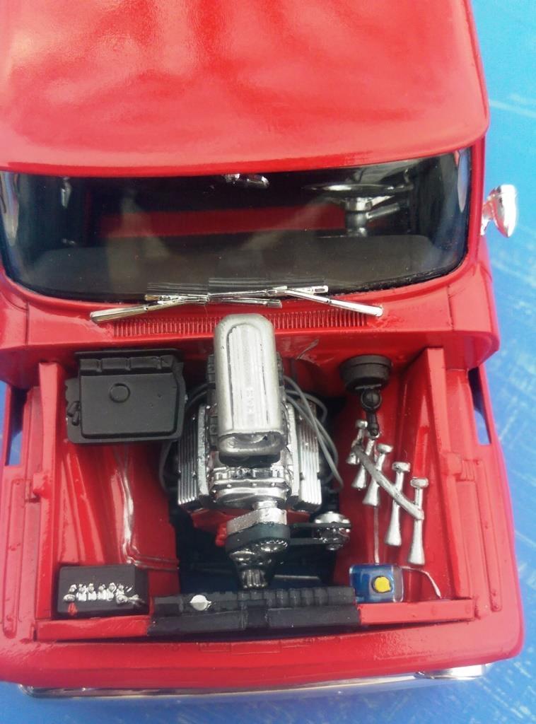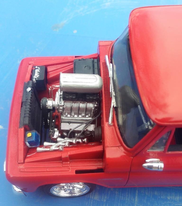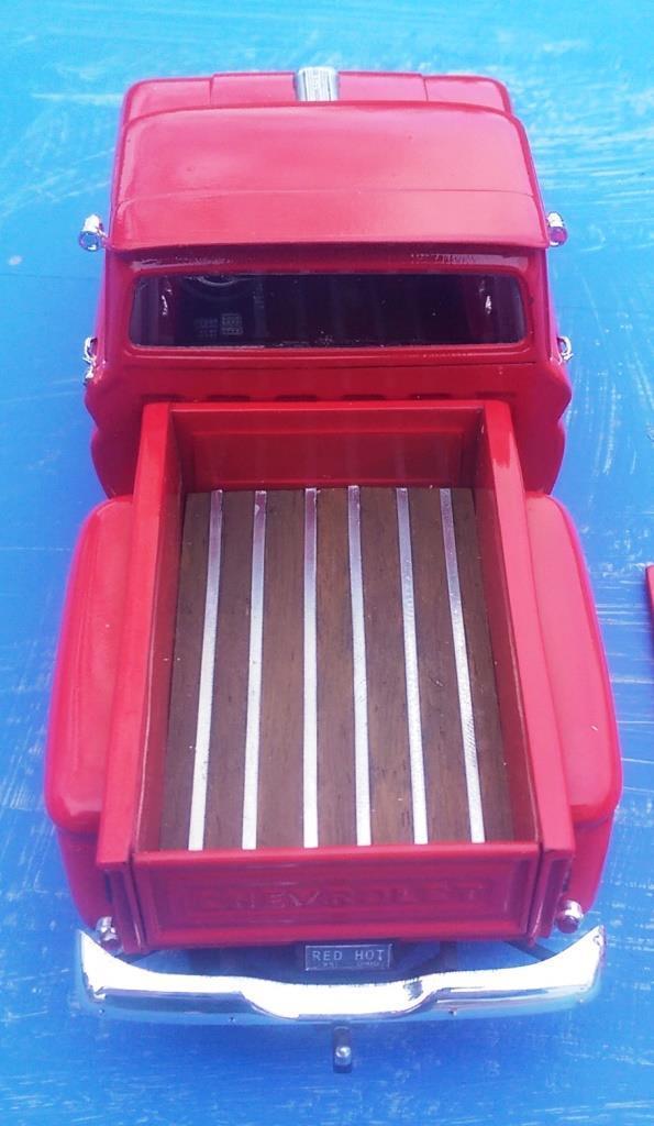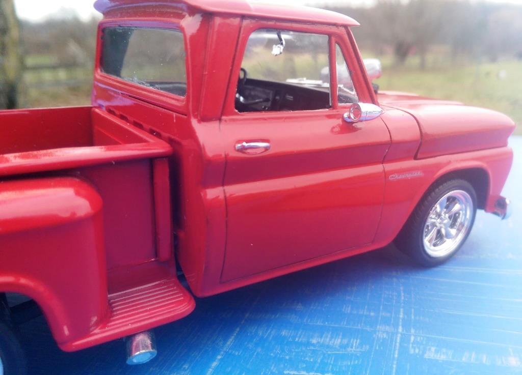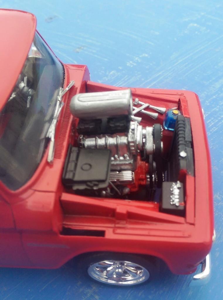 This truck was supposed to be a quick build, something to tow the trailer with my 68 Mustang Drag (Link) on it. I quickly purchased the Revell '65 Chevy Stepside Pickup 2 'n 1 to take the place of an AMT 1953 Ford Pickup Street Machine that I simply failed at when building. I was going to make the custom version of the truck straight out of the box and paint it with the same rattle can red as what I painted the trailer it is going to be towing. However if you look at the pictures you will soon discover that I got a bit carried away with some customizing of my own. I went through my parts box and managed to find the stuff to put a supercharger and such on top of the engine. As you notice I also found am air horn...so I put it in the extra space in the engine compartment. I then looked over and saw a piece of styrene laying on the desk and decided that a truck like this needed a fiberglass tonneau cover over the bed. I made a custom spoiler for the cover also. I could not leave the bed alone and had to put some wood and strips of styrene painted chrome. The mirrors are from the 68 Mustang (who needs mirrors on a drag car anyway??). (the truck is straight, the board it is on is not) The last thing I did to finish the custom job on this truck was to put a custom exhaust on the bottom. I used some solder to make the pipes and added to round styrene for the mufflers. Once again I stole something from the 68 Mustang, the exhaust tips finish it out, don't you think? Thanks for looking