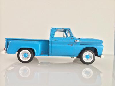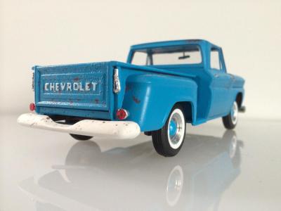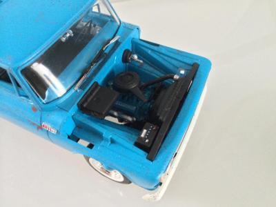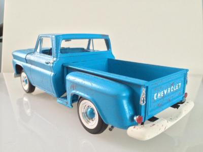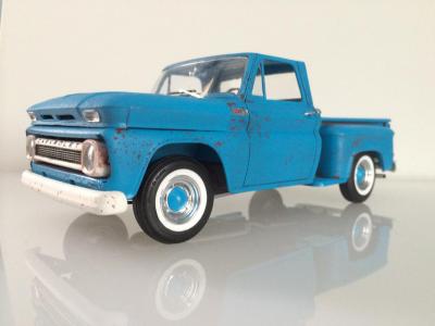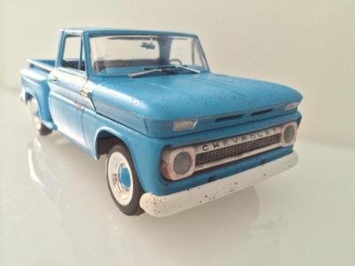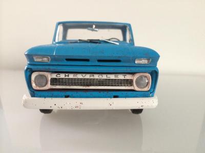 I bought this for a few bucks at a thrift store recently, no box or instructions, just the parts in a large ziploc bag. Been working on it for the last few weeks and finally finished it this weekend. I stayed up til 4:30 in the morning Saturday night, listening to the nuts on Coast to Coast AM on the radio and working on the kit and had a blast. Nothing like "me" time. It isn't perfect, but it's done. One of my favorite shows is Fast 'N Loud and I especially enjoy when they take an older vehicle and redo the brakes, interior and electric, drop in a new crate engine and tires, then seal the rusty paint to keep the patina. I used the salt technique I learned from this forum. While the salt was drying on the primer, the salt got wet during a humid night and it didn't come out exactly as planned, but I can live with it. For a skill level 2, there were a lot of parts in this detailed kit. I love the look of body color steelies and chrome center hubs, but I thought I'd do something different. Initially I was going to use a different wheel / tire combo, but the Revell kit has the "pop on" type of wheels and I simply had no replacement for them. Since this is a work truck and nothing fancy, I dechromed the bumpers using Eazy Off oven cleaner and painted them flat white (first time dechroming for me). I used a drug store watercolor set to add rust and fill in the grill. Had I to do it over again, I would have painted the engine a different color and painted the engine bay flat black. There are imperfections (the side badge slipped after gluing it, among other things) and there are a few pieces I omitted (side view mirrors, among others) but I think I'm relatively happy with the outcome. Next build will probably be my take on the Rat Roaster.