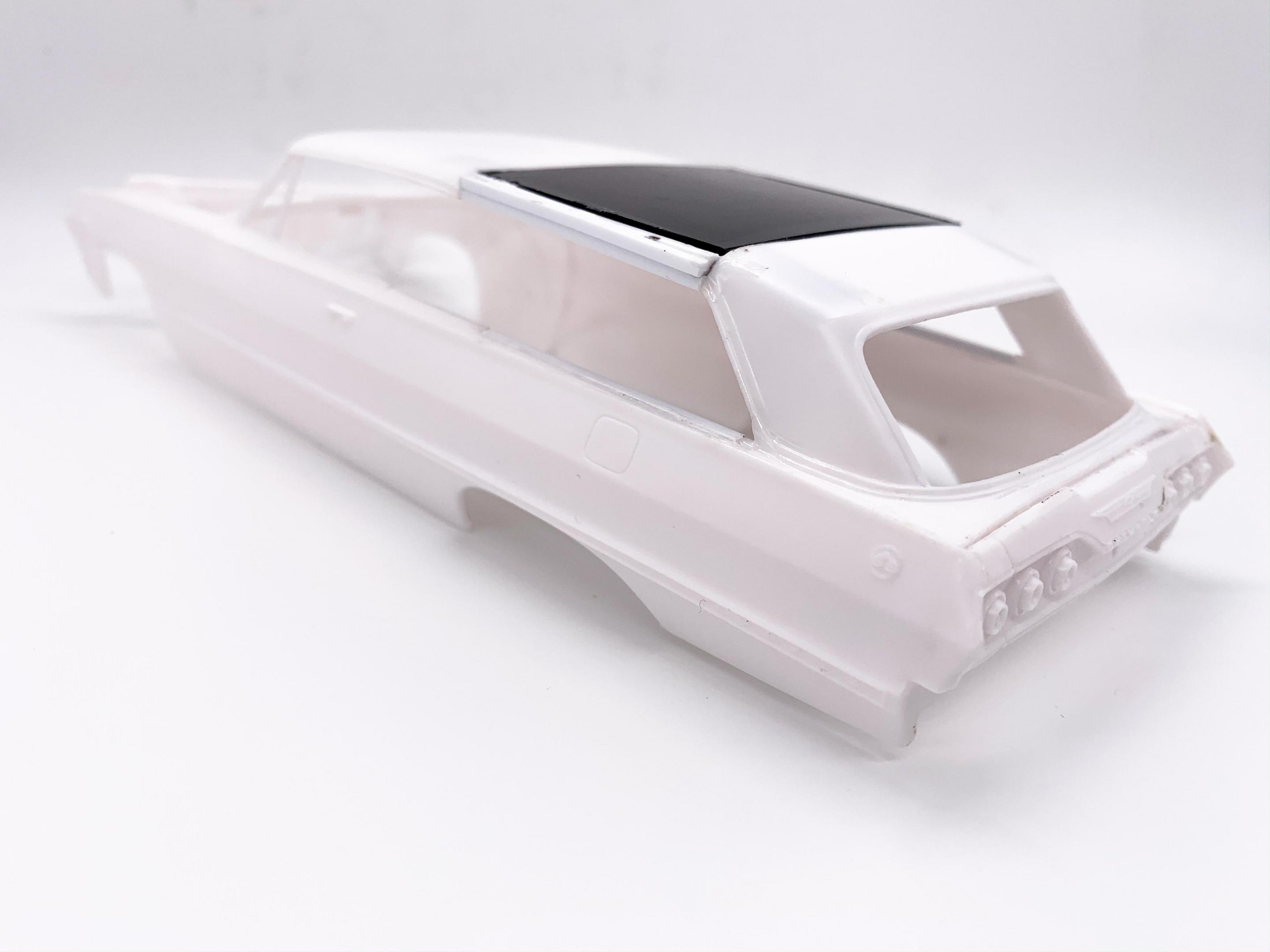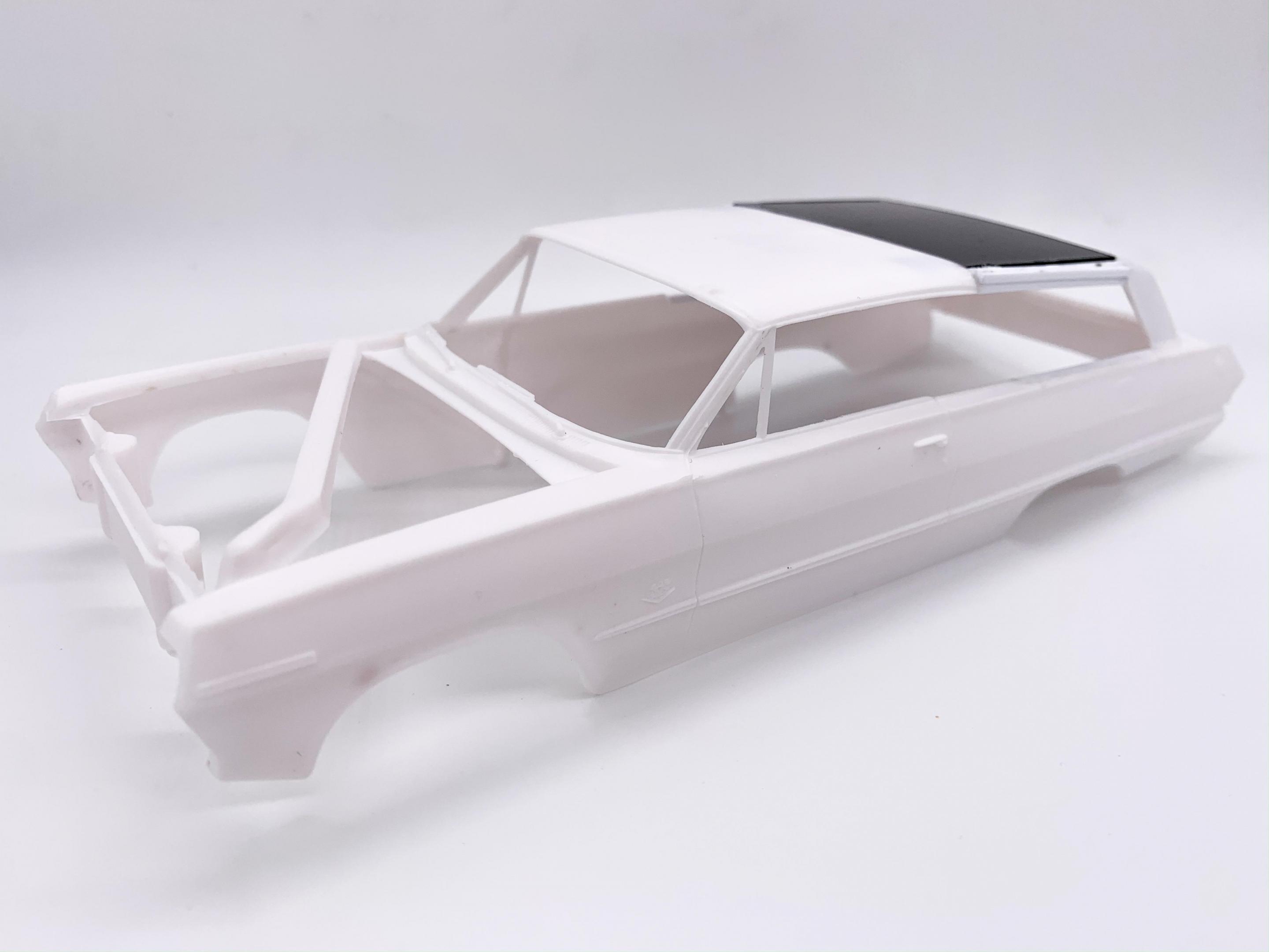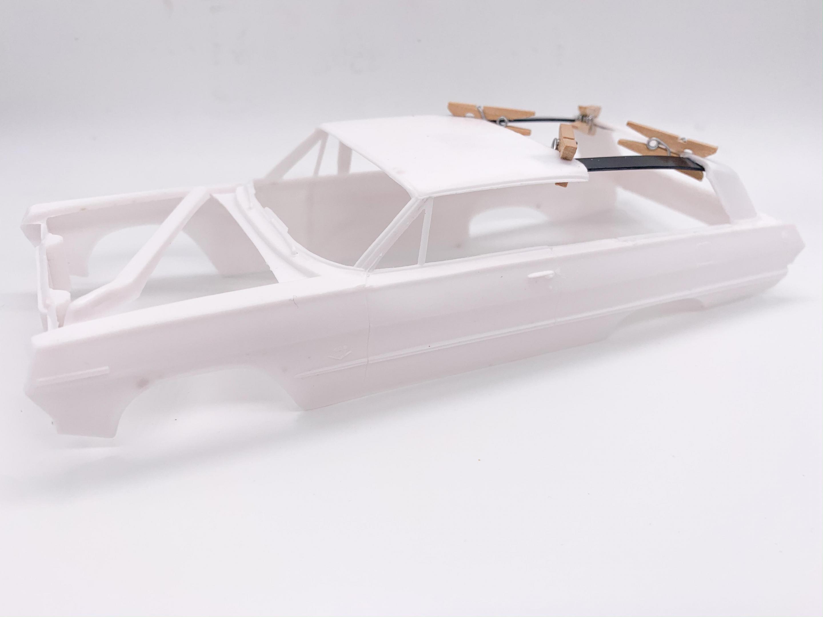 So, the web theme for NNL East this year is the AMT 63 Impala kit that was reissued last year: I did some brainstorming on what to do and was pretty much set on doing some form of drag car with the kit, until I saw this 63 online: I think it’s a hearse conversion, but it’s retained the low roofline of the stock car, and seems to be a sedan which has had the rear window moved back and the roof lengthened rather than using the more-logical (but rarer, I assume?) station wagon as a basis. Then, I fell down a rabbit hole of reading about the interesting world of ‘street freaks’... ...and a plan was born! I figured a street freak version of that hearse would be a pretty interesting build, and I liked the idea of combining some of those gasser influences into a street car. A quick mockup before I started hacking plastic... I can already tell that this build is going to involve more scratch building than I planned on, not least because the kit chassis has almost everything moulded in, but I’ll start with the fun stuff. My plan is similar to what the builder of that 1:1 seems to have done - just lengthen the roof and slide that rear window right back. Used my new Tamiya scriber, mostly, to score some lines like so... Then removed the rear deck lid from the section I’d removed: And reattached the rear window portion as far back as it would go: Those black styrene strips are to keep it aligned whilst the glue dried, and to give me something to attach a new panel to, to extend the roof: The roof panel itself is pretty flat, but those curved edges seemed like they were going to be tricky to recreate so I built up a little thickness of styrene bar in the gaps so that I can sand them smooth and shape them to match the existing shape: And that’s about where I’m at so far - I’ll get some sanding and shaping done on the body tomorrow when the glue’s set up, and then we can start figuring out how tricky it’s going to be to make this thing into a jacked up pseudo-Gasser! More soon, soon as I’ve done more!
