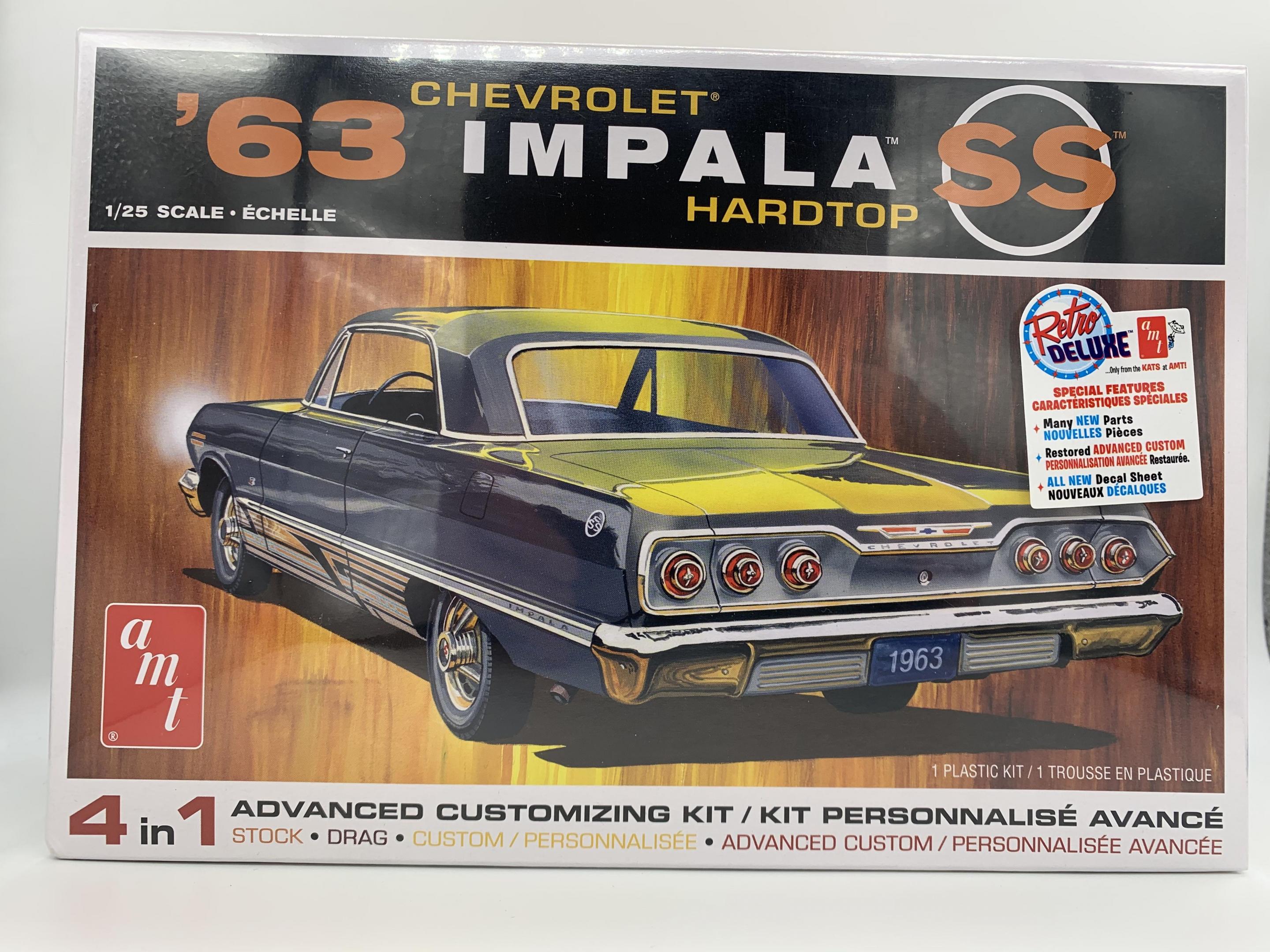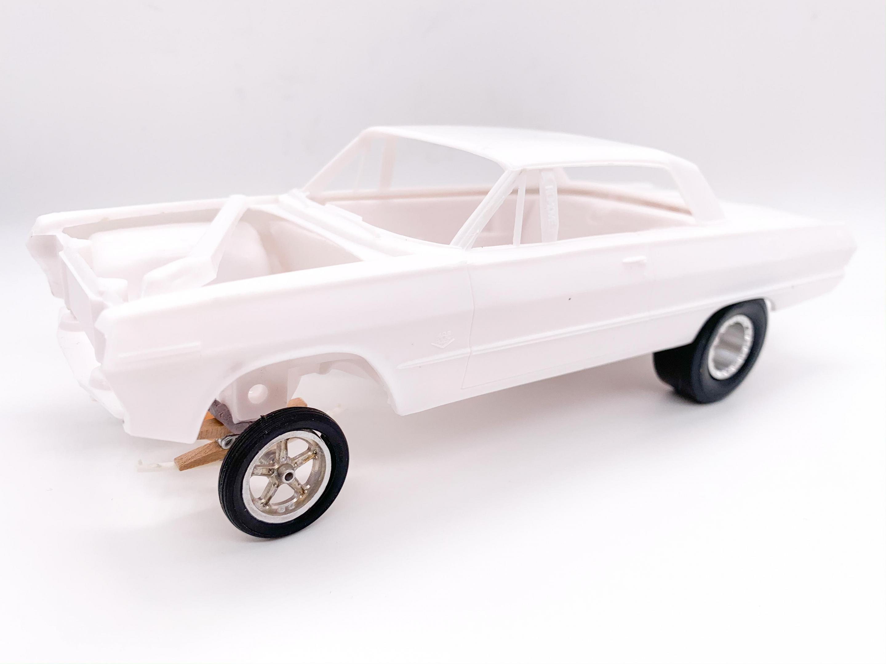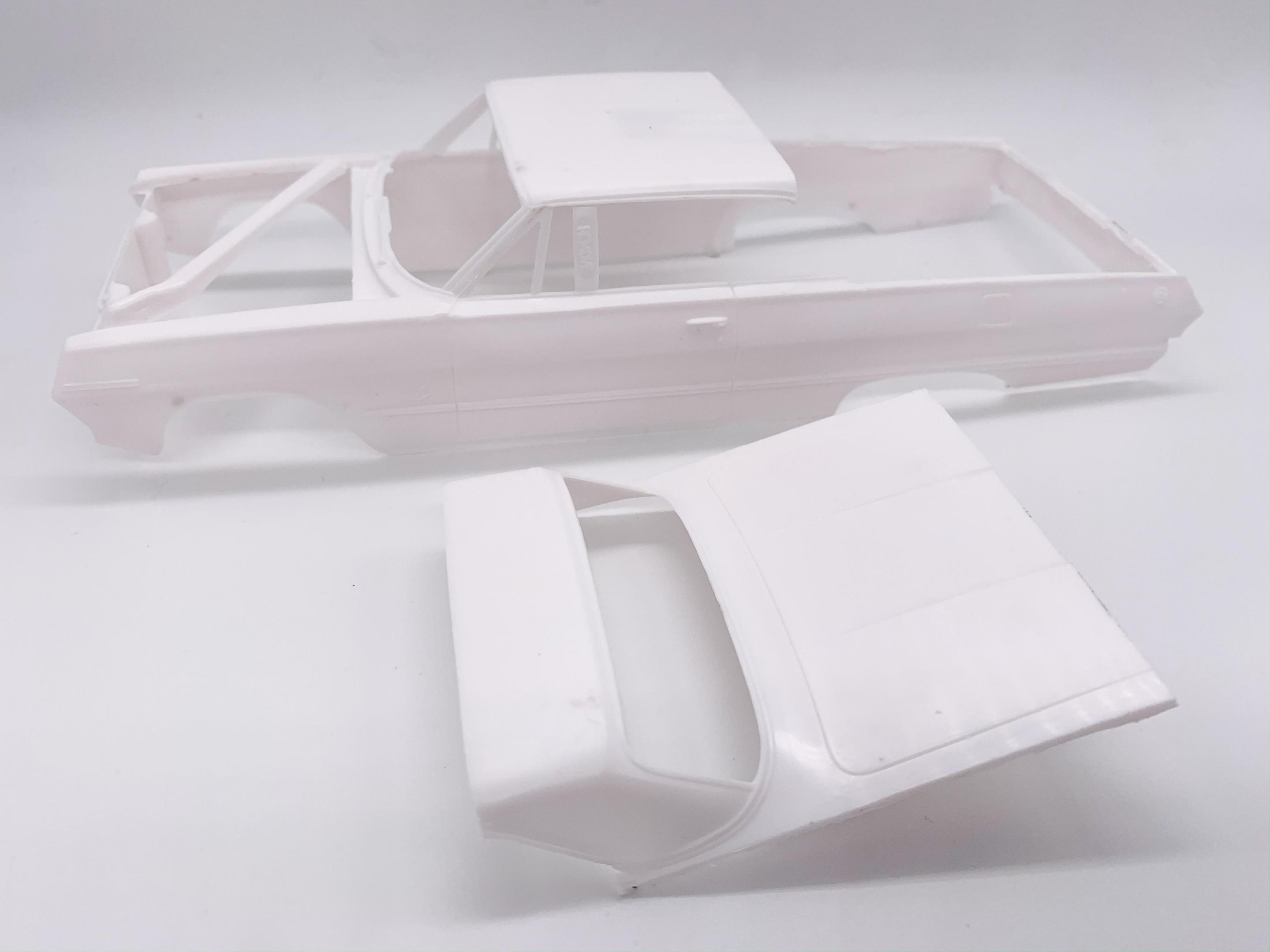So, the web theme for NNL East this year is the AMT 63 Impala kit that was reissued last year: I did some brainstorming on what to do and was pretty much set on doing some form of drag car with the kit, until I saw this 63 online: I think it’s a hearse conversion, but it’s retained the low roofline of the stock car, and seems to be a sedan which has had the rear window moved back and the roof lengthened rather than using the more-logical (but rarer, I assume?) station wagon as a basis. Then, I fell down a rabbit hole of reading about the interesting world of ‘street freaks’... ...and a plan was born! I figured a street freak version of that hearse would be a pretty interesting build, and I liked the idea of combining some of those gasser influences into a street car. A quick mockup before I started hacking plastic... I can already tell that this build is going to involve more scratch building than I planned on, not least because the kit chassis has almost everything moulded in, but I’ll start with the fun stuff. My plan is similar to what the builder of that 1:1 seems to have done - just lengthen the roof and slide that rear window right back. Used my new Tamiya scriber, mostly, to score some lines like so... Then removed the rear deck lid from the section I’d removed: And reattached the rear window portion as far back as it would go: Those black styrene strips are to keep it aligned whilst the glue dried, and to give me something to attach a new panel to, to extend the roof: The roof panel itself is pretty flat, but those curved edges seemed like they were going to be tricky to recreate so I built up a little thickness of styrene bar in the gaps so that I can sand them smooth and shape them to match the existing shape: And that’s about where I’m at so far - I’ll get some sanding and shaping done on the body tomorrow when the glue’s set up, and then we can start figuring out how tricky it’s going to be to make this thing into a jacked up pseudo-Gasser! More soon, soon as I’ve done more!