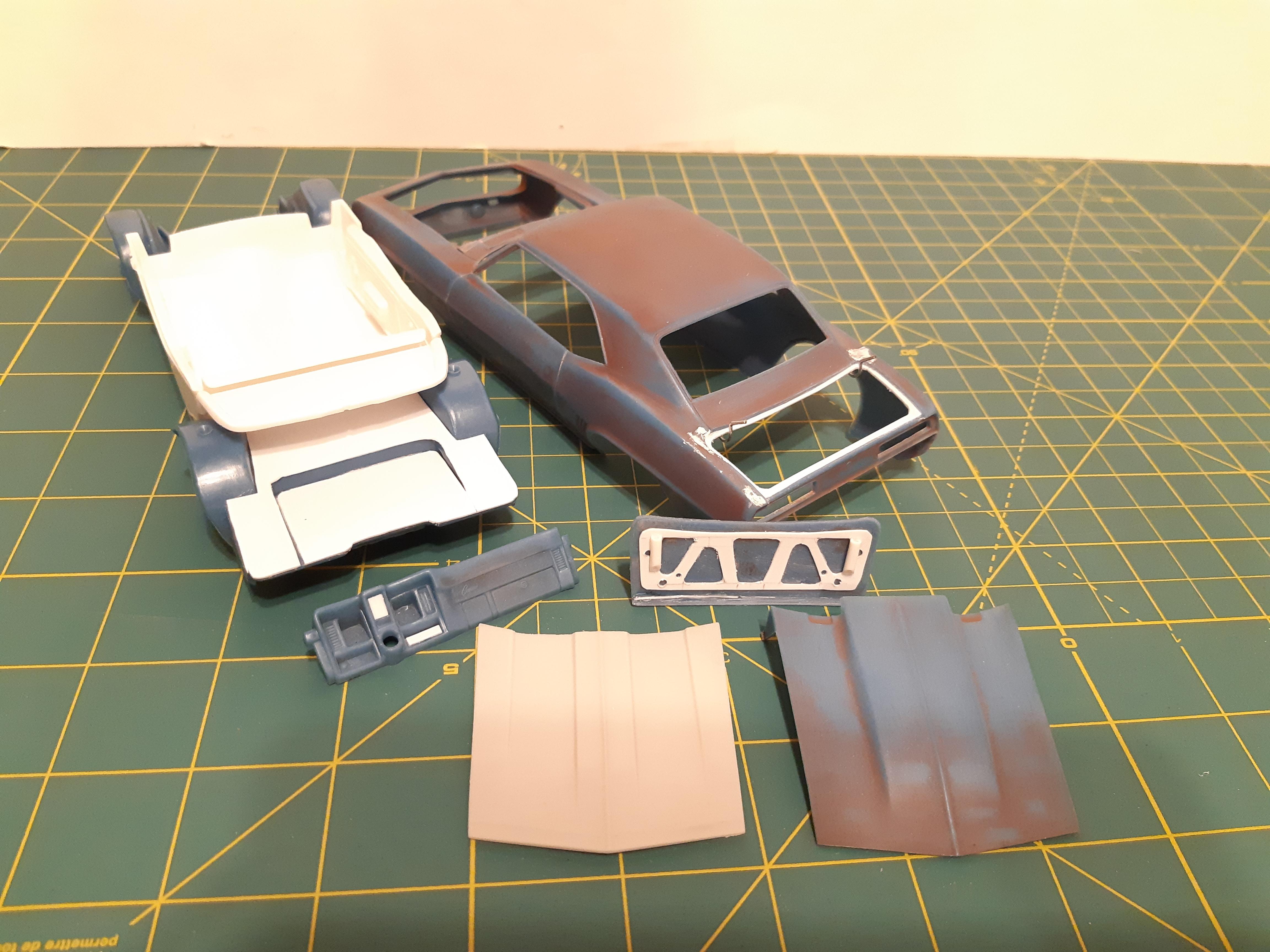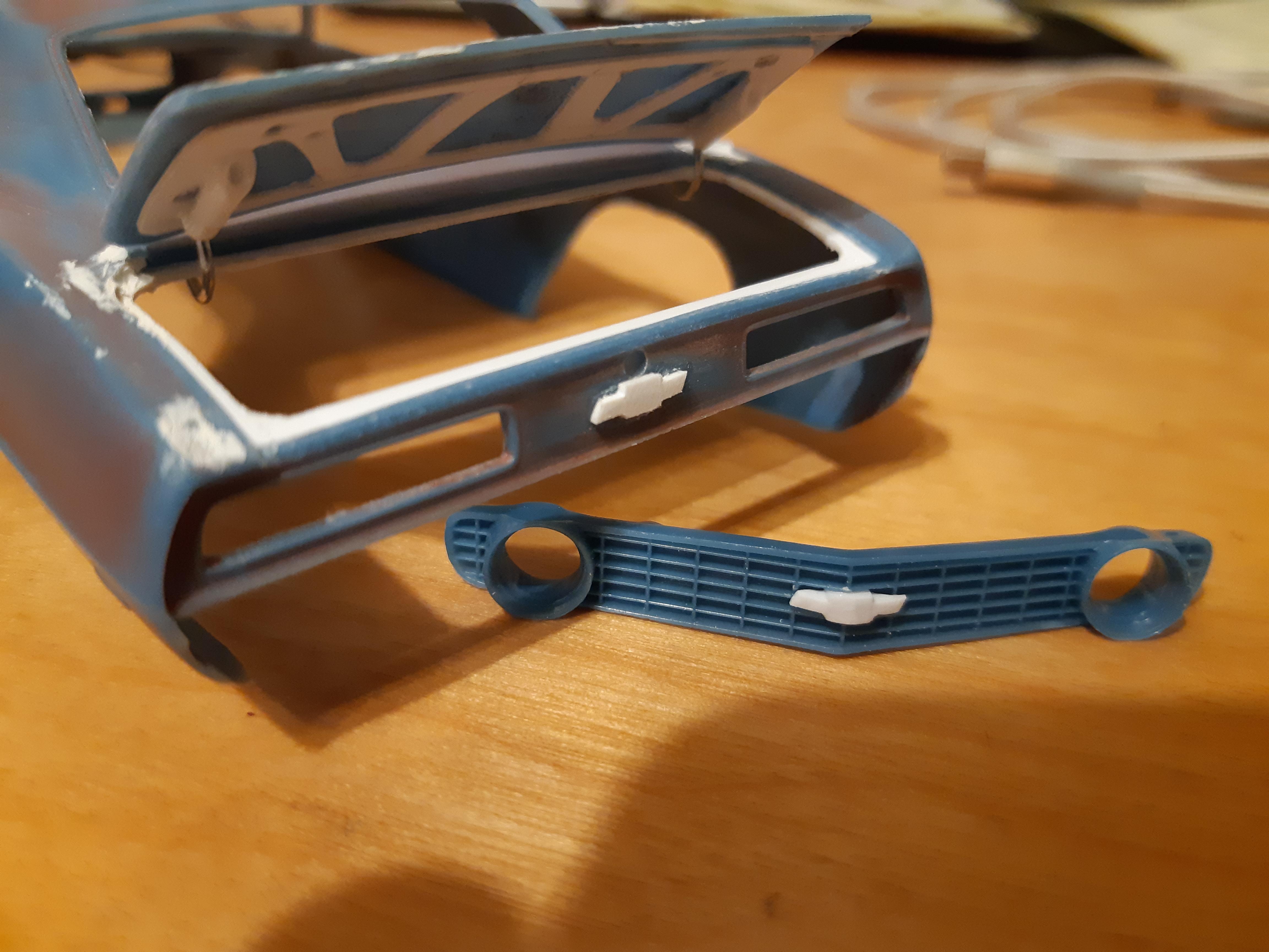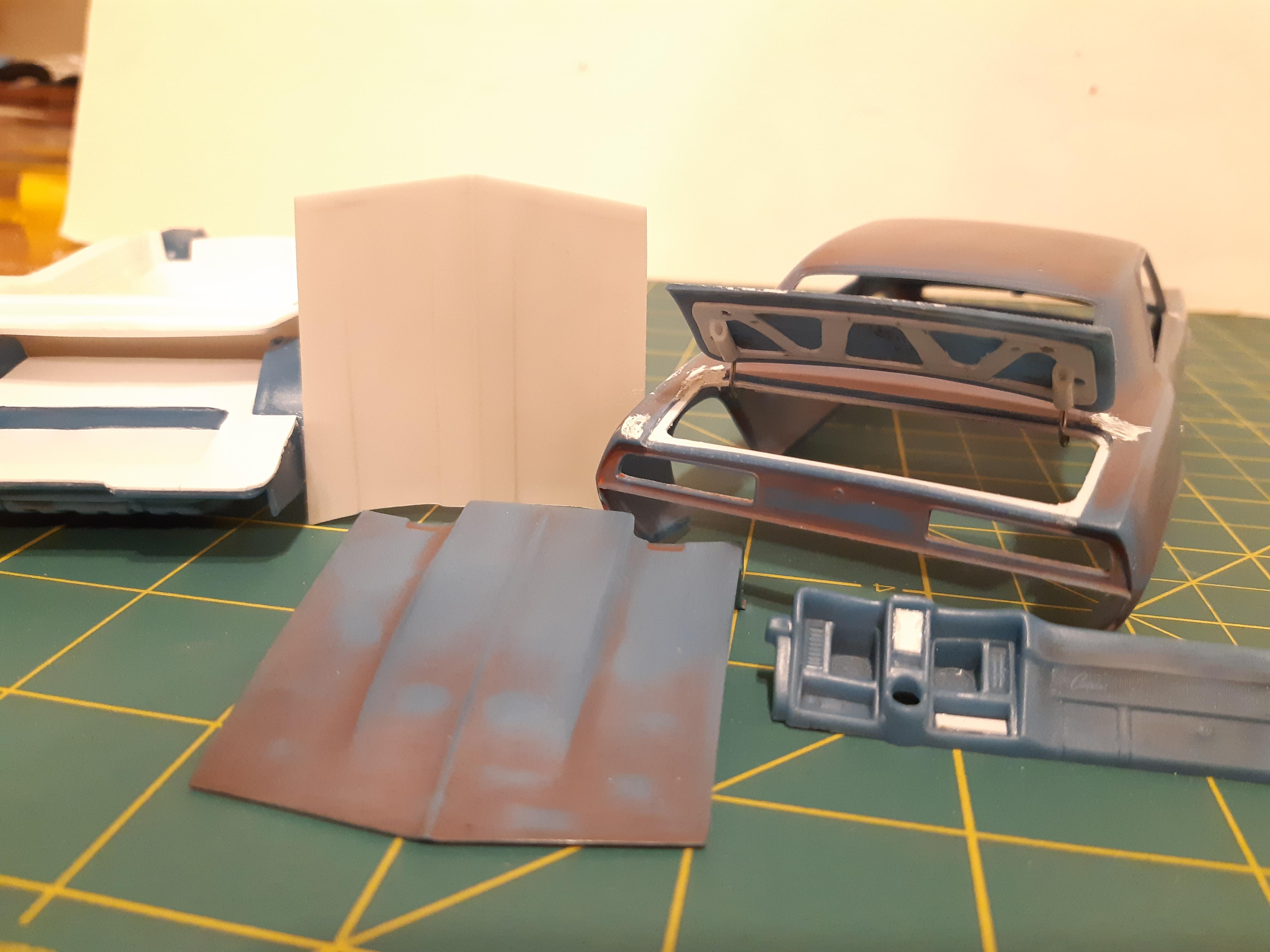 Im not a camaro person, but this Revell kit is such a good kit that it was calling to me. Wanted to do something totally different, so i have started researching stone stock base model camaros that some housewife would have owned in 1969. Base model, no trim, 250 straight 6, torque drive transmission(look it up). as a host of unusual colors and options. So far i have this, opened the trunk, because i will eventually add all the stuff for the Traction Compound option. Made some bowties front and rear using Gregs radiator cap techique. Thats when i noticed Revell made the trunk lock too low so i had to sand it off and drill it higher. I deleted the speakers on the package tray, radio delete, column shift, you get the idea. i had to sand off all the wheelwell chrome too, that was fun! Oh, and we cant forget the addition of the flat hood from the AMT 67 kit. Im thinking of doing a vinyl top, and it will probably get a luggage rack, just for fun. Brown with parchment interior i think, but maybe green.