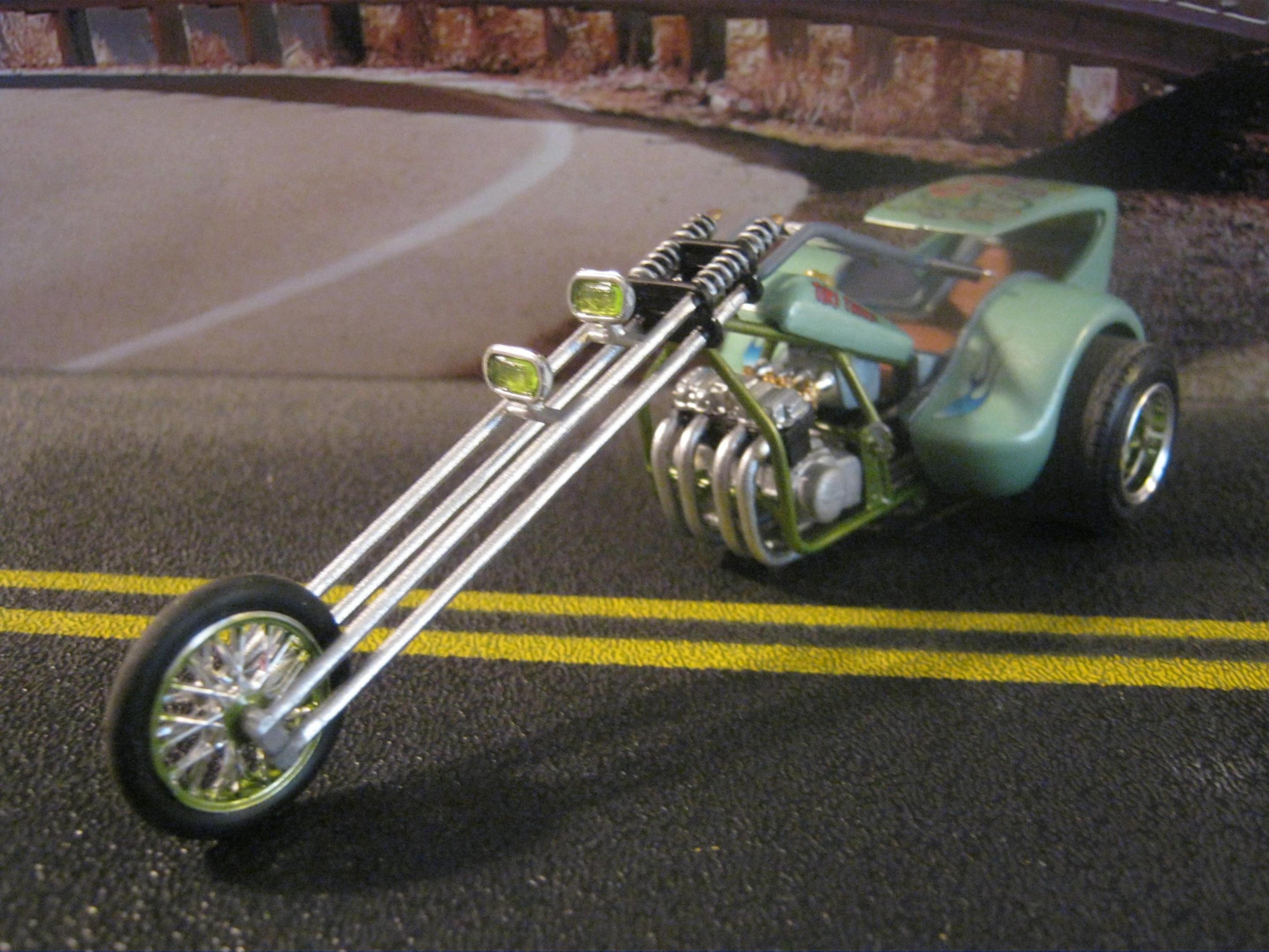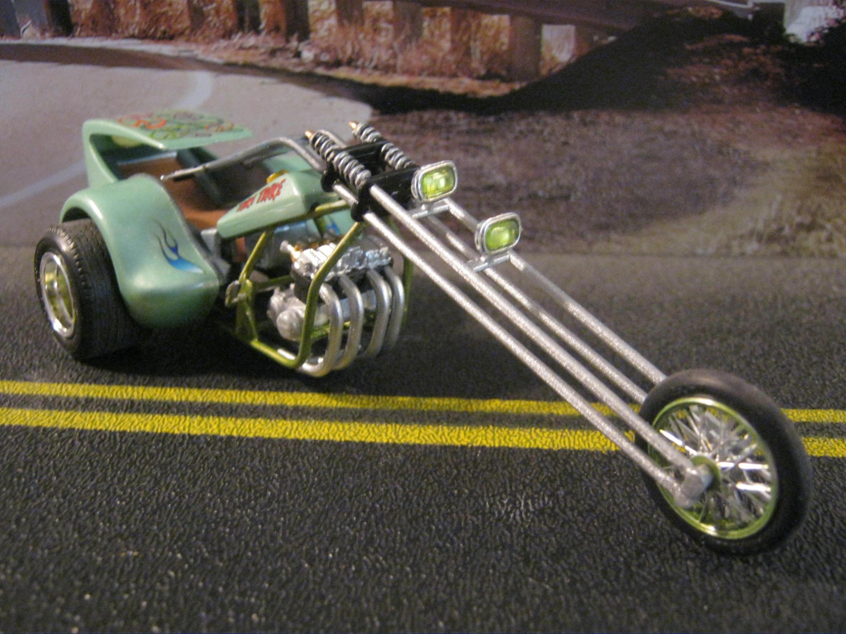 3 wheels,,4 cylinders,,and loads of fun for all! My version of the infamous "TIKI TRIKE". Fun little kits to do,,although I did have to use the maginfier lens to assemble some of this. Sprayed w/Tamiya Mystic green,,custom mix paint for frame,,dechromed everything and sprayed w/Testors Diamond dust. Was thinkin how cool these series would be if they were 1 /8 th scale! I dig the Honda CB 750 mtr in these,,the 1:1 CB 750's make great choppers ,,Im lookin for a used one on Clist to make a chopper in my garage,,fun,fun,fun. Build on!