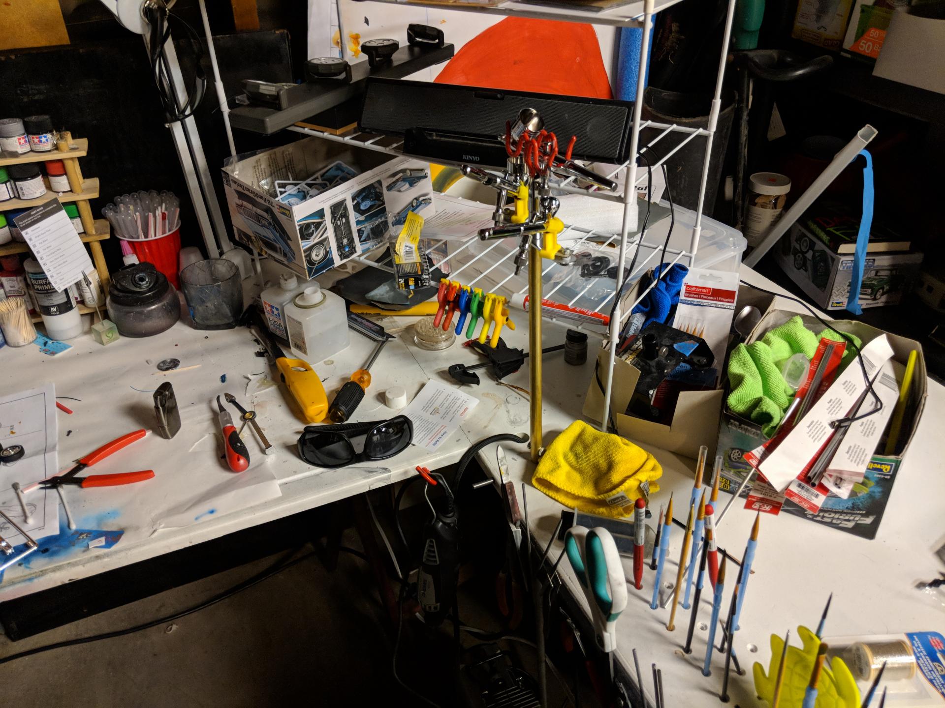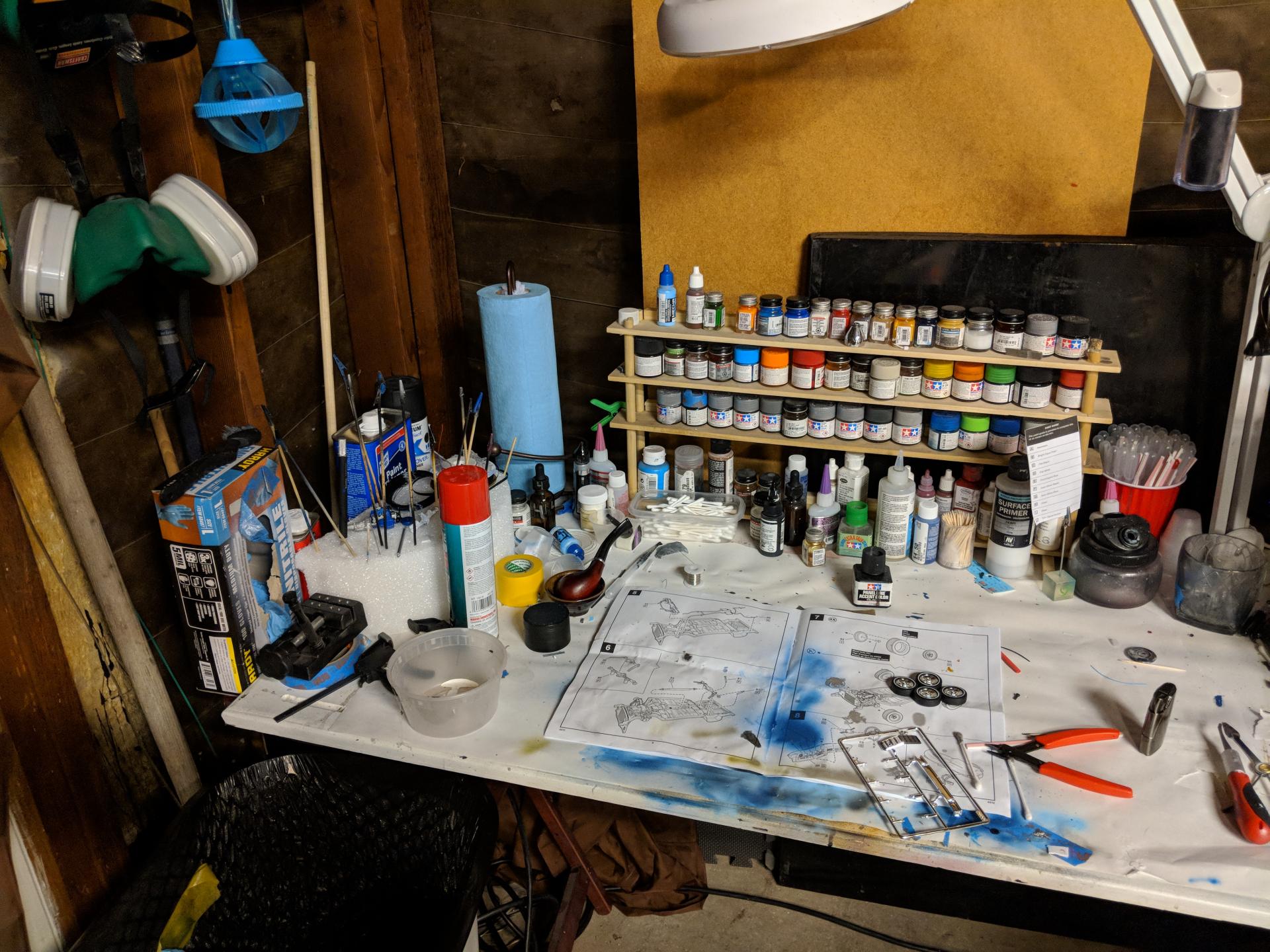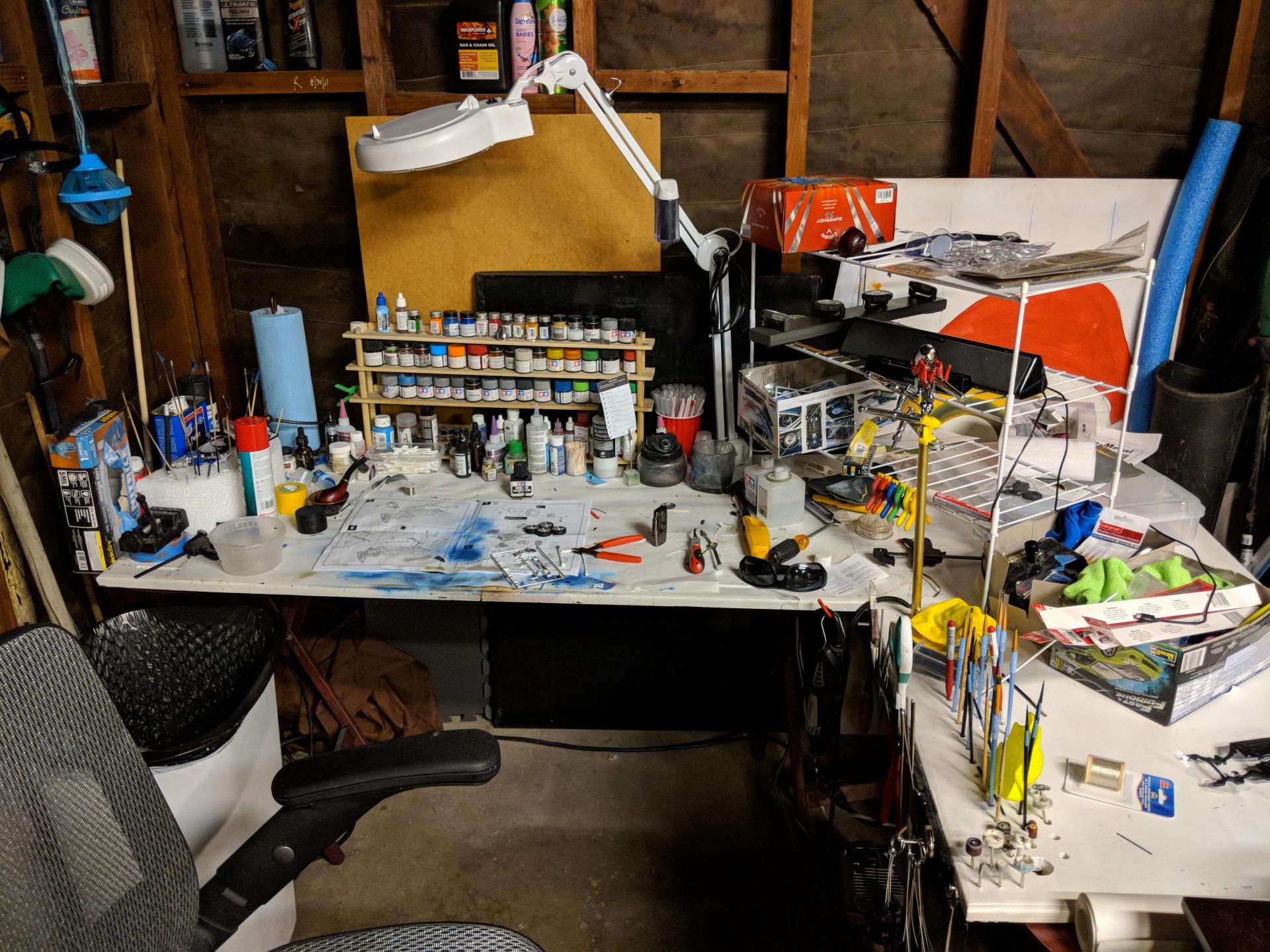 I'm revamping my work bench and looking for good ideas. What are you guys working on nowadays? Any essential tools? Here's my battle station in its natural state of use. Just 2 2x4 plywood joined together with biscuits, and painted with a semi gloss chemical resistant paint and held up by TV tray tables. I drilled several holes for various use like the rack, airbrush stand, brushes and lamp. I'd say the magnetic strip is the most essential thing I have for organizing files and cutters. Gonna make a spray booth and get a bright a$$ led shop hood.