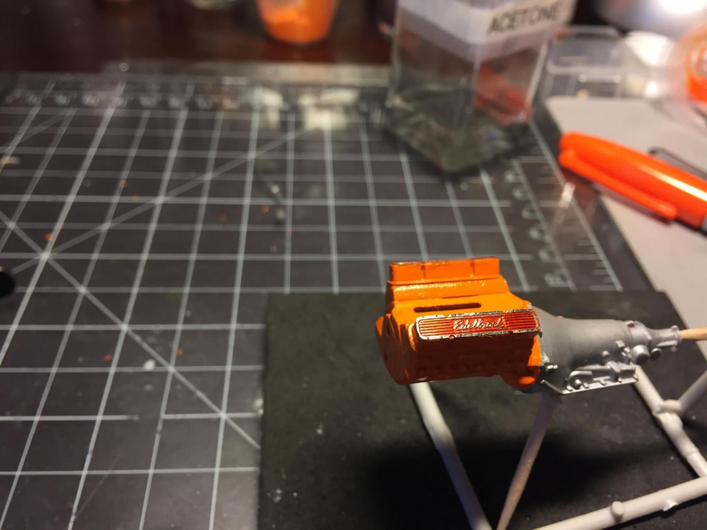 My daughter was coloring and I saw all these markers and remembered someone using Sharpie for detailing. So I pulled out MCG photo etch valve cover and this is what I have. The first pic doesn't show the detail I'm asking about. The valve cover in the 2nd and 4th pic are mostly orange with Edelbrock and the out trim chrome. The 3rd and 5th all the raised detail is chrome. I need to clear this and can't decide which looks better. I've been looking at this entirely too long. Which one looks better? All comments are welcome.