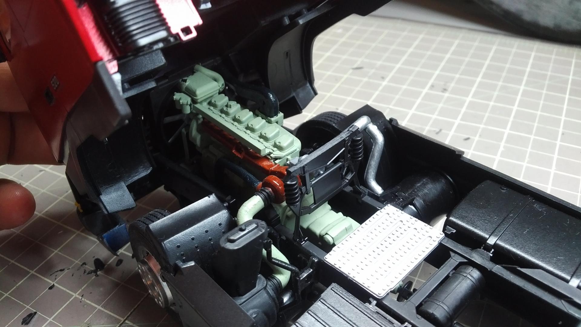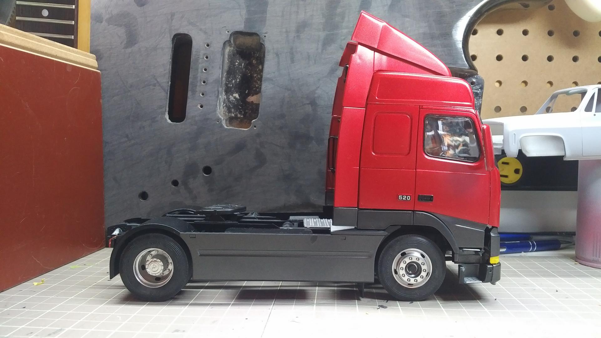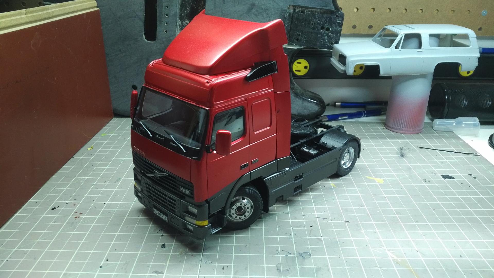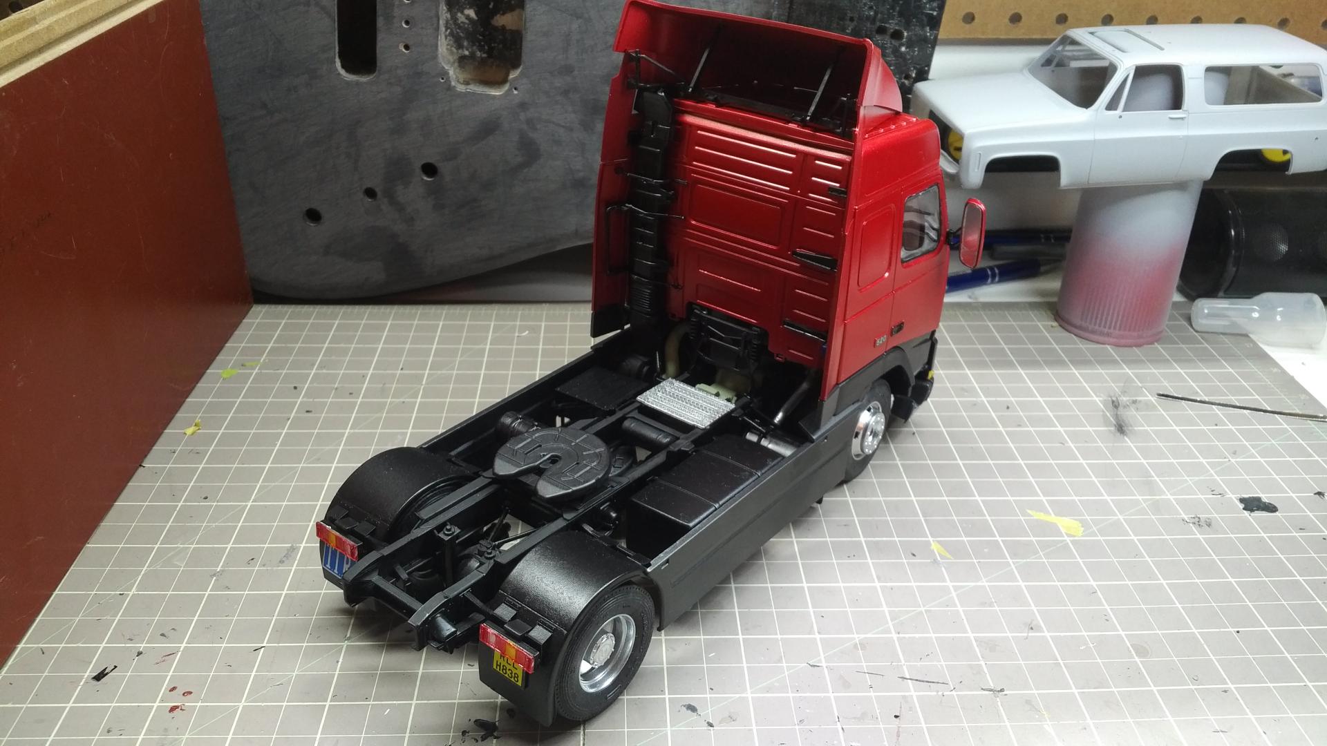 Finaly wrapped this one up. It's the old Italeri kit # 735. I got it for a steal on Ebay a few years ago, and started it late winter. Built it box stock with no additional detailing. Turned out okay. I have to say, I'm not a fan of multi piece bodies! And I found some of the details really fiddly and tricky. Like the rear cab fairing supports. Those were a bugger to get right! And some of the engine details didn't fit quite right. Like the air cleaner assembly. Using the stock holes and slots in the frame wouldn't have worked, as the front inner fender, air cleaner, and intake pipe to the turbo were not all lining up, so I had to cut some tabs and move things around to make them fit. Other than that, no issues to speak of. Paint is Tamiya right from the can; TS-18 Metallic Red, TS-38 Gunmetal. The chassis and trim are four different shades of black. The bulk of which is a Duplicolour bumper paint. The headlights and tail lights were BMF'd before being applied. All in all, I'm fairly happy with how it turned out. Next kit though will hopefully be something smaller, without the multi-piece body!