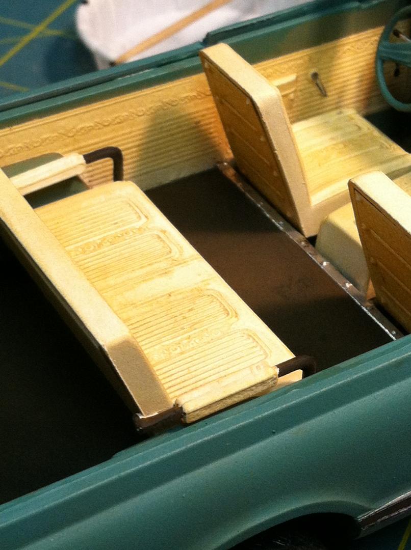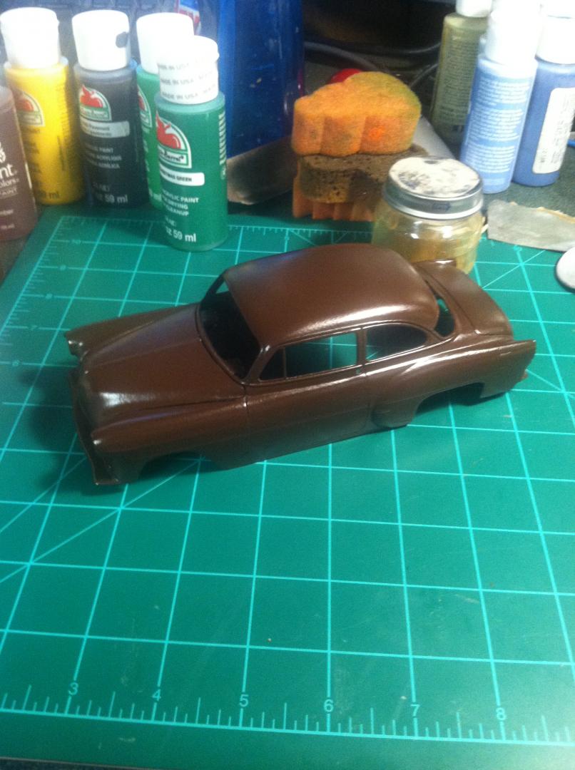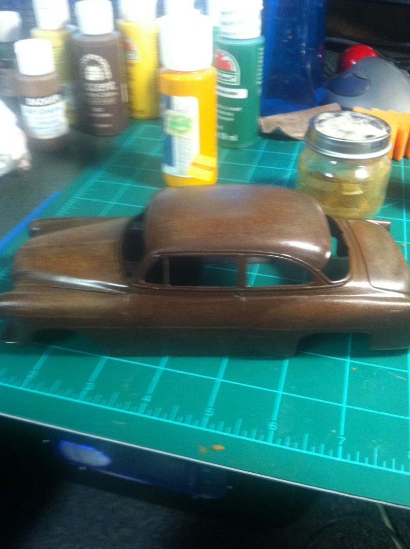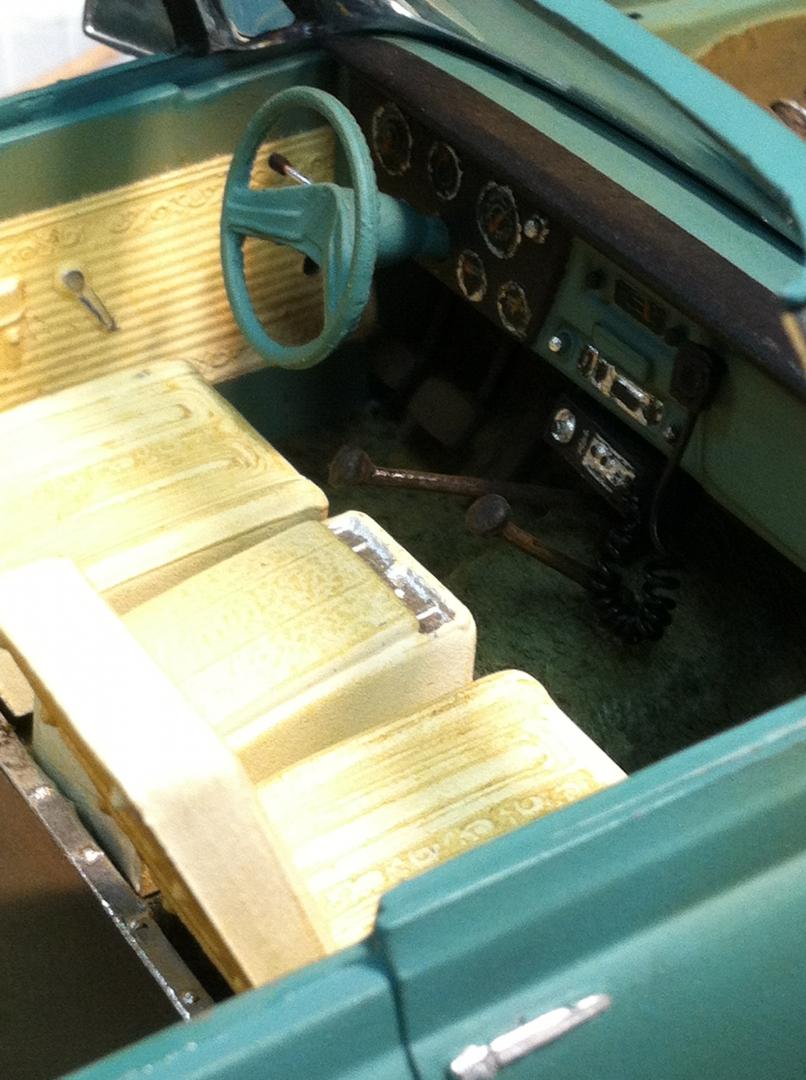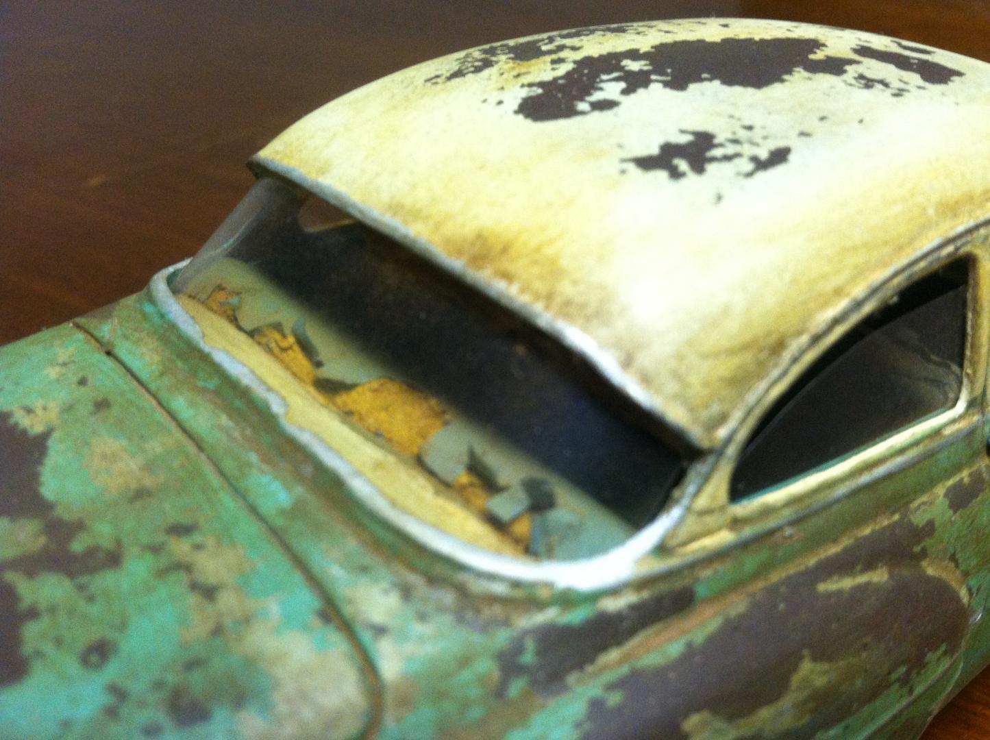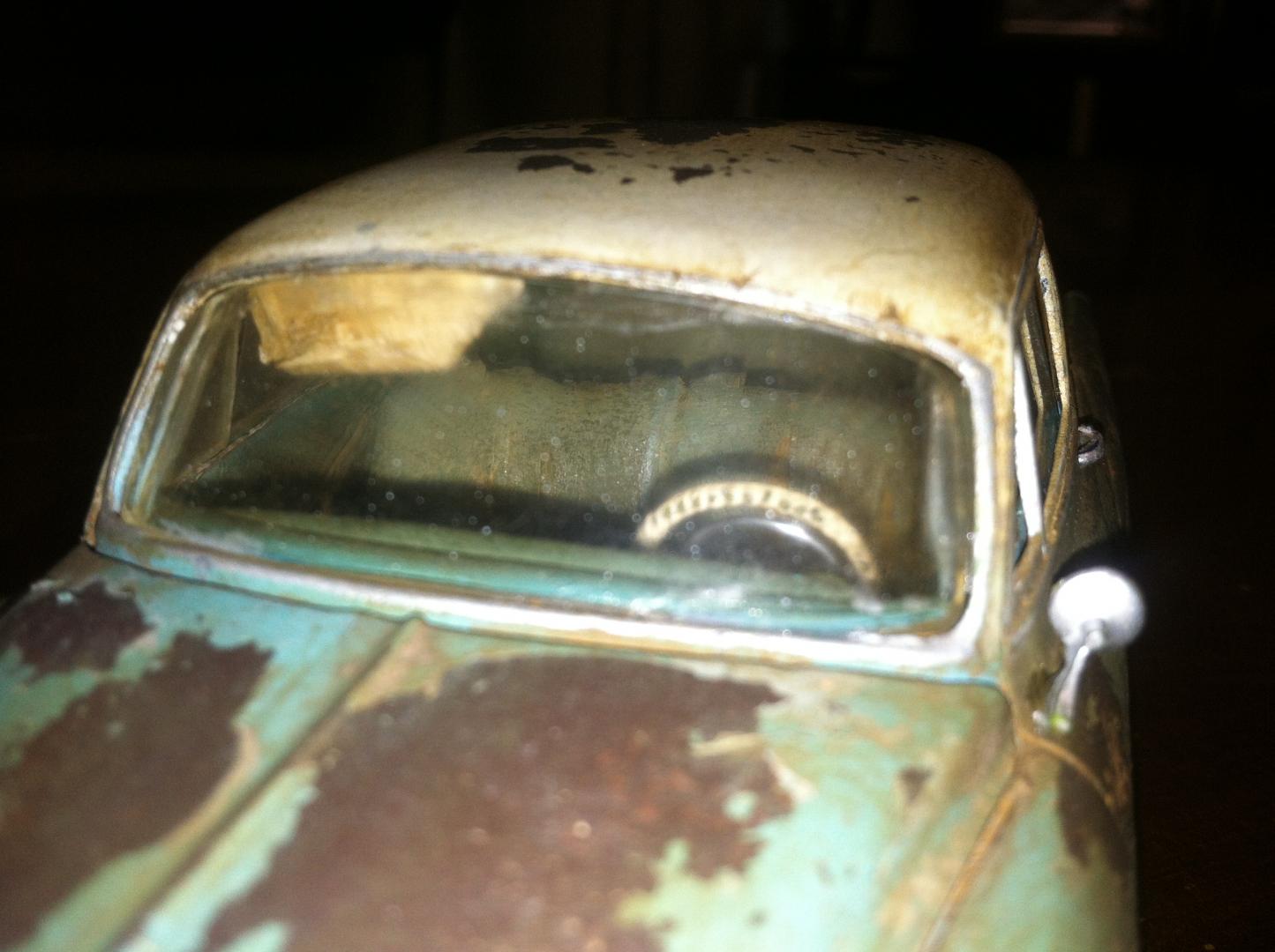 I got started building weathered street rods years ago after reading an article titled "Beaters" by Pryor Passorino in Plastic Fanatic. Since then I've been learning techniques from the military guys and applying them to my hot rod efforts. My latest will be based on the venerable Monogram '36 tool that has been around since I was a kid. I'll be using the Revell 2 in 1 "Car Show " version. Getting the proper stance is no more difficult than substituting a length of evergreen channel for the stock front crossmember. The rear is already perfect. Floquil rust applied to the whitewalls provides a more realistic yellowed appearance. I used the salt and hairspray technique to accomplish the rust spots. I used Testors enamels and Pantene hairspray. The body is first airbrushed with Testors rust, followed by and application of hairspray and a dusting of salt in the desired areas. There are a million Youtubes demonstrating this technique. Next comes a layer of flat white followed by the color which is a 50:50 mix of green and blue metal flake. Finally the salted areas are sanded with 400 grit. I will follow all of this with a layer of Testers Dullcoat. I've decided to go hoodless and will install a blown flathead. More to follow.