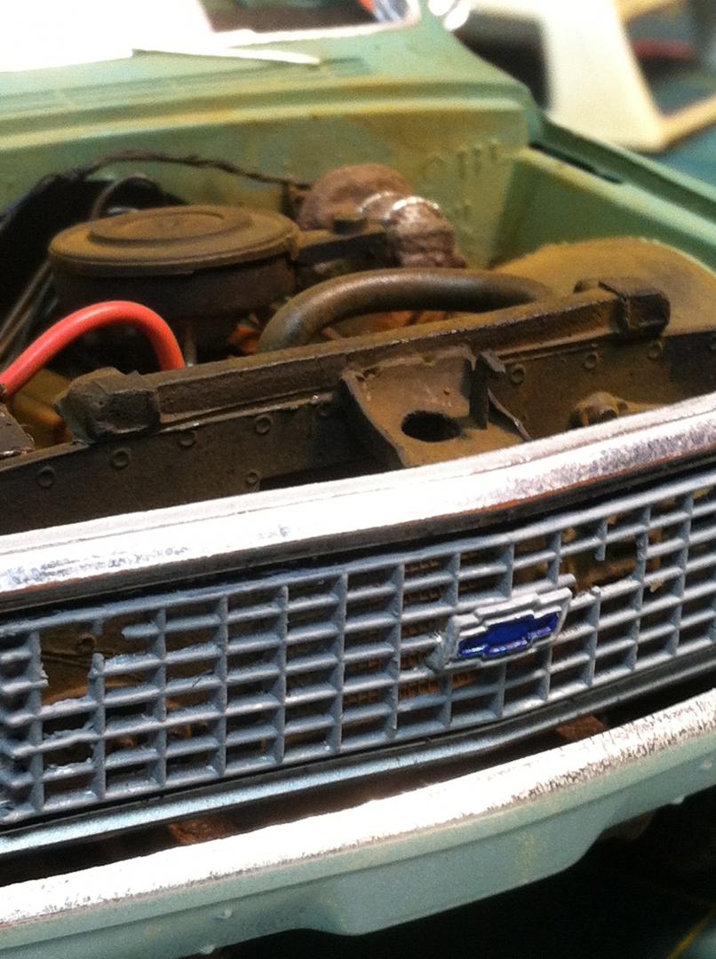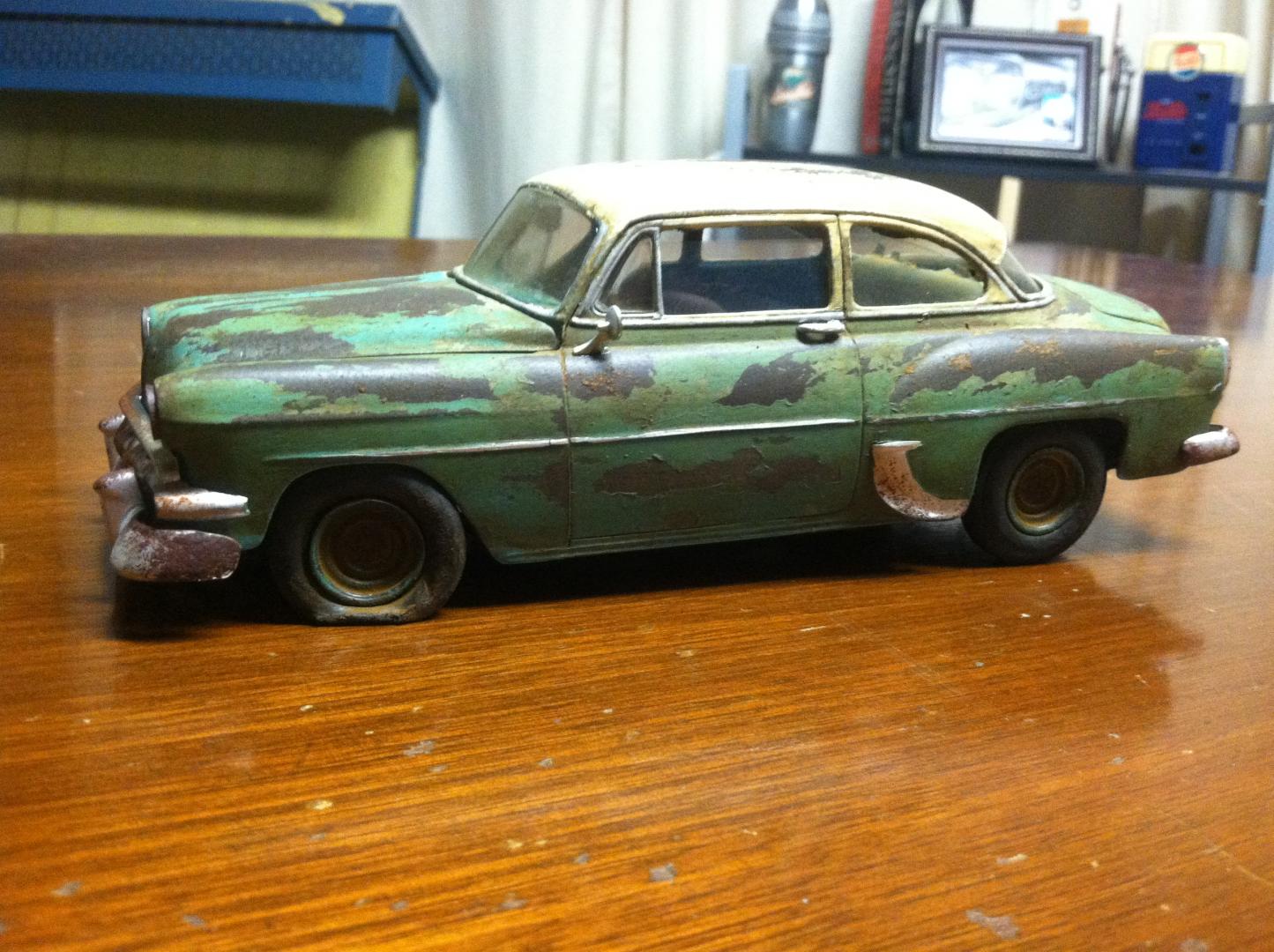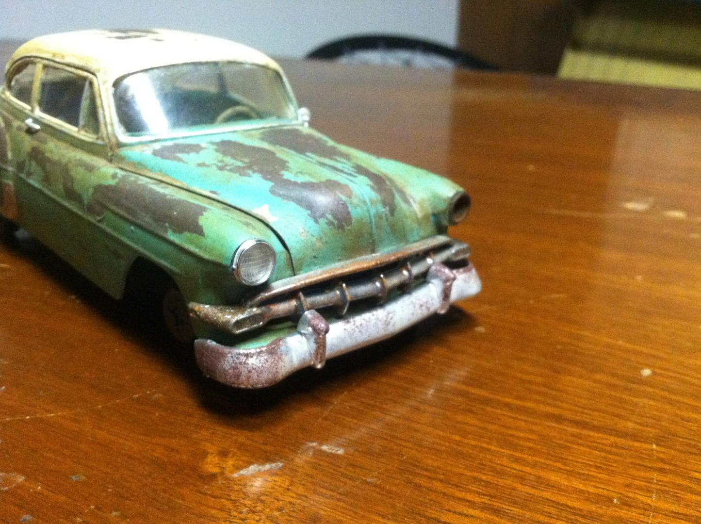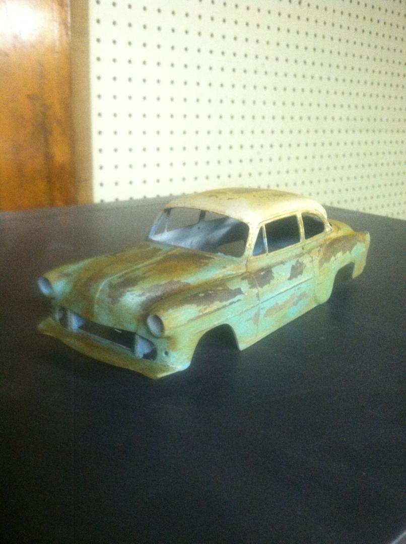 My first build in almost 30 years. This is an old issue Revell 54 Chevy gasser kit that was sitting on my shelf. It was missing quite a few parts like the front door panels, front and rear bumpers, front and rear suspensions, engine, and tranny among other things. What was there was a broken back window, cracked front valence panel and the body was so thin you could almost see through it. I thought about finding a re-issue version but opted for fabrication and robbing my parts boxes. I began with weathering the body to hide some of glue stains and went from there. I used a combination of methods (salt chipping and windex and dusting to achieve the effects you see. The windshield, side windows and back window are scratch built using clear projection sheets from the old style school overhead projectors. This was my first time using BMF and am still learning its challenges and realized this was probably not the best one to start with as most of the body lines were pretty minimal and faint.