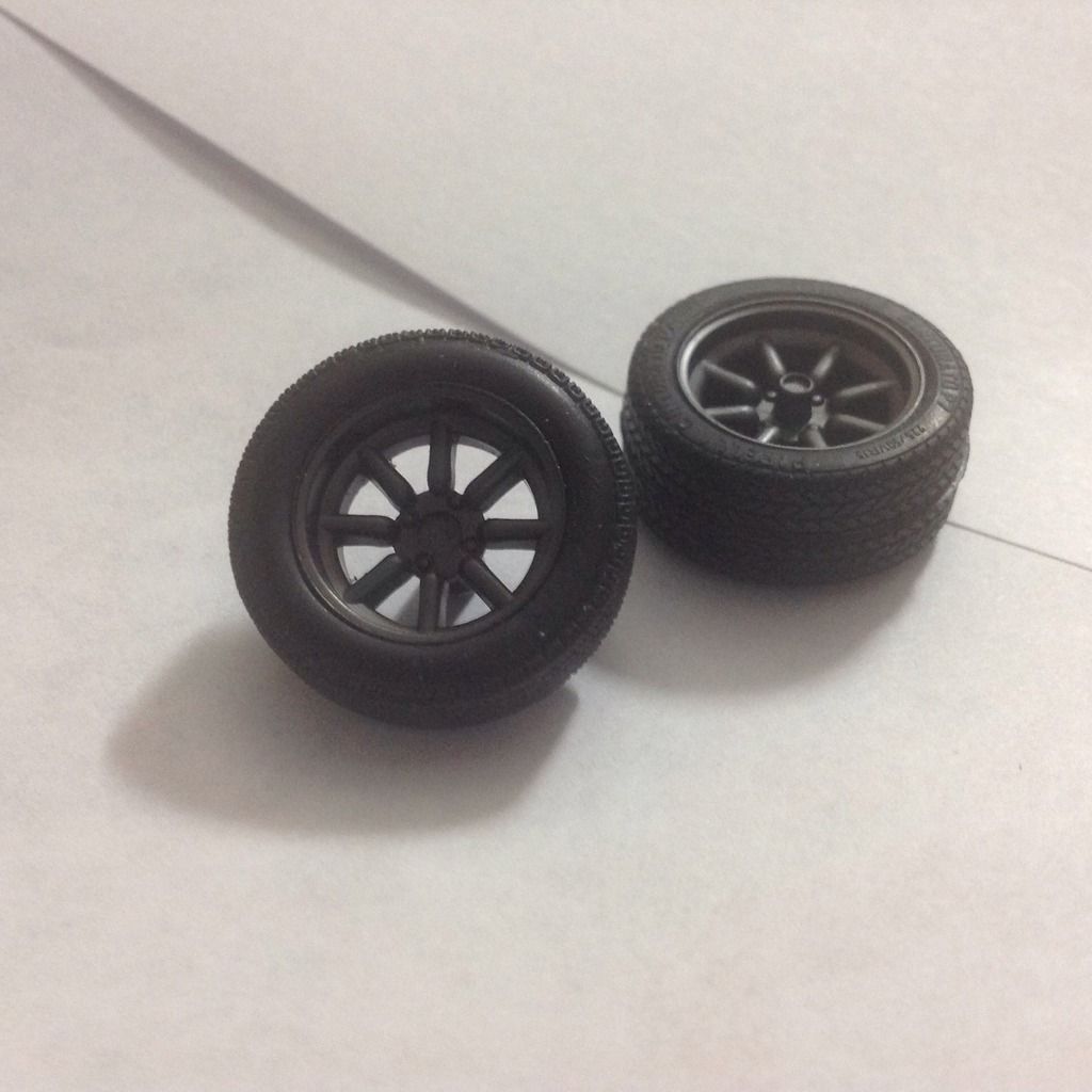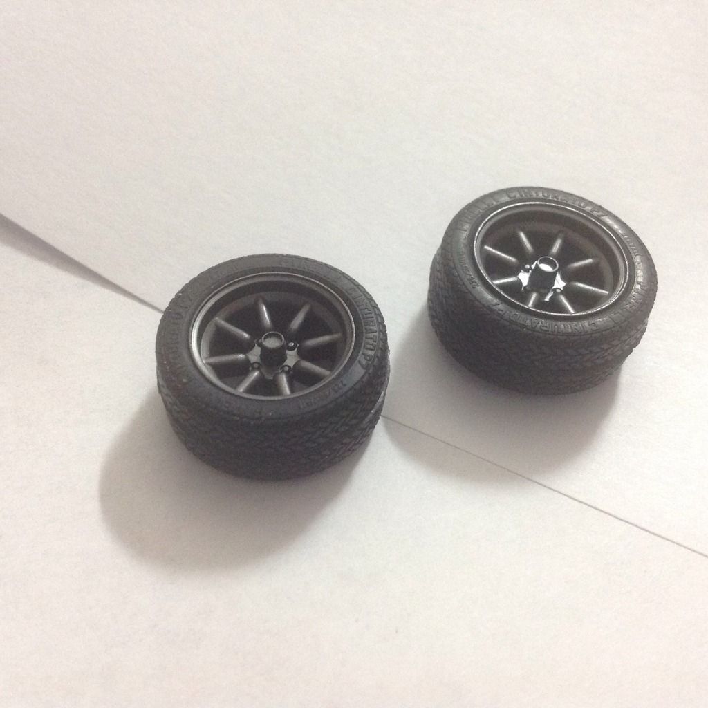 chunkypeanutbutter Posted April 18, 2015 Author Posted April 18, 2015 Wheels! Tires! Olè! Tires that came with the Watanabes are Pirellis... but they're wayyyy too big. I'll save them for when I make a Fiat slalom car some day. Chopped the rear of the rims down and put them into these tires from a '34 Ford diecast. Look at how much I had to cut from these! And, a little mock-up. Have to drop the spindles for the wheels to look right.