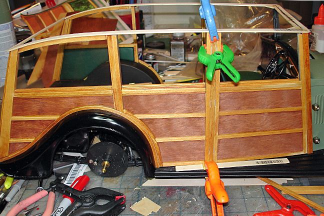 Harry P. Posted September 30, 2015 Author Posted September 30, 2015 Amazing work, Harry. What kind of joints and glue are you using for the door frames? Are the doors fragile? How did you bend the pieces of wood that go over the fenders? I would like to build a wood body someday, so I'm picking your brain while I have the chance!Hi, Hugh... thanks for your interest.I'm using CA ("super glue") on all the woodwork. I could use white glue, but i like the fact that the CA sets up real fast. Waiting for white glue to dry would definitely slow me down! No, the doors aren't fragile at all once all the pieces are in place. They are actually surprisingly sturdy, and once the inner panels are glued into place, they should be pretty bullet-proof.The curved pieces that fit over the fenders were bent by placing the wood strips into boiling water on the stove top for about 2-4 minutes or so. Once the wood was good and soft and flexible, I clamped the pieces onto the fenders with alligator clamps and left them to dry. Once the wood dries, it holds its shape.