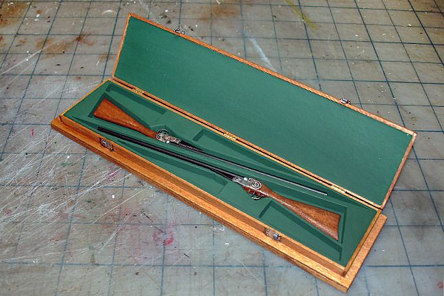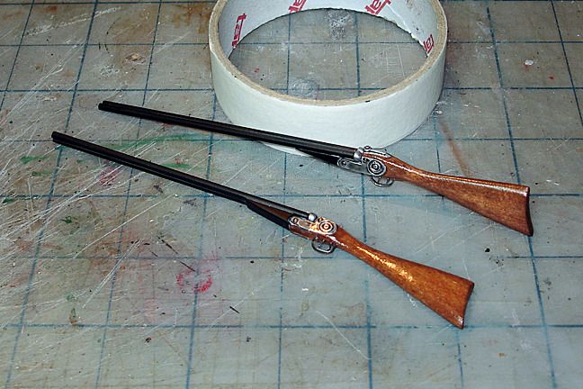 Harry P. Posted October 3, 2015 Author Posted October 3, 2015 Scott... right you are. That was an Albatross, IMO hands down the coolest-looking WWI plane of them all... a Fokker triplane in red would be my runner up... Anywho... back to land-based vehicles. After several hours of building. I now have a matched pair of English hunting shotguns for my woody. This is a first for me... in all my years of building scale models, i have never built a model gun And now I've built two! I stained the stocks and sprayed them with several coats of gloss clear acrylic. The barrels are styrene tube, and various small detail parts are made of bits of styrene rod, tube, and sheet. The "metal" side plates were cut from aluminum duct tape, and the triggers and trigger guards are soft silver wire that I flattened with pliers and bent to shape (I found the wire in the jewelry aisle of Hobby Lobby... it's a little harder than solder, a little softer than aluminum rod). The guns scale out to 48" long (30" barrels). They aren't 100% super accurate, but they will do the job representing period-correct shotguns in my woody. I think they turned out pretty well.