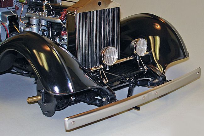 Harry P. Posted July 30, 2015 Author Posted July 30, 2015 Got some of the front end details done... crank, driving lights, and bumper. The bumper and bumper mounting brackets are steel, looks very realistic when installed. The driving light assembly was tricky... the horizontal plated brass rod has no markings or anything to tell you where the lights need to go. It's up to the builder to space the lights correctly. The rod is also too long to fit bewteen the fenders, I had to cut it down. I also had to ream out the light mounting brackets that slip over the metal rod. Once I had the light placement measured out, I marked the rod, slipped off the mounting brackets, and used a grinding bit in my Dremel to scuff up the smooth plated surface of the rod where the mounting brackets would be, to give the CA I used to attach them something to grab onto besides smooth, shiny plated brass. You also have to be very careful to make sure both light mounting brackets are oriented correctly, otherwise when you mount the lights, they won't be lined up with each other. Again, there are no markings or any obvious way to align the brackets... you have to carefully eyeball it, and since I was using CA, hope that I got them right the first time! Turns out I did, and the lights are perfectly aligned with each other, and parallel to the ground. The light buckets are beautifully machined and plated brass, they look great!