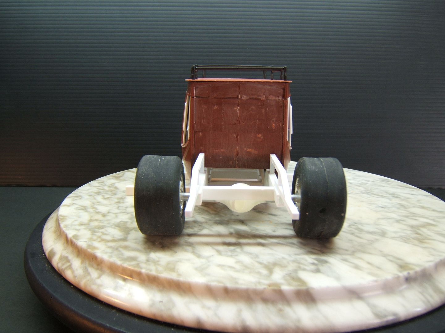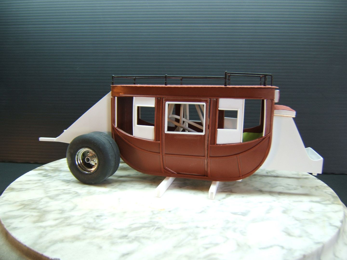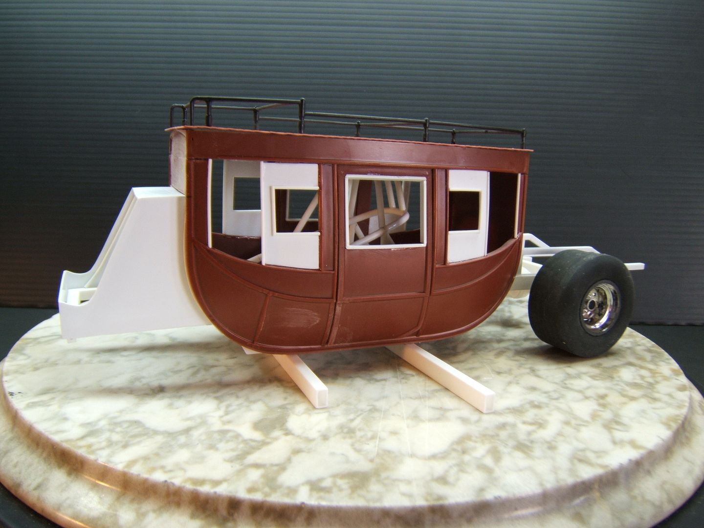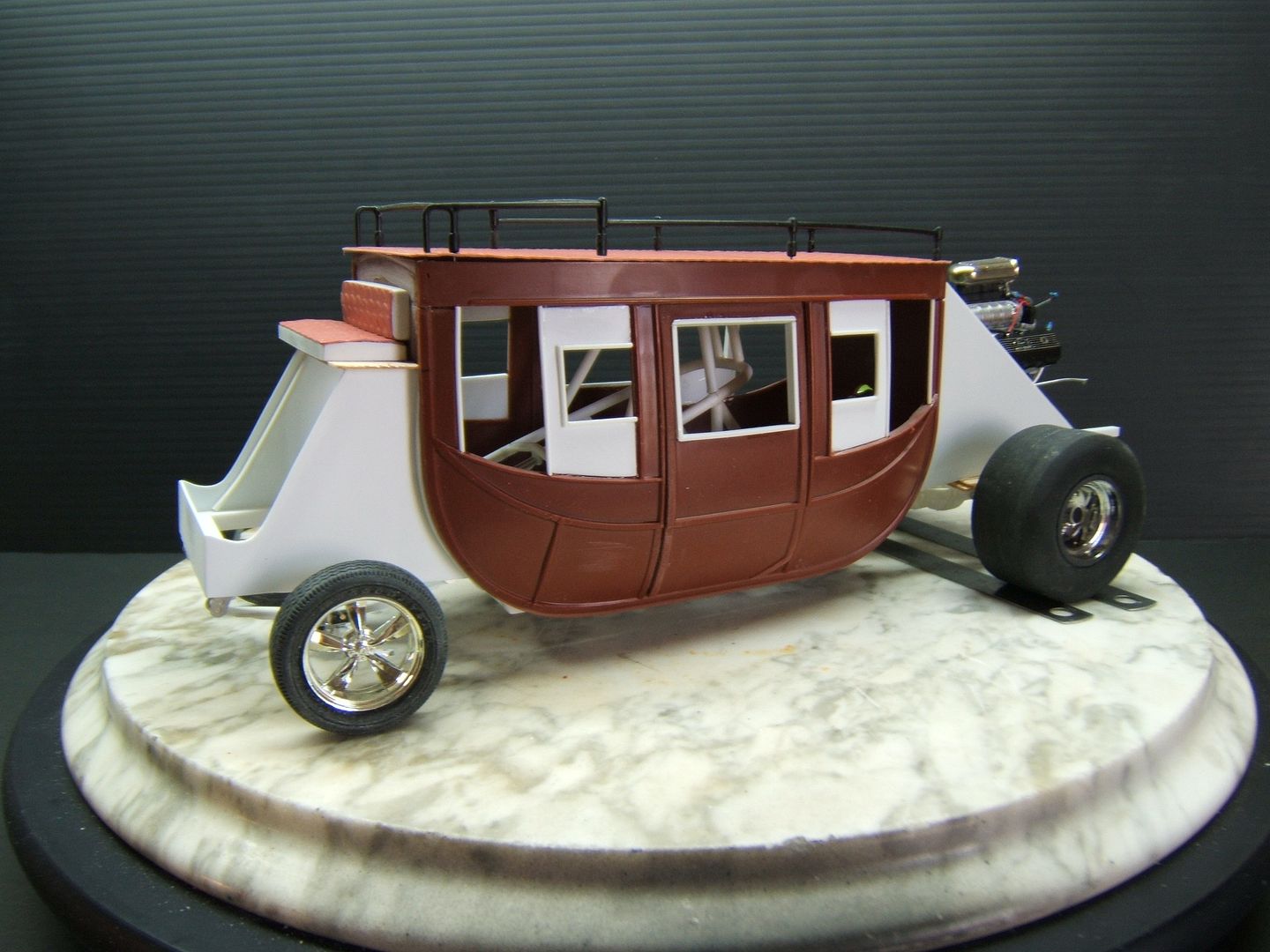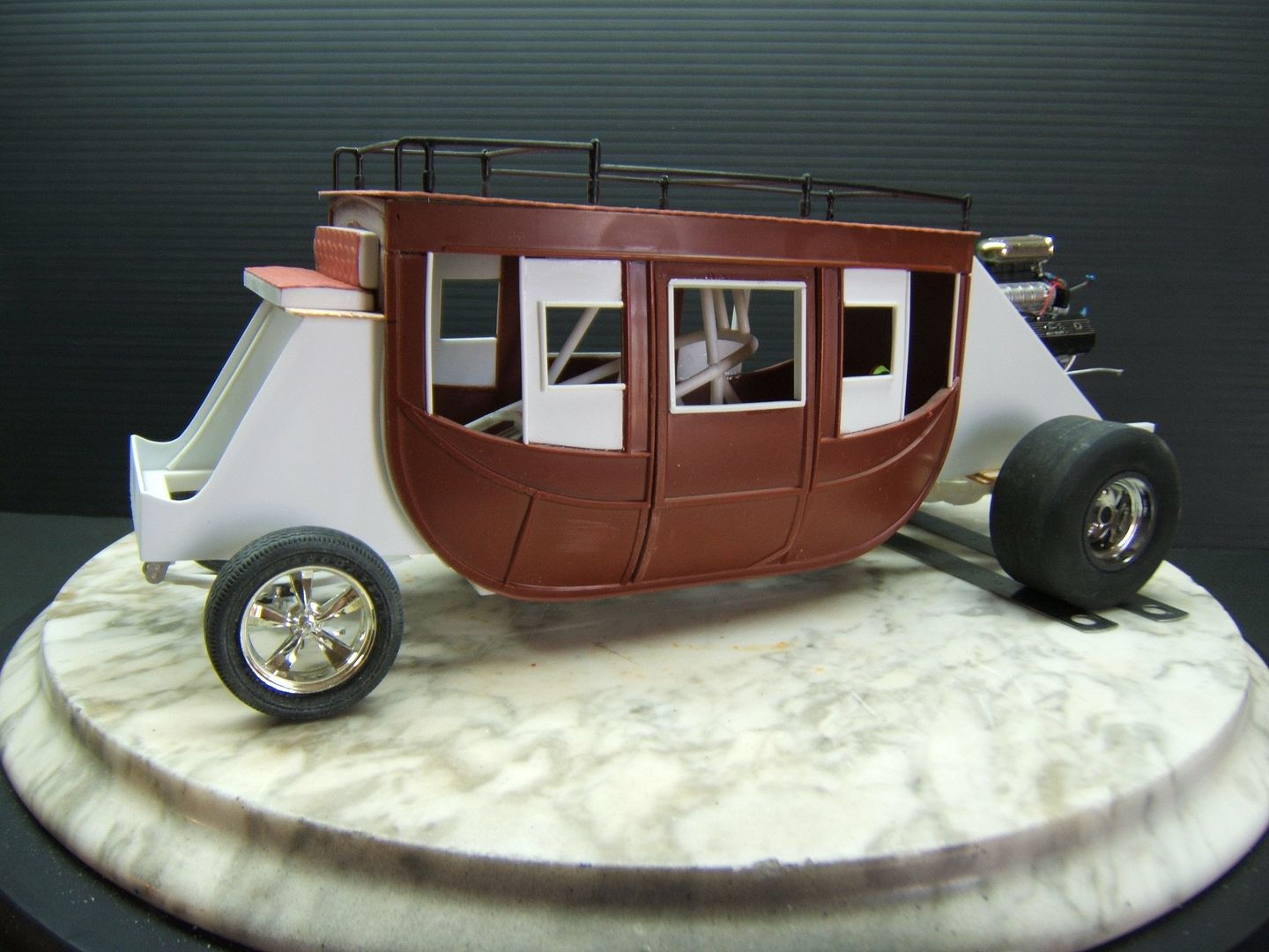 John Teresi Posted August 12, 2015 Posted August 12, 2015 (edited) Hello.....this is on my workbench...... a 1/16 scale Stage Coach Wheeelstander......some of you may know Chris Sobak AKA "Mooneyes" here on the MCM Forum......he is a very talanted builder and a very good friend of mine......anyway,not to long ago we were hanging out and he showed me a project that he wanted to work on in the future.....it was a replica of the Jolley Rancher Stage Coach Wheelstander......I had seen the Jolly Rancher before and always wanted to build it too......but, in time I forgot all about the Jolly Rancher Wheelstander.....but,when Chris showed me a 1/16 Scale Lindberg Stage Coach that he bought on Ebay to make it...... I was sold......I asked him if he would mind if I built one too...... but, with my own twist on it.......I did not want to copy what he was building......Chris was cool about it and offered his help and reference pictures.......this build turned out to be a twin Coach build for both of us.......I feel bad about this project because Chris has put a hold on his Fabulous Vega "Snake" F/C build to help me with this project......he has even drawn plans for me to build this thing......I want to give all credit to Chris for helping me with this build........you could say "I am just a Squirrel in Chris`s World trying to get a nut" .....thanks Chris.......You can go to Chris`s Stage Coach build here on MCM Forum to see alll his drawings and story about his build......anyway here are a few pics of what I have done so far.......I used the Lindberg 1/16 Scale Stage Coach kit and shortened and narrowed the body......I added windows......I made a new roof .....and modified the rack......I made the Chassis using Chris`s drawing plans......I made the front and rear sections for the body........Chris also sent me some Flashpoint slicks and a TDR resin Ford truck rear end ......I also made some seats......and a front axle.....I have a ton of work to do yet but,I think I got a good start on it.......you can go here to see Chris`s post...... Edited November 10, 2015 by John Teresi