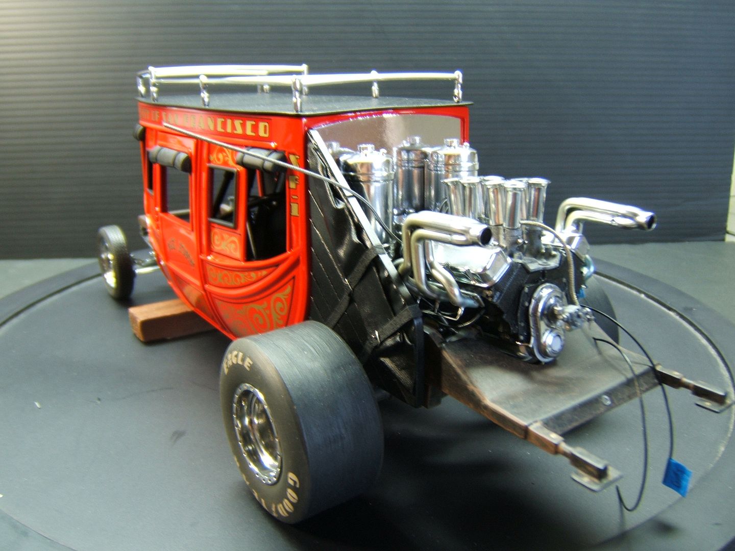 John Teresi Posted September 29, 2015 Author Posted September 29, 2015 Hello......thank you all very much for all the kind comments and for following along with this build......I really did appreciate it.......I made the front of the Coach and the seat bench and handles and front shocks........I hooked-up the rest of the fuel lines and added some pads to the wheelie arms........My Buddy Chris Soback AKA "Mooneyes" sugested I use Tamiya smoke spray paint over clear styrene to get the tinted glass look that I was looking for......thanks Chris.......I`m going to call this one finished......I will airbrush the stacks and headers for a realism look.......... and I will take some "Outside" finished pics in a few days.......thanks for looking.