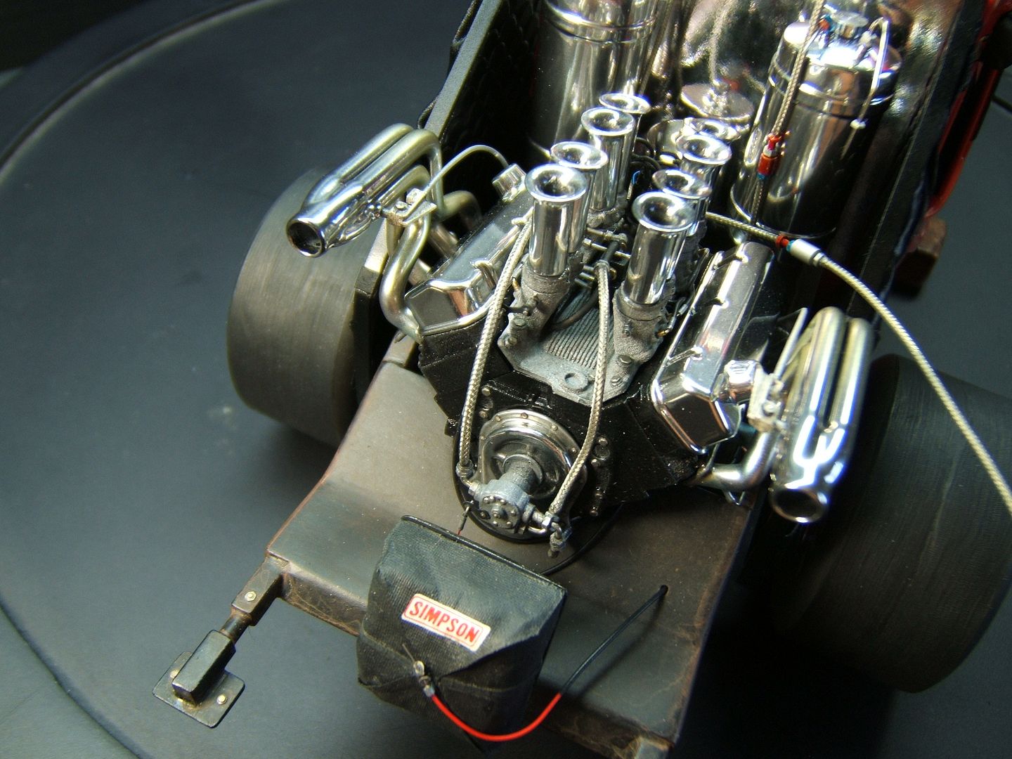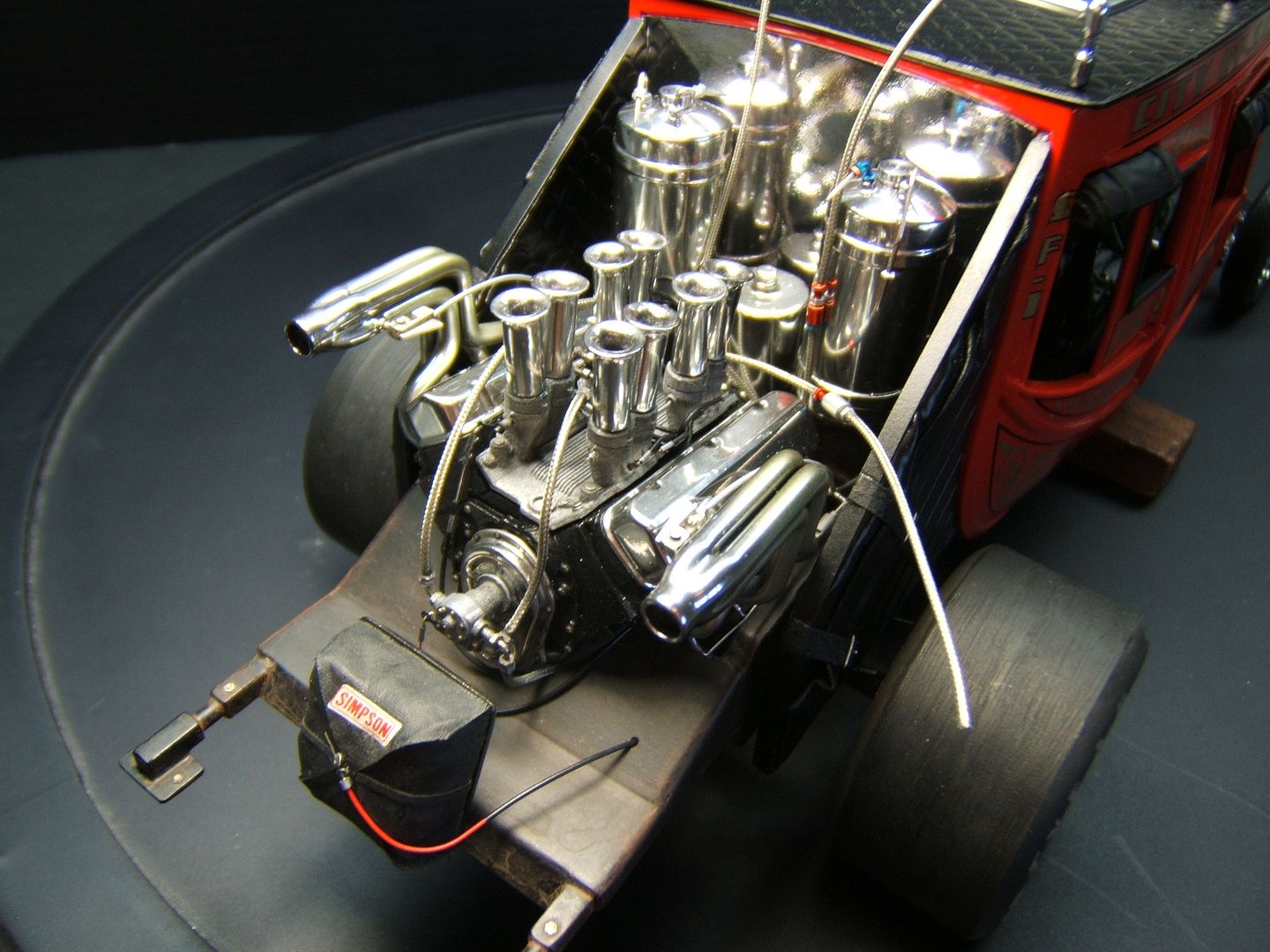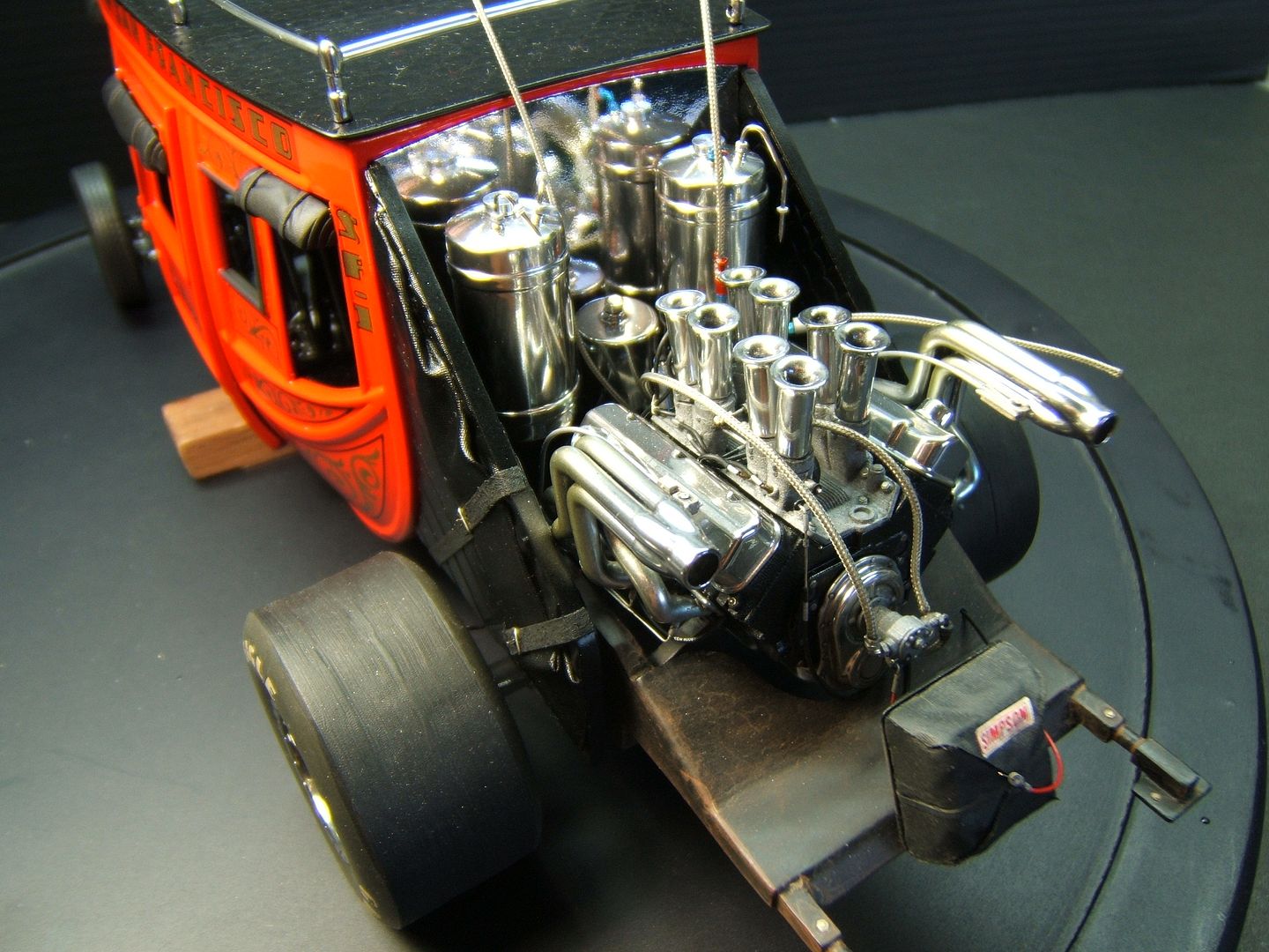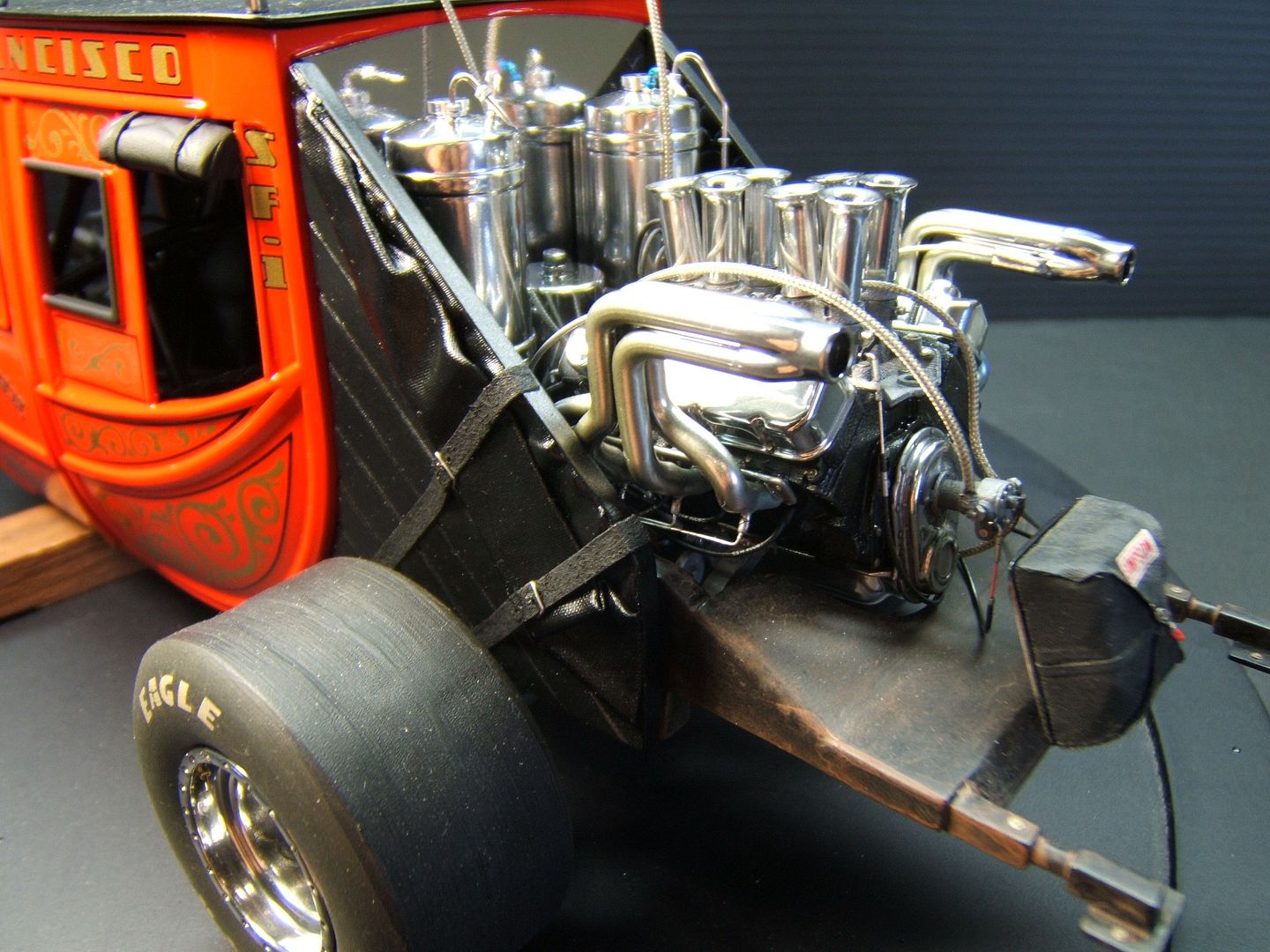 John Teresi Posted September 25, 2015 Author Posted September 25, 2015 Hello......Chris,Clayton.Anton........thank you very much for the kind coments.....I really do apprciate them..........the body is finished......I attached the parachute,shut off valve cable, throtte cable .......I made some fuel filters and attached the braided line from "Pro Tech"......I also made some ignightors for the headers that make the flames shoot out the headers.......I just need to add the front of the Coach and the front seat bench......thanks for looking.