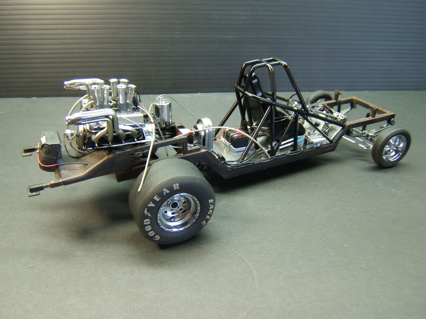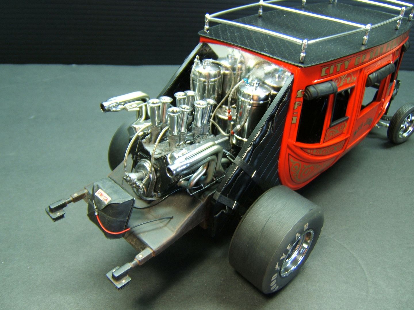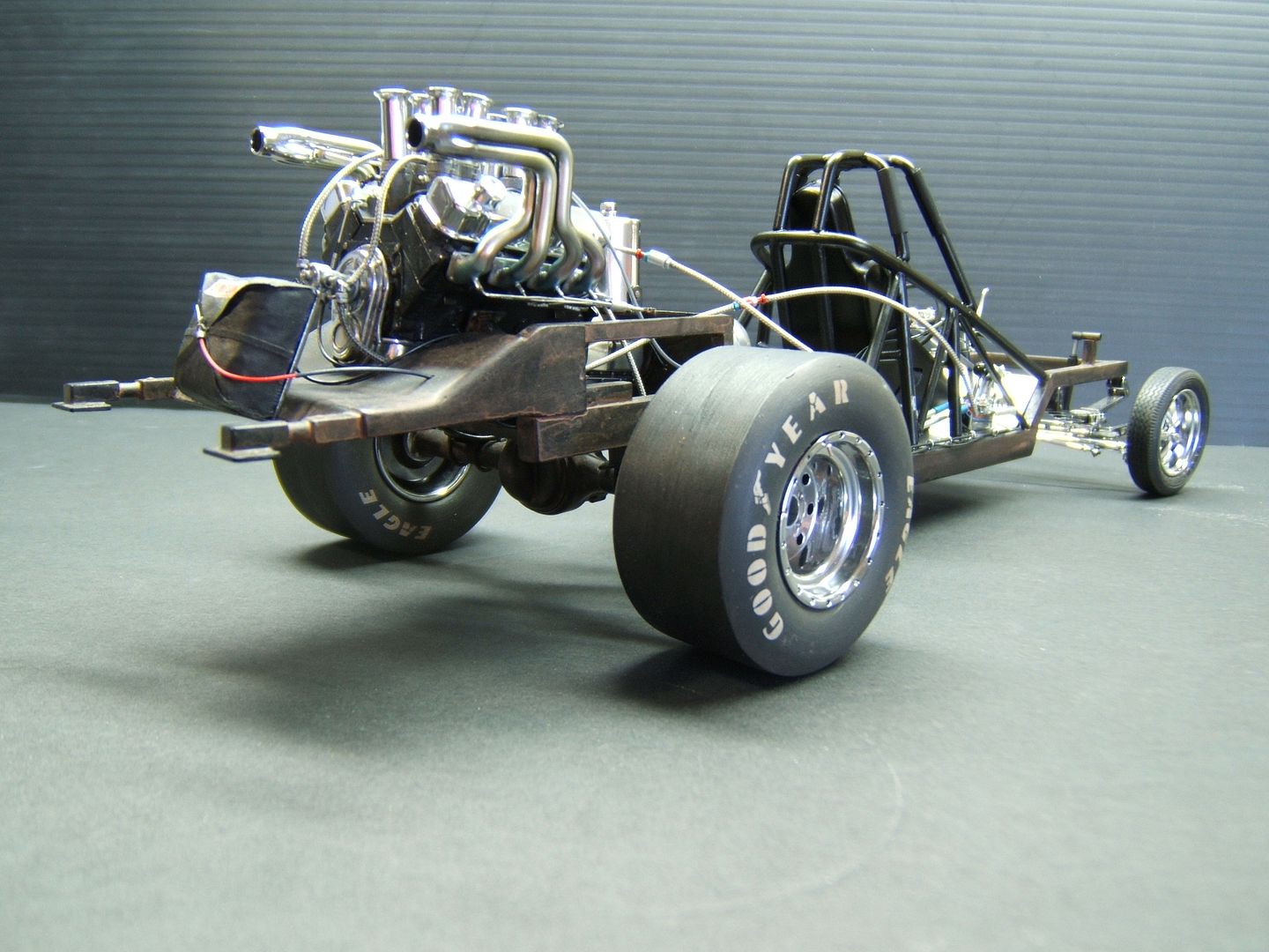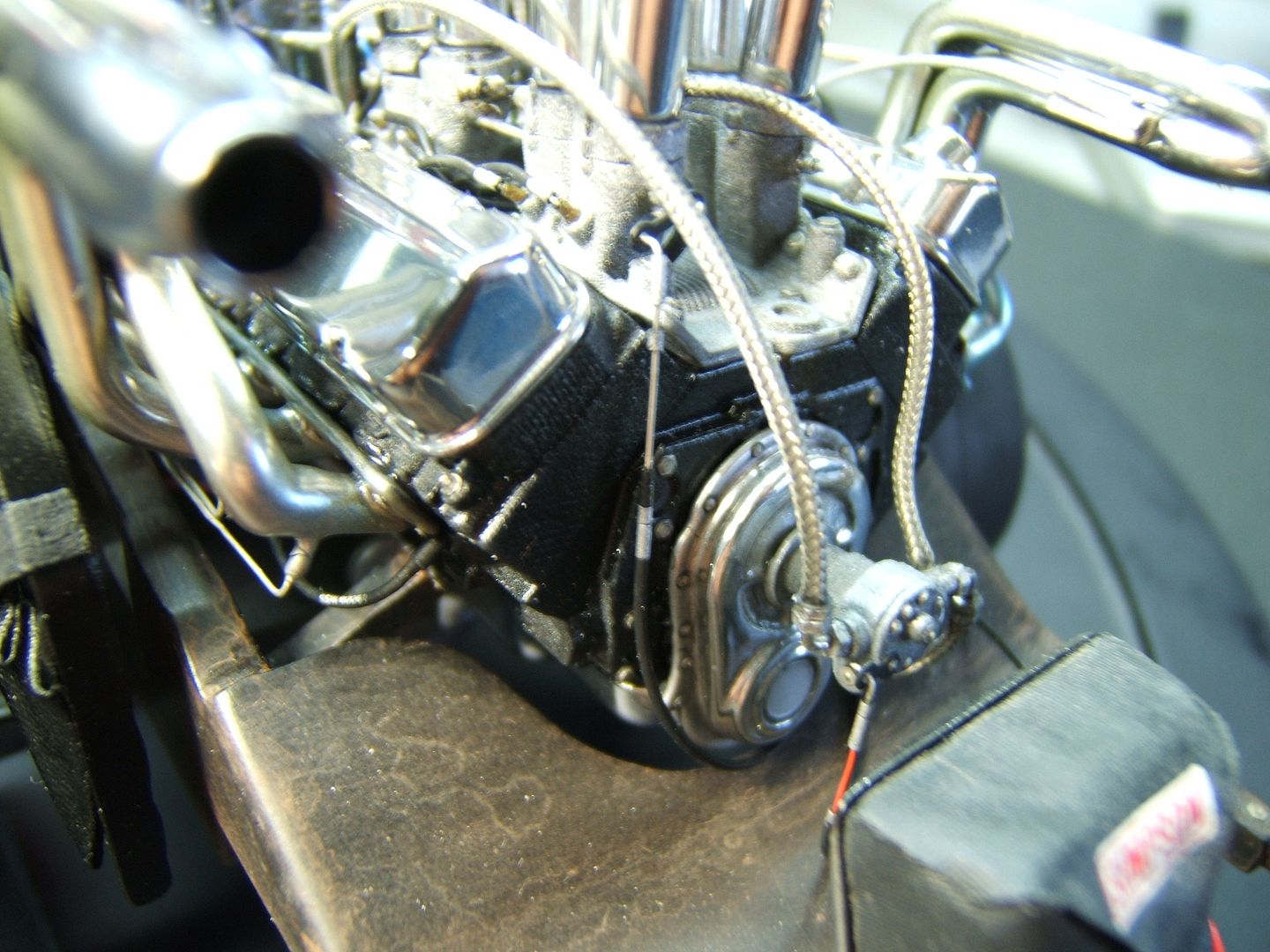 John Teresi Posted September 25, 2015 Author Posted September 25, 2015 Hello......Chris,Clayton.Anton........thank you very much for the kind coments.....I really do apprciate them..........the body is finished......I attached the parachute,shut off valve cable, throtte cable .......I made some fuel filters and attached the braided line from "Pro Tech"......I also made some ignightors for the headers that make the flames shoot out the headers.......I just need to add the front of the Coach and the front seat bench......thanks for looking.